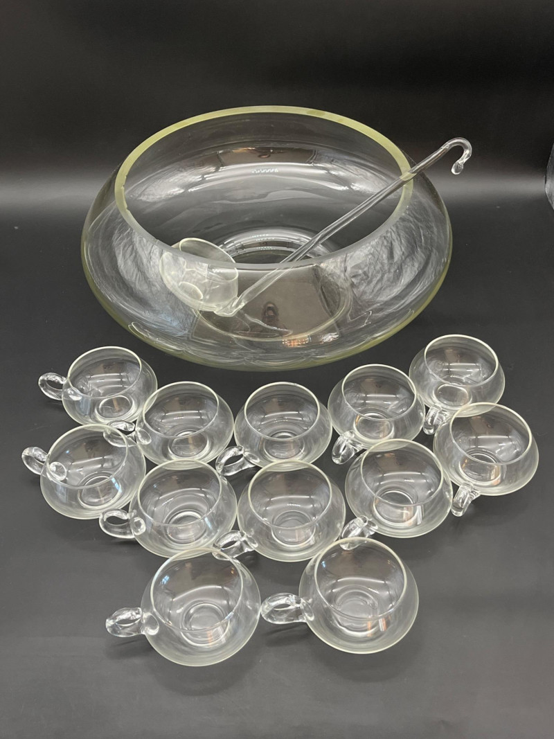 Lot # 13 - Riekes Crisa Moderno Mid-Century Glass Punch Bowl with 12 Cups & Ladle Starting Bid: $ 5.00 Bids: This sale will end in: |