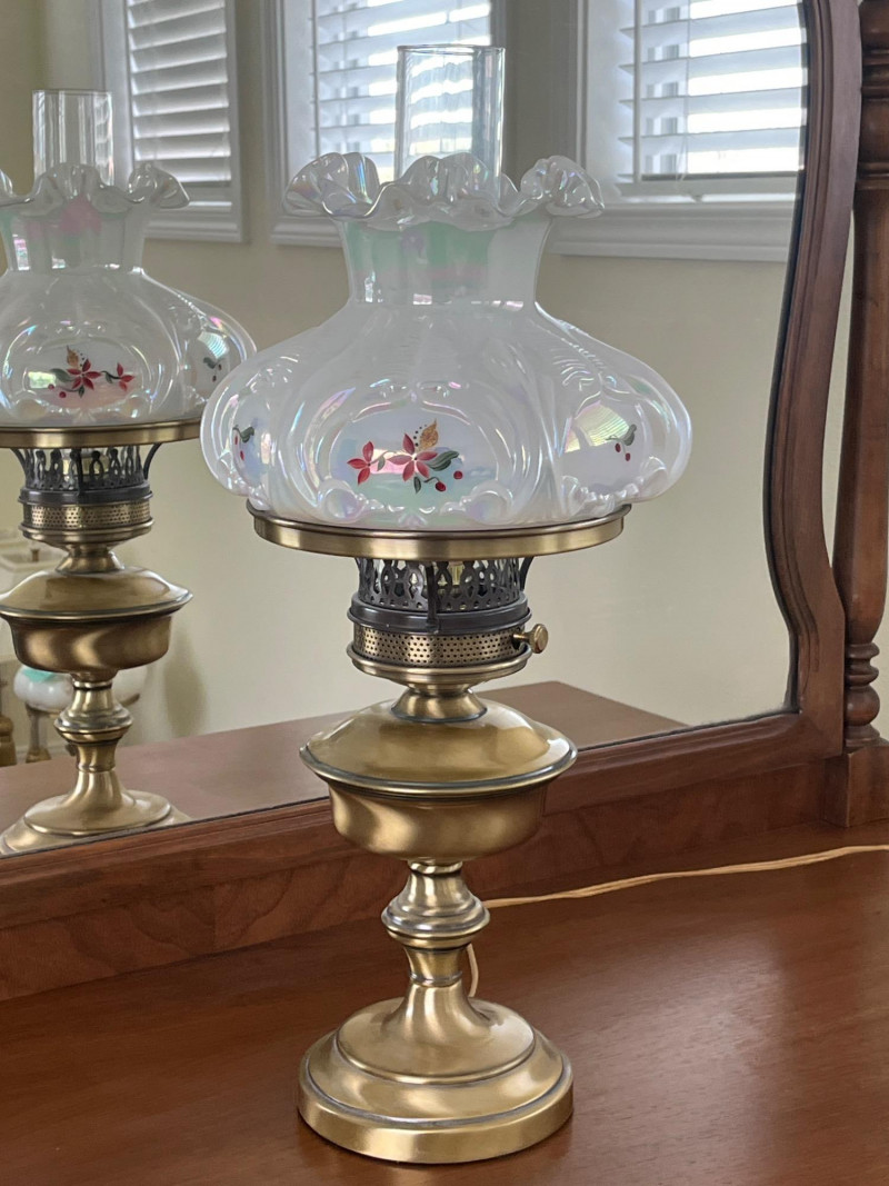 Lot # 51 - Fenton Hand Painted Iridescent Shade Hurricane Lamp Signed by Artist Starting Bid: $ 5.00 Bids: Bidding starts in: |