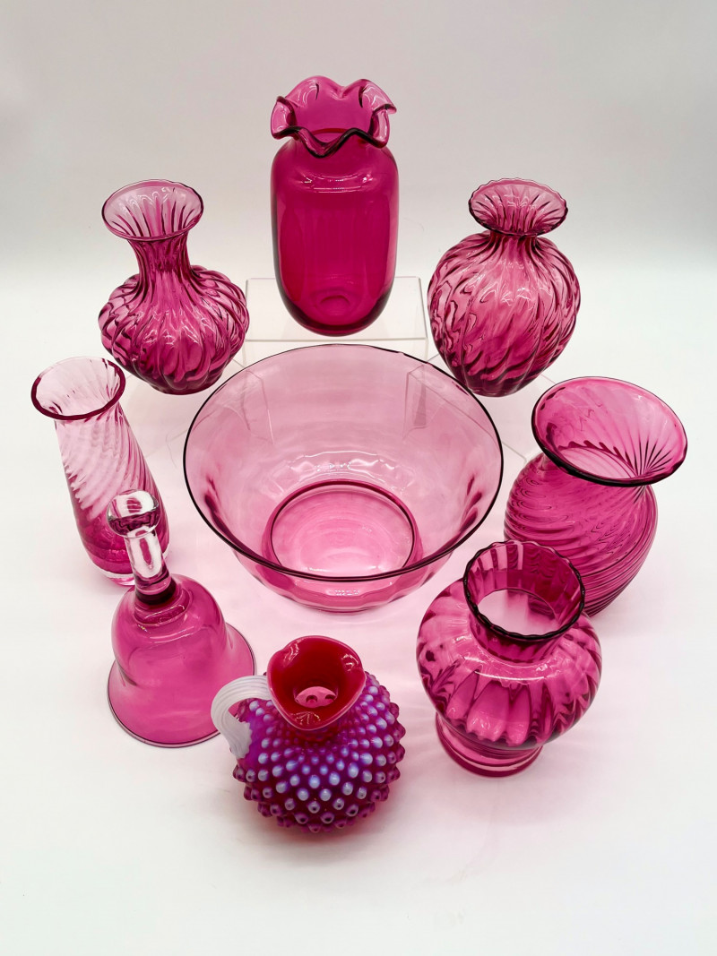 Lot # 28 - Cranberry Glass Lot Featuring Fenton Small Opalescent Hobnail Pitcher Starting Bid: $ 5.00 Bids: Bidding starts in: |