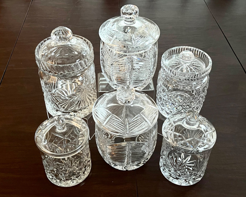 Lot # 128 - Set of 6 Lead Crystal Biscuit Jars Starting Bid: $ 5.00 Bids: Bidding starts in: |