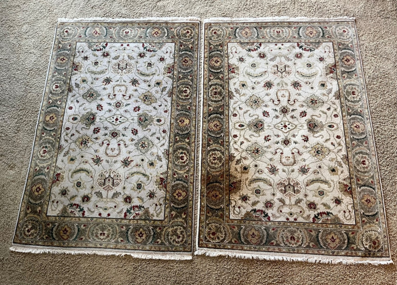 Lot # 153 - Two 4'1" x 6'1" Hand Knotted Wool Rugs with Pads NEEDS CLEANING Starting Bid: $ 5.00 Bids: Bidding starts in: |