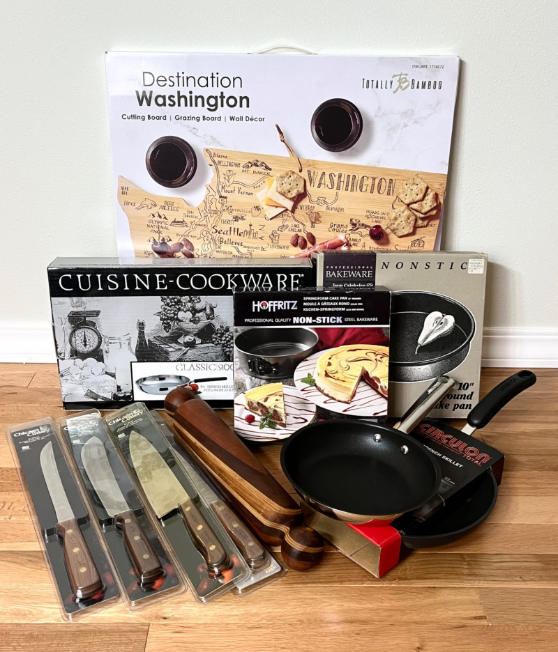- Name brand goods new and still in their packaging such as CuisinArt, Calphalon, Revere Ware, Waterford, and Mikasa