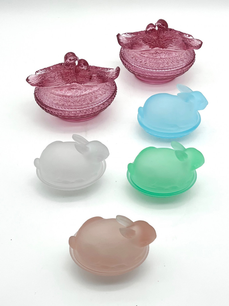 Lot # 161 - 2 Viking Glass Birds on Nests & 4 Indiana Glass Satin Bunnies on Nests Starting Bid: $ 5.00 Bids: Bidding starts in: |