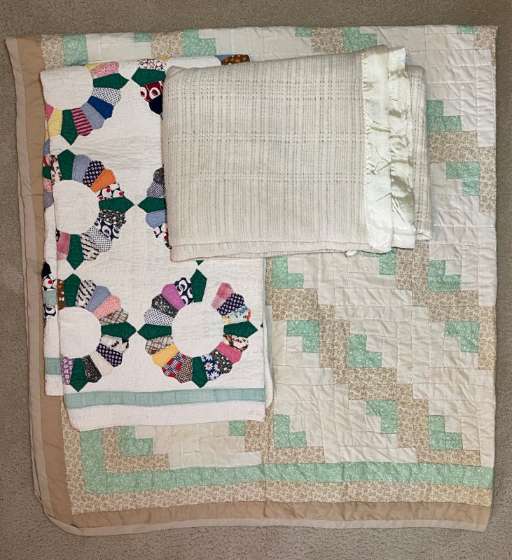 Lot # 133 - Quilts and Vintage Satin Lined Waffle Weave Blanket Starting Bid: $ 5.00 Bids: This sale will end in: |