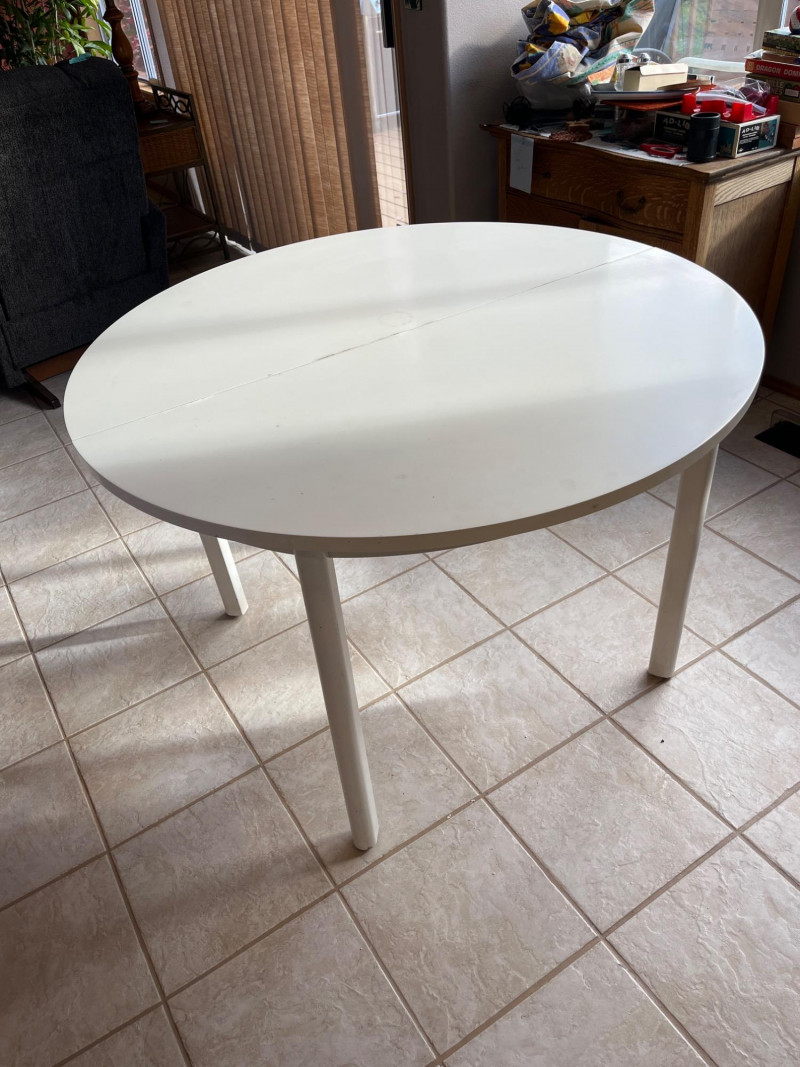 Lot # 118 - 43" Round White Formica Table with Two Extension Leaves Table Starting Bid: $ 5.00 Bids: This sale will end in: |