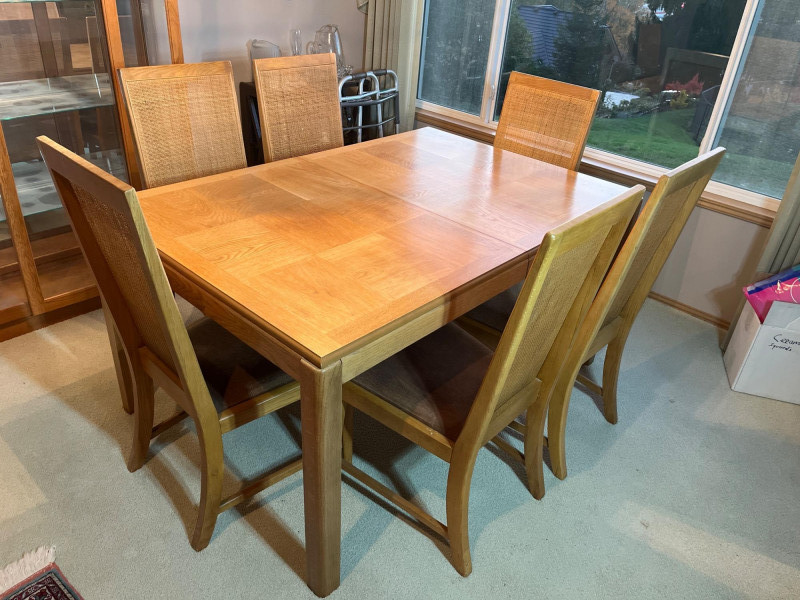 Lot # 122 - Oak Formal Dining Table w/ 6 Cane Backed Chairs & 2 Leaf Extensions Starting Bid: $ 5.00 Bids: This sale will end in: |
