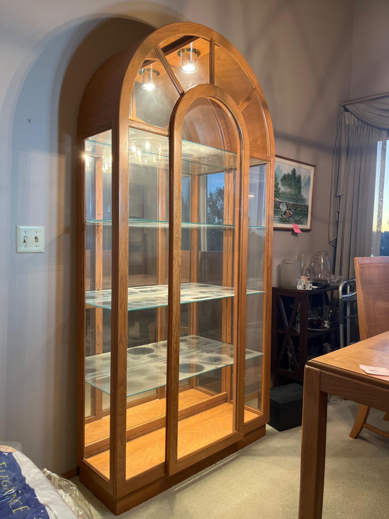 Lot # 127 - Glass Lighted Oak Curio Cabinet with Four Glass Shelves Starting Bid: $ 5.00 Bids: This sale will end in: |