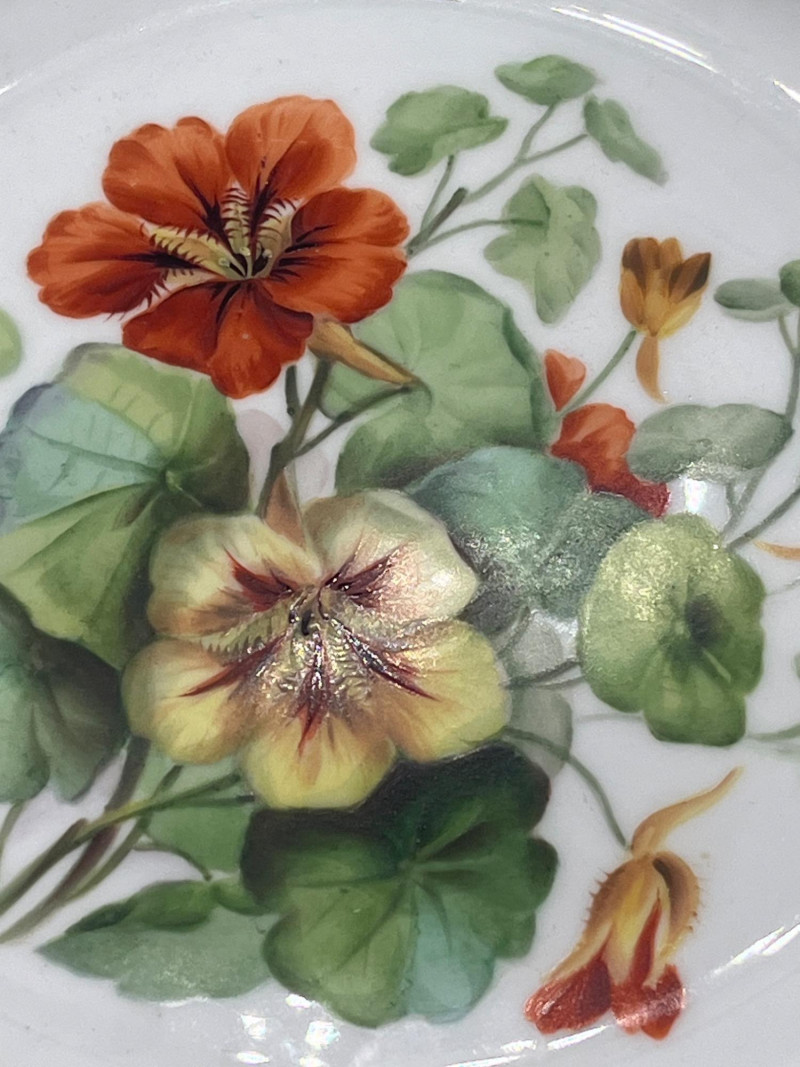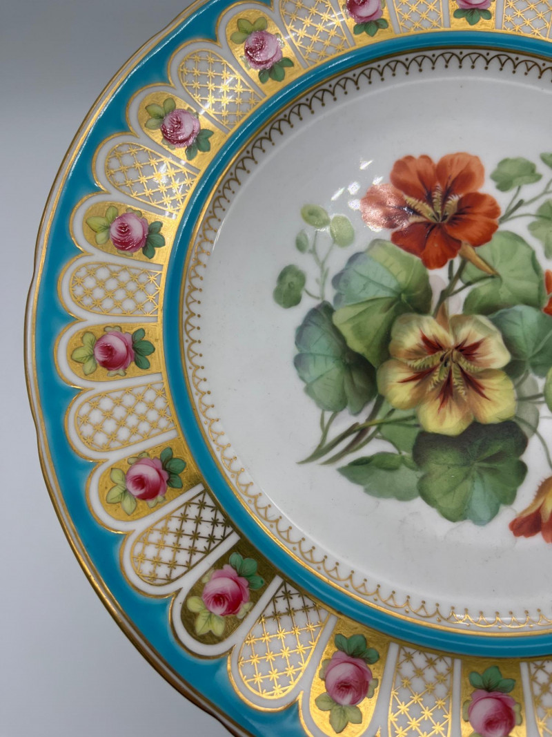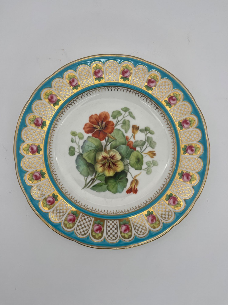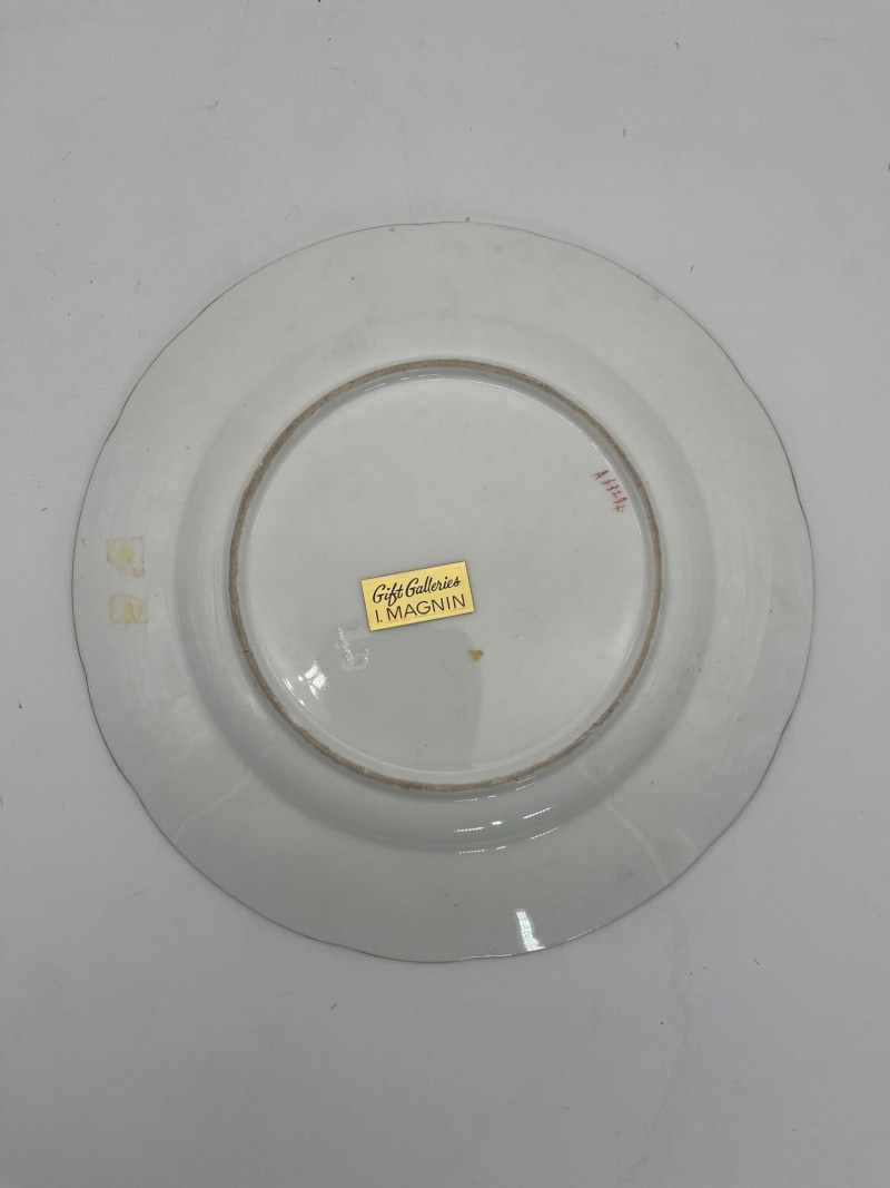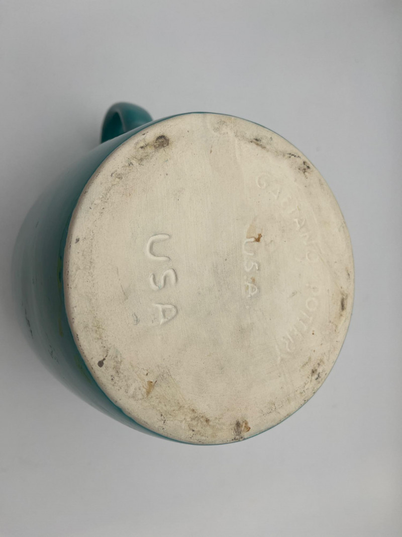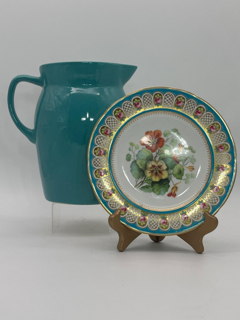Turquoise Gaetano Pottery Pitcher & Minton Plate for I. Magnin Stores The bone china plate is made by Minton specifically for the prestigious department store chain, I. Magnin which closed in the 1990's after being purchased by the Macy's Company. The plate's rim features a detailed gold gilding while the center of the plate steals the show with vibrant, hand-painted nasturtium flowers. The pitcher is the same turquoise color as the accent color of the plate's rim. The rim of the pitcher has two very small chips in the finish that can be seen in photos. Plate is 9" and pitcher is 9.5" tall.