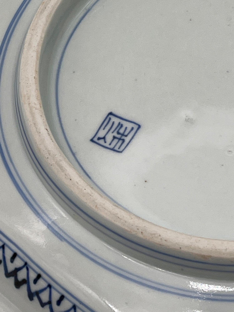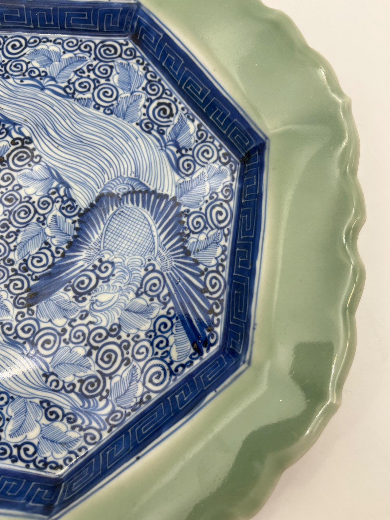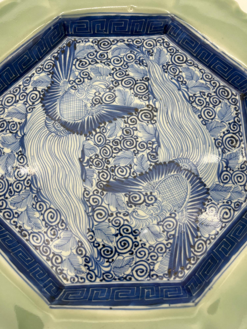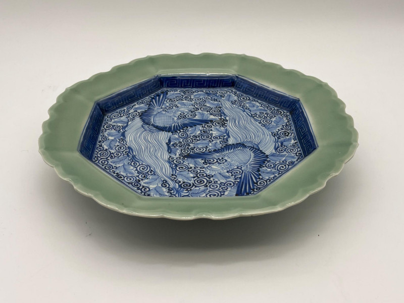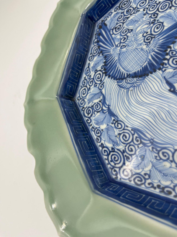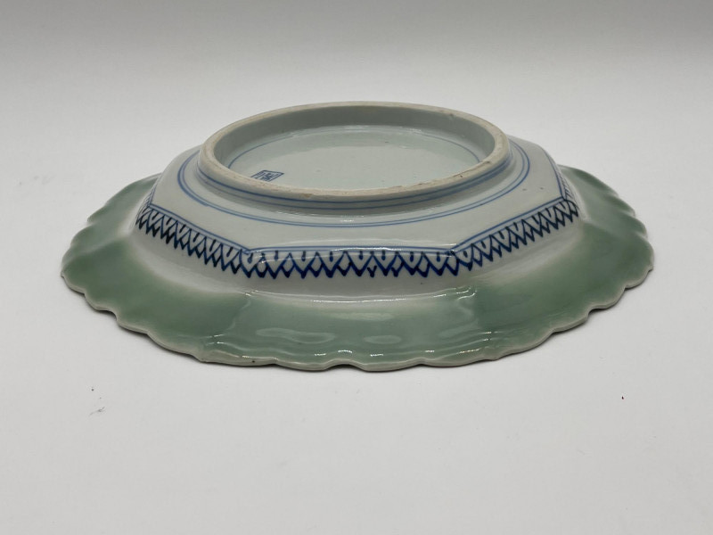 Antique Hand Painted Japanese Celadon Imari Shallow Dish / Plate Celadon and blue and white shallow dish measuring 12" across. The rim is in a celadon glaze while the center is blue and white Imari styled. This is a very unique piece likely from the Meiji period (late 19th-early 20th century).