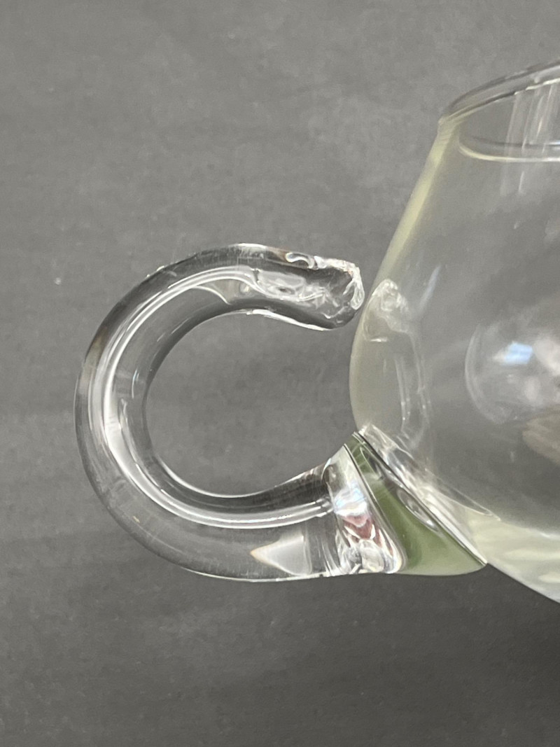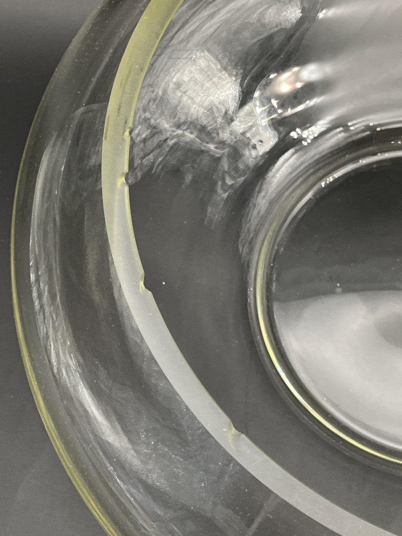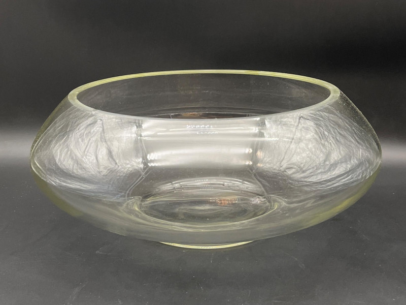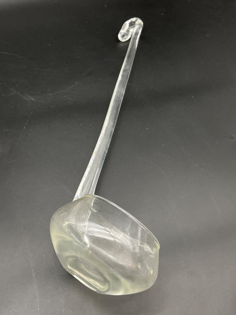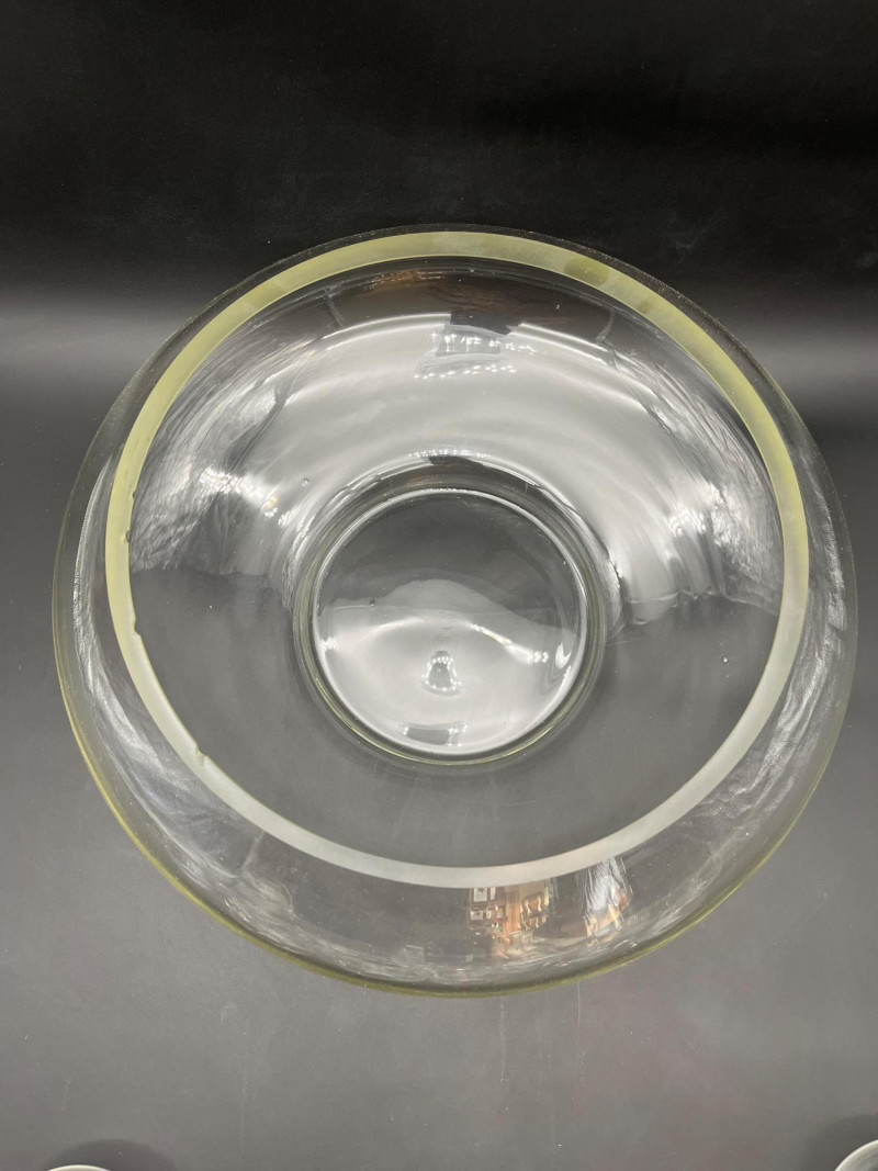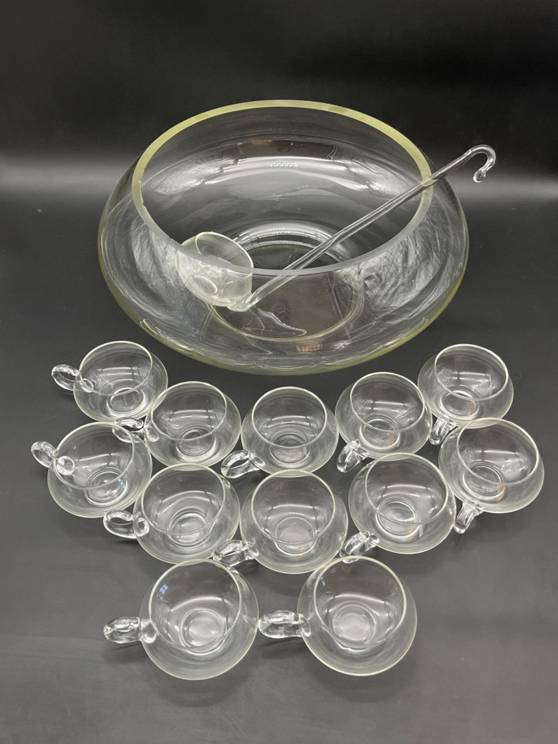 Riekes Crisa Moderno Mid-Century Glass Punch Bowl with 12 Cups and Ladle The Vintage MCM Moderno Hand-Blown Glassware 14-Piece Punch Bowl Set, crafted by Riekes Crisa, is a mesmerizing and one-of-a-kind collection that elevates any entertaining occasion. This meticulously designed set includes a generously sized clear punch bowl, skillfully hand-blown from high-quality glass, which showcases the elegant lines and contours typical of Mid-Century Modern aesthetics. In addition to the eye-catching punch bowl, the set includes 12 matching cups and ladle, all of which are carefully designed to complement the bowl beautifully. Note: there are some small chips on the inside rim of the bowl which I show clearly in photos.