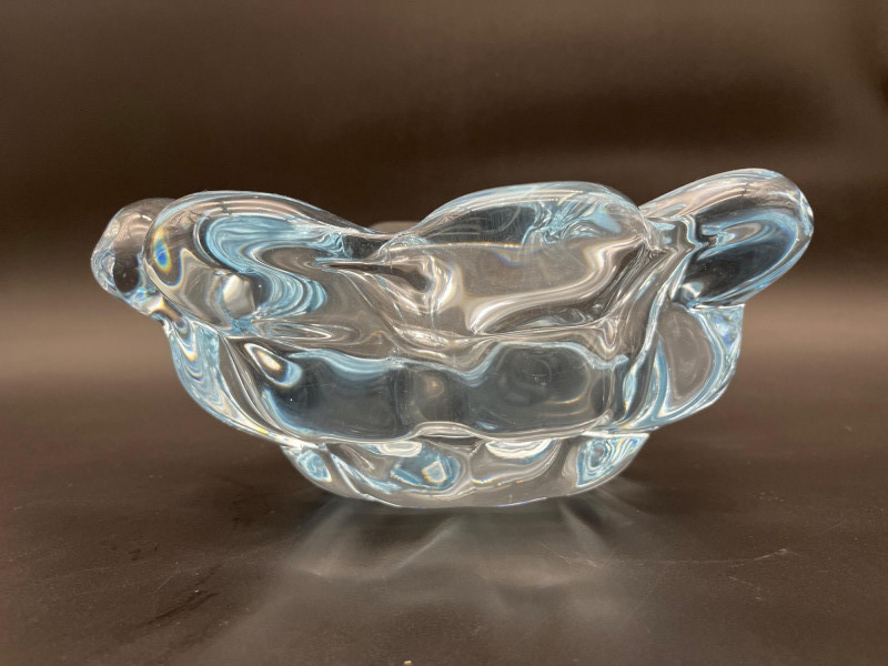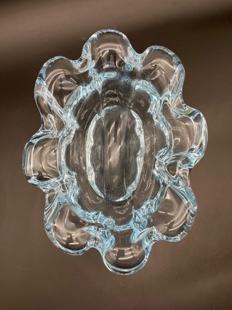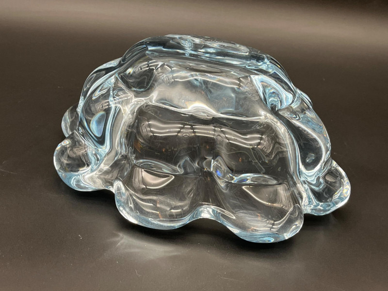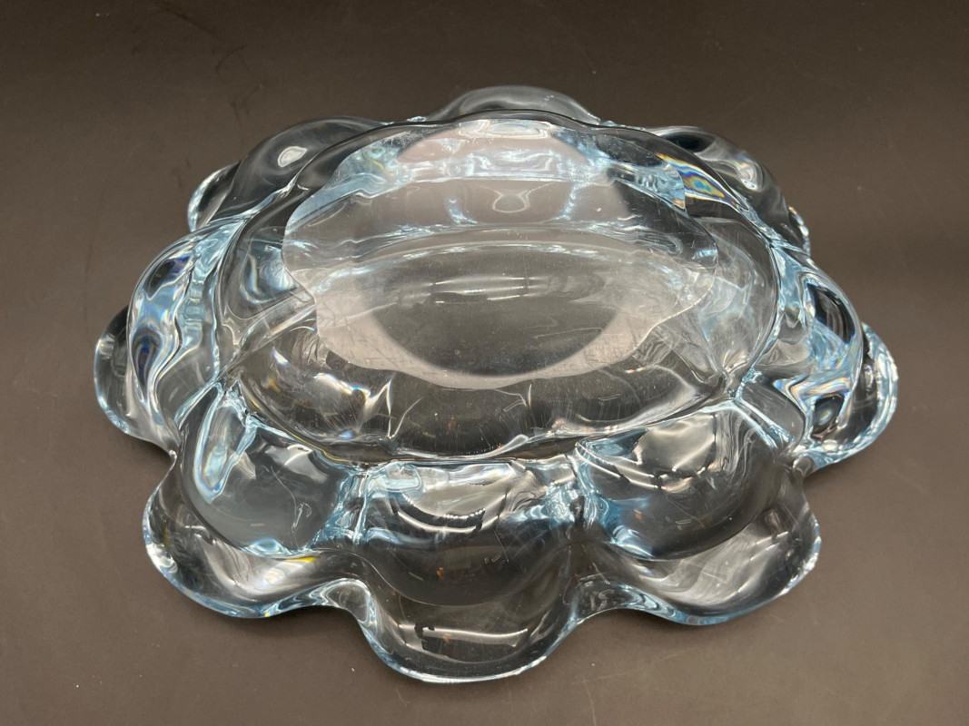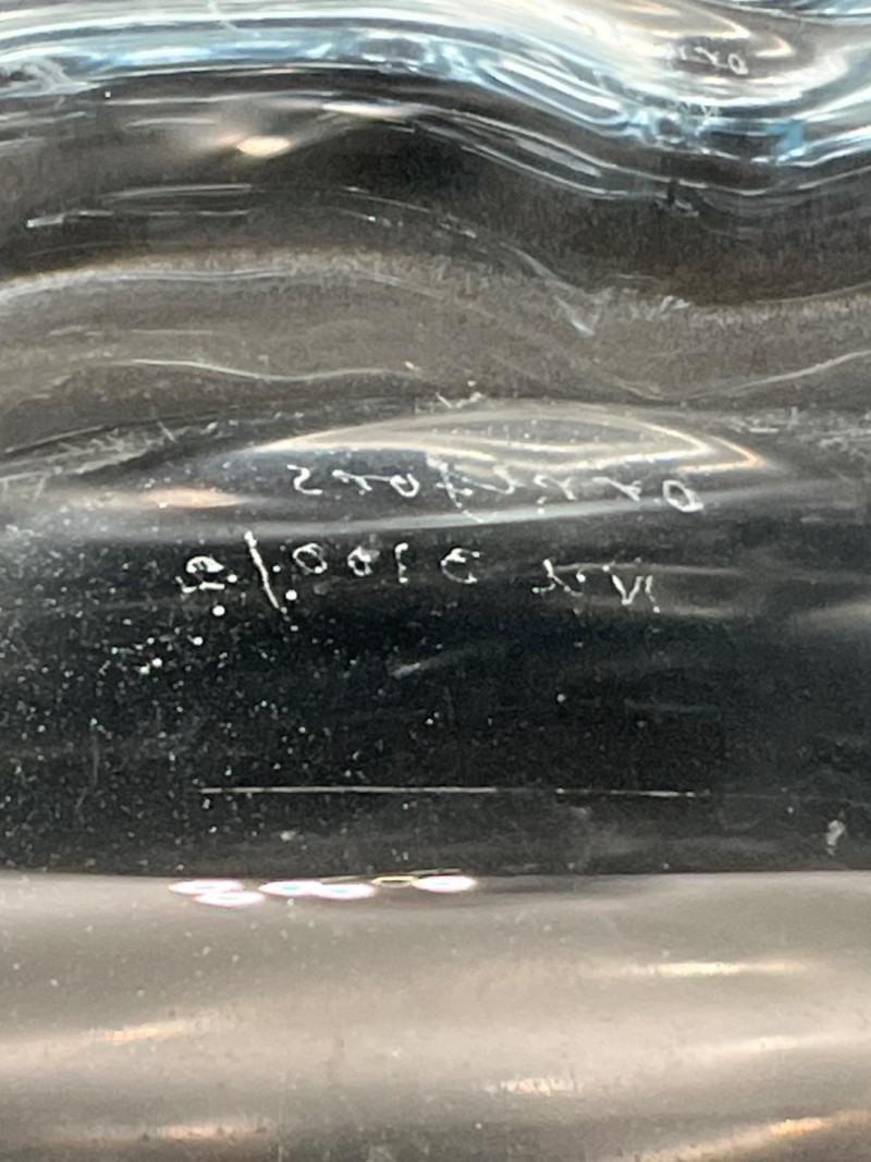 Orrefors Ice Blue Nils Landberg Bowl # NU 3100/2 Orrefors has a numbering system that helps date and identify the pattern of pieces. For this piece, the N stands for Nils Landberg, U stands for uncut meaning that this is formed and polished without any etching or cut pattern. The 3100 is the pattern manufacturing number which dates this piece to the late 1940's. The 2 after the slash is likely a color code as this pattern came in this blue and clear. The condition of this piece is very good with very minimal signs of wear. The bowl measures 10" long, 7" wide, 4.5" Tall