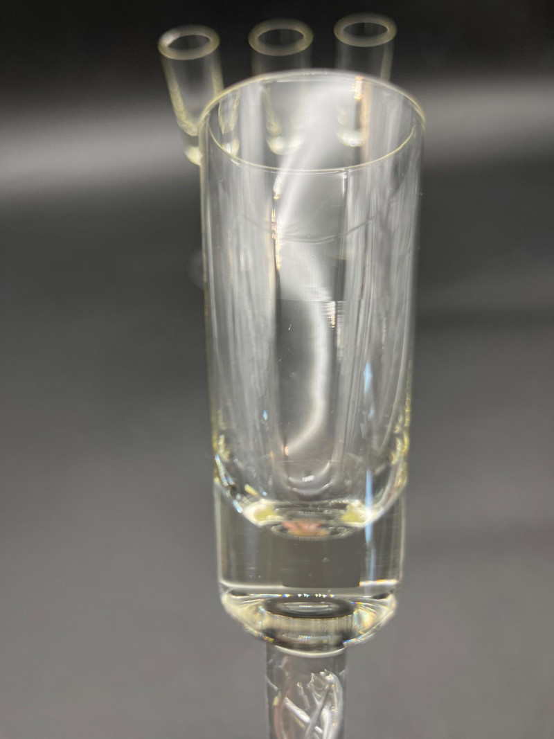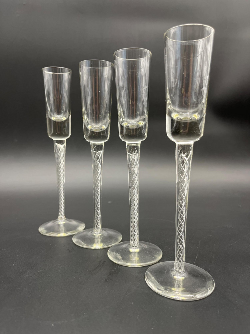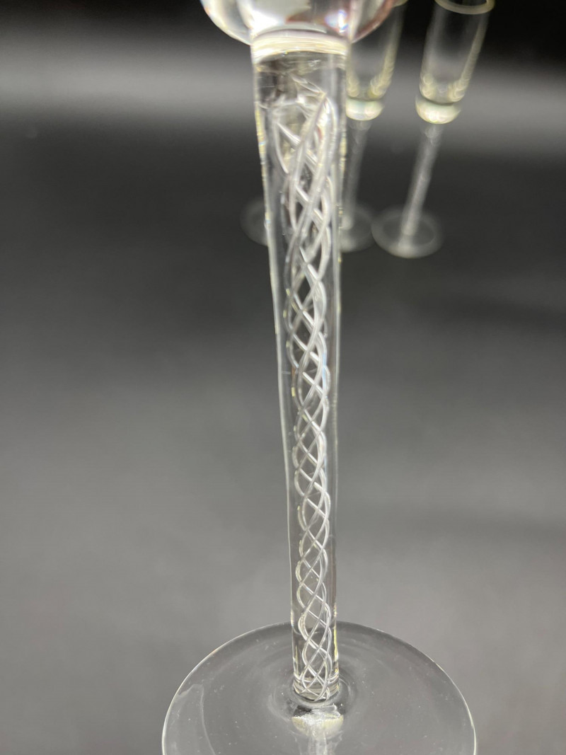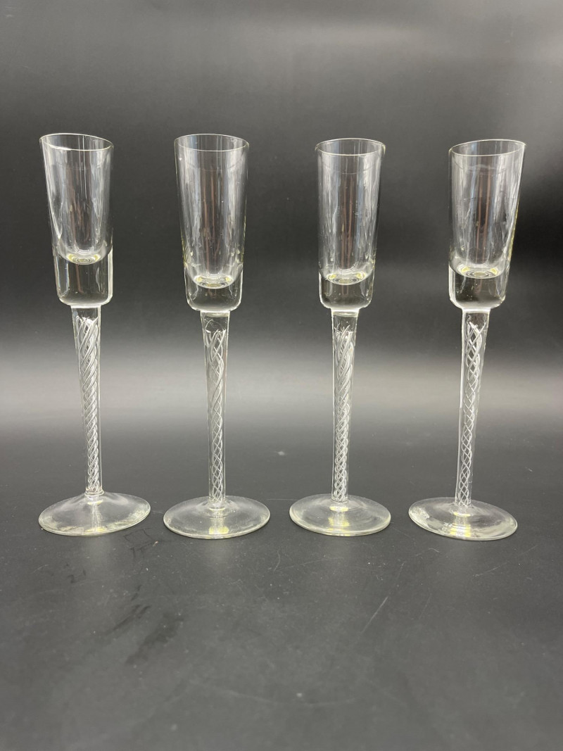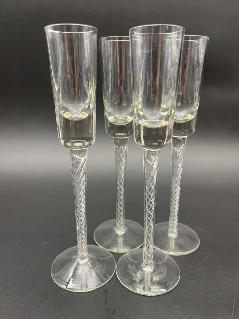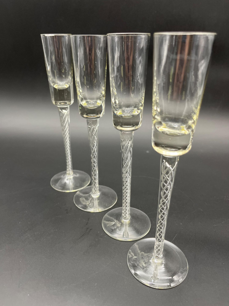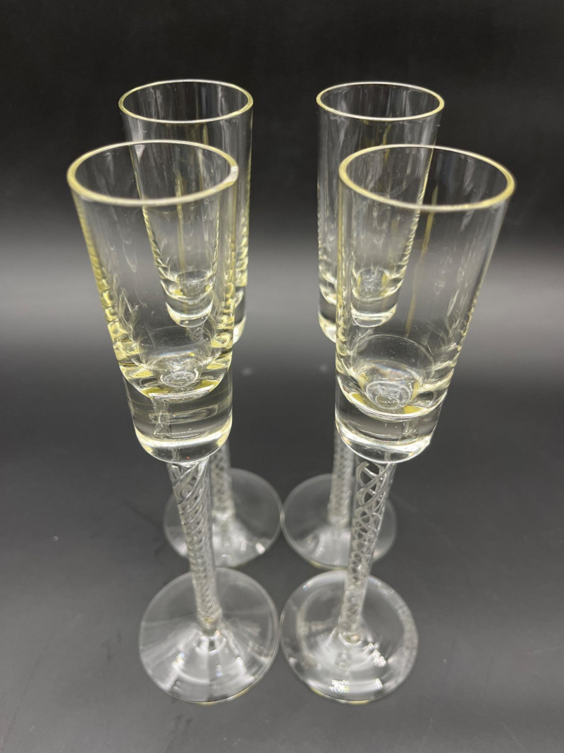 Set of 4 Mid-Century Bohemia Glass Crystalex Air Twist Cordials Air twist glass was first invented in England during the Georgian period (early 1700's) but fell out of popularity due to the complex skill required to create this effect. Still to this day, this effect is not easily recreated by any way other than highly skilled glass blowers. These glasses are in very good condition with no cracks, chips or signs of wear and stand at 7 5/8" tall. I have also seen these used as tapered candle holders which is brilliant if you love this style but don't find much use for a wine glass that only holds about 2 ounces.