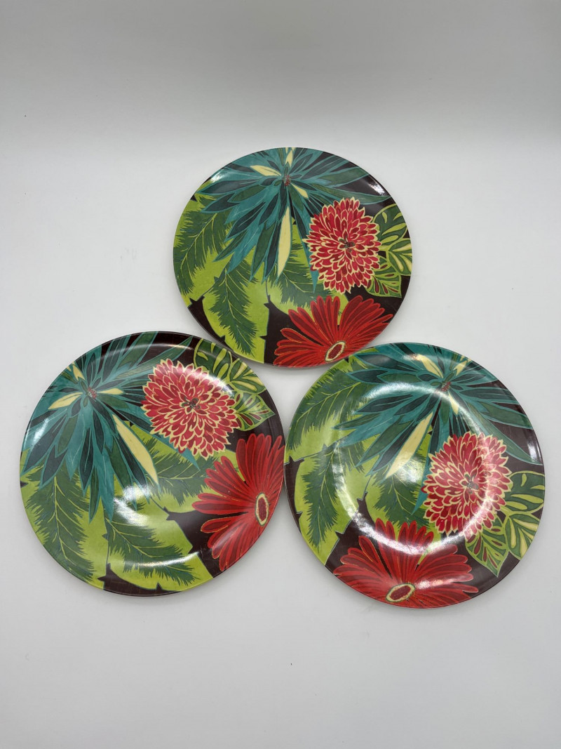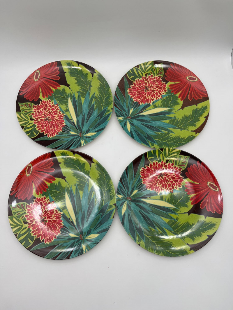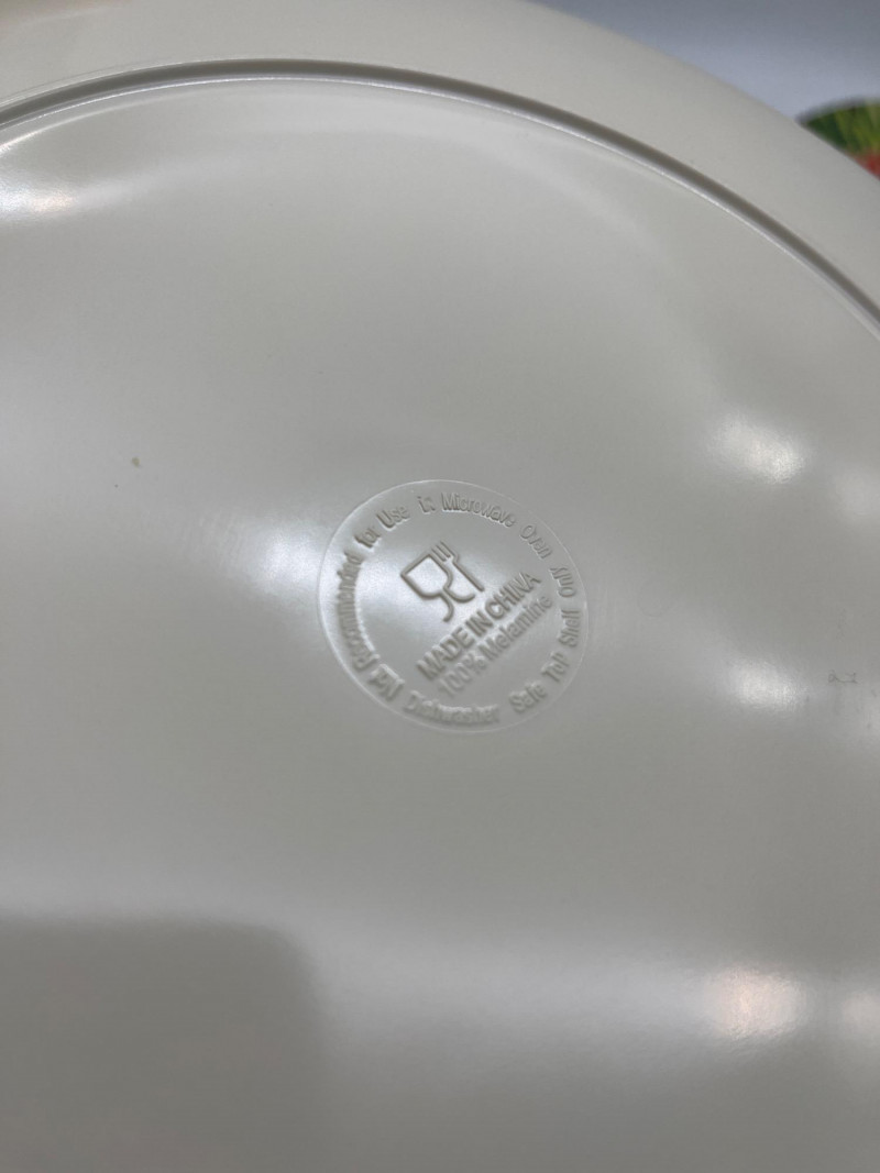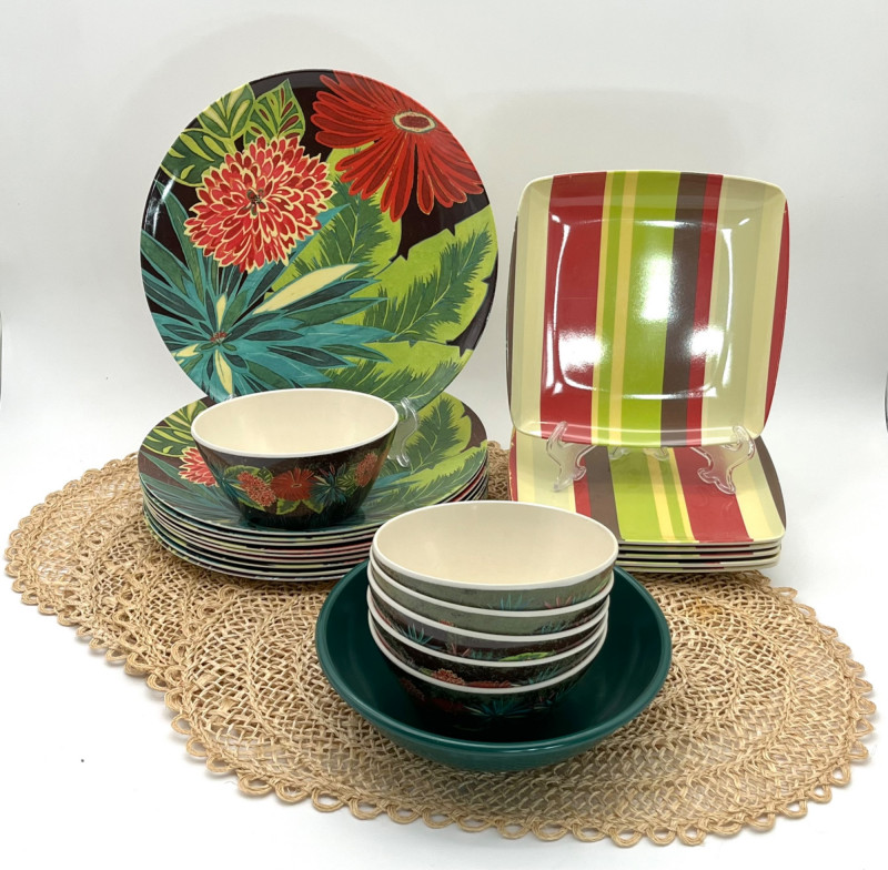 Tropical Themed Melamine Dish Set with Four Natural Fiber Place Mats Melamine is a plastic that is perfect because of it's durability, hot/cold resistance, and the fact that it is lightweight. I Great for outdoors, kids, and everyday use. This set includes 10 dinner plates, 6 cereal bowls, 6 square salad plates, and one serving bowl. The pattern design is worn on a few pieces but there are no chips or cracks in the melamine.