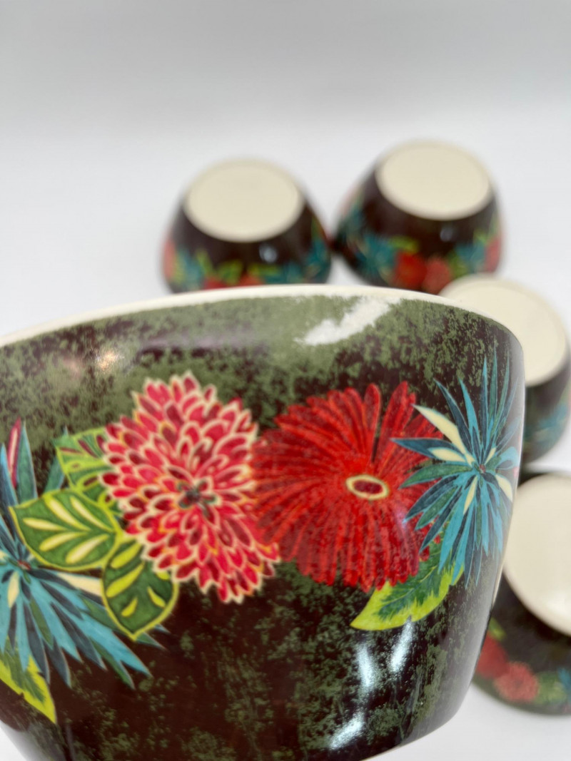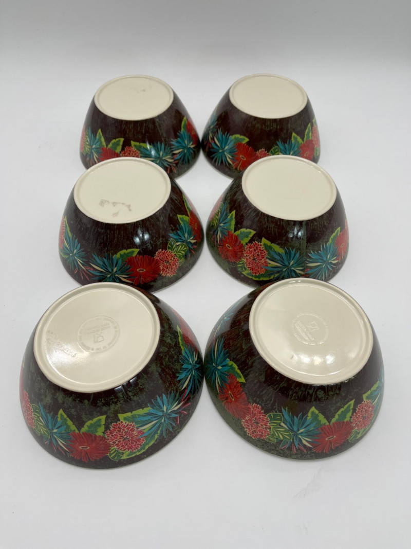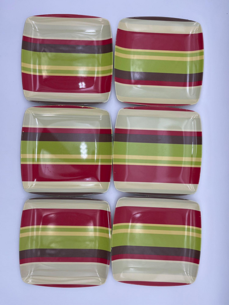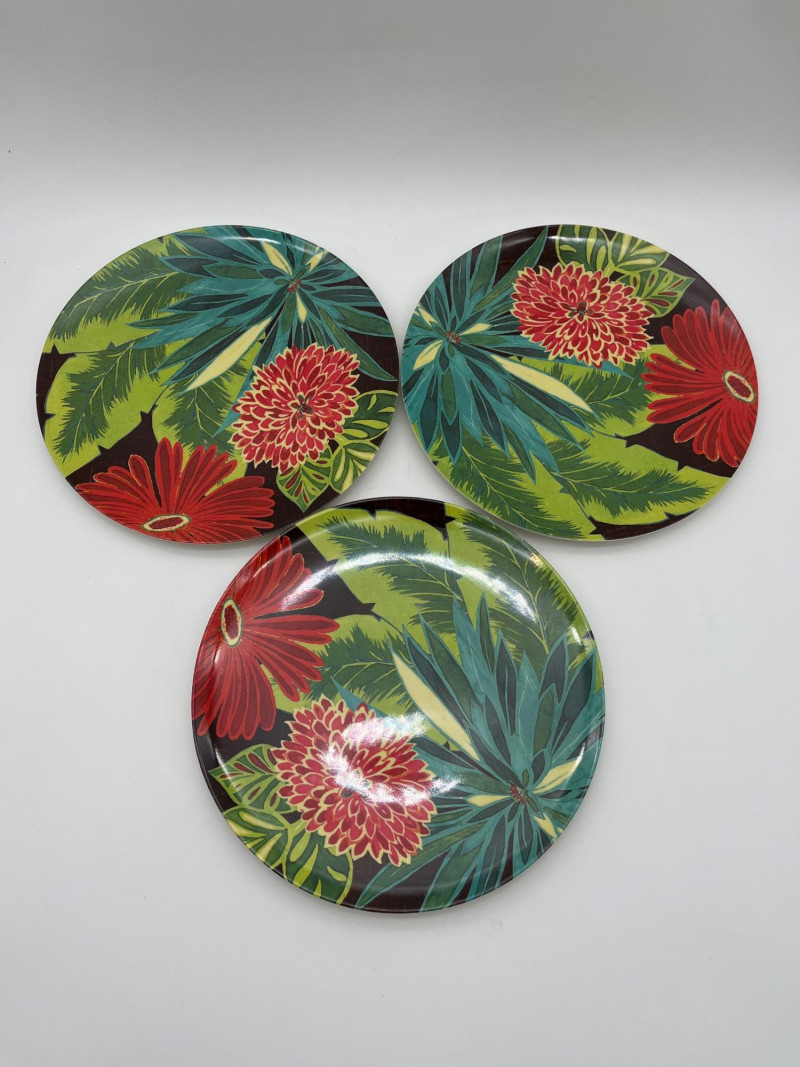 Tropical Themed Melamine Dish Set with Four Natural Fiber Place Mats Melamine is a plastic that is perfect because of it's durability, hot/cold resistance, and the fact that it is lightweight. I Great for outdoors, kids, and everyday use. This set includes 10 dinner plates, 6 cereal bowls, 6 square salad plates, and one serving bowl. The pattern design is worn on a few pieces but there are no chips or cracks in the melamine.