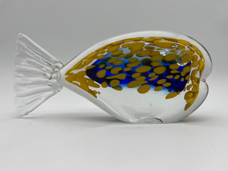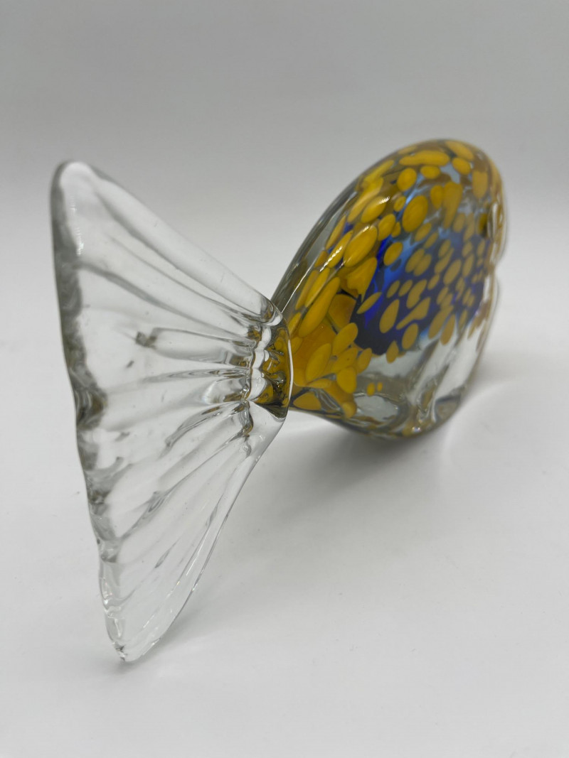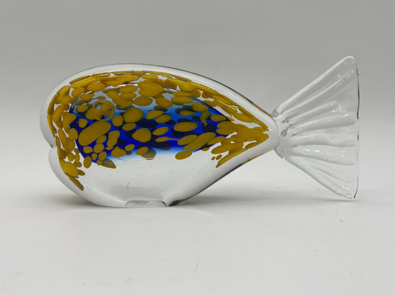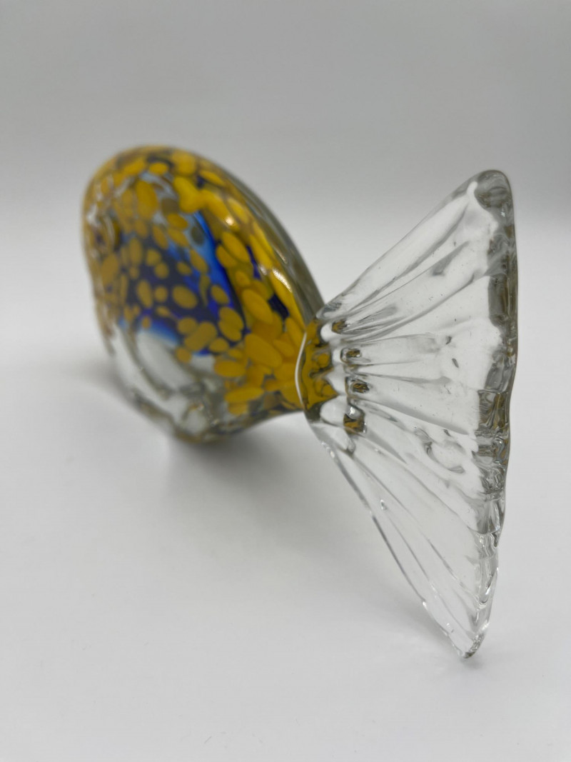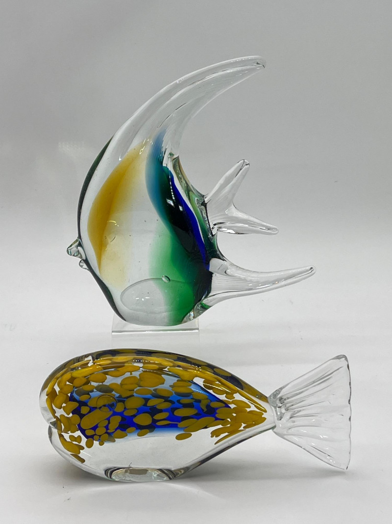 Large Art Glass Fish Pair The taller (Angel) fish has no markings but is in very nice condition. The shorter yellow and blue fish is an A. Jablonski piece from Poland and is also in very good vintage condition. Angel fish is 9" tall, the yellow and blue speckled fist is 4" tall.