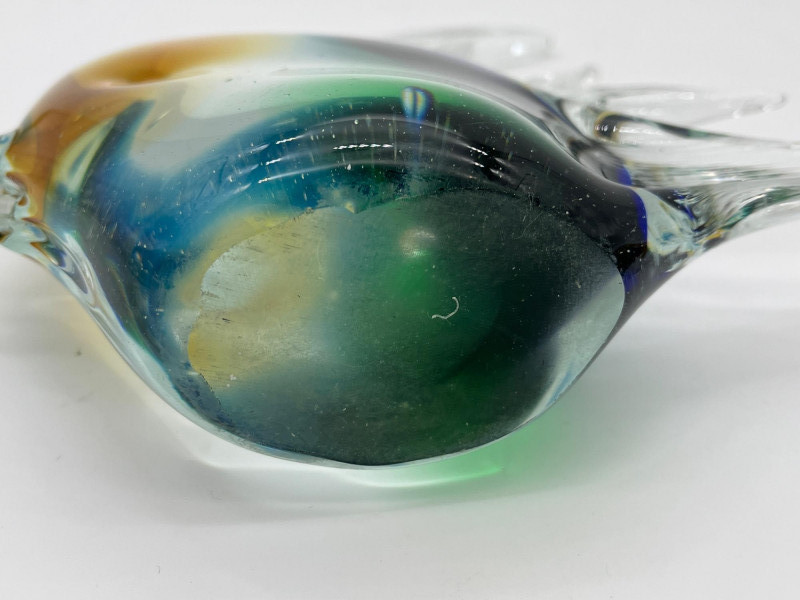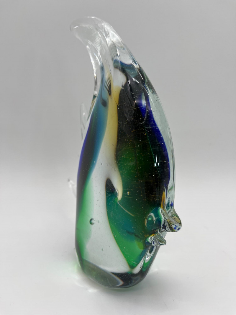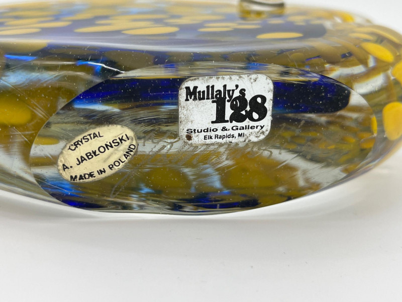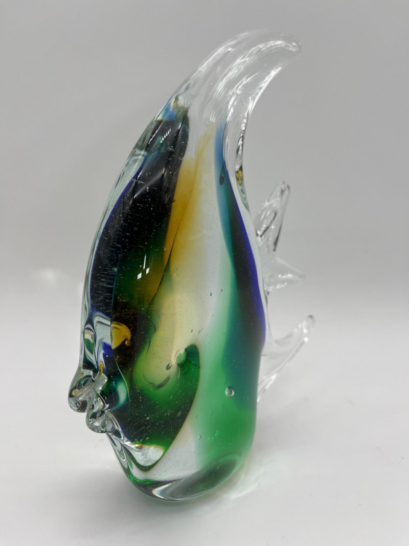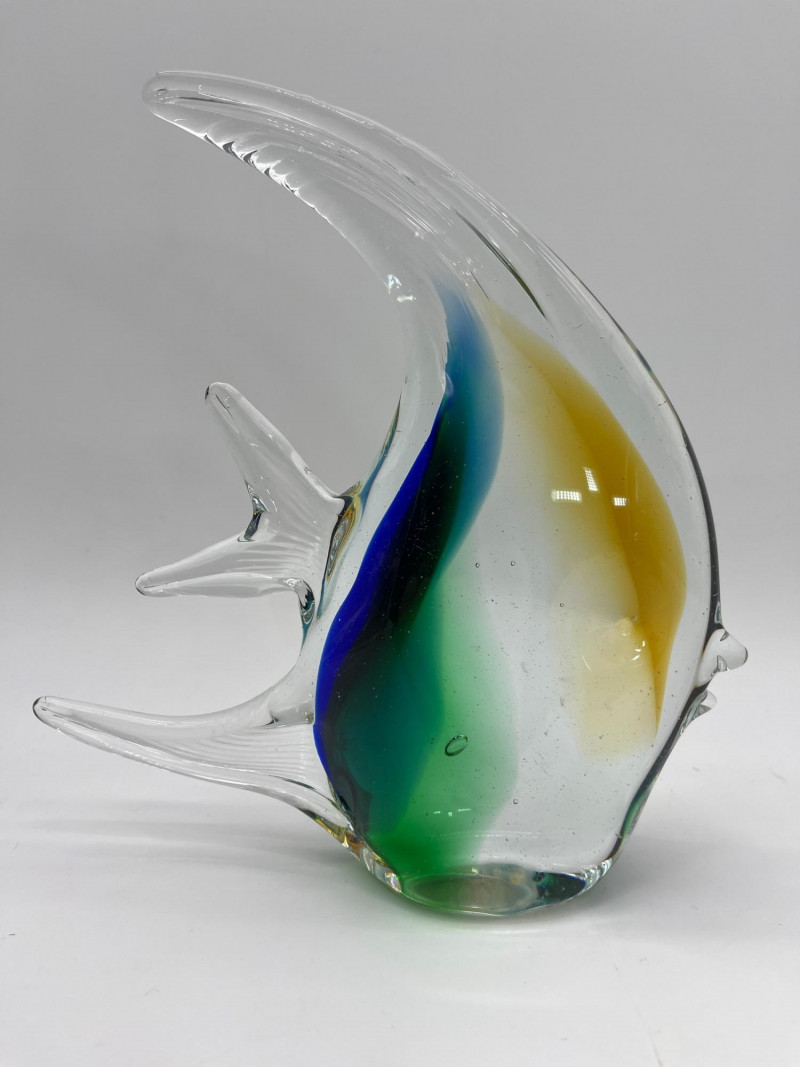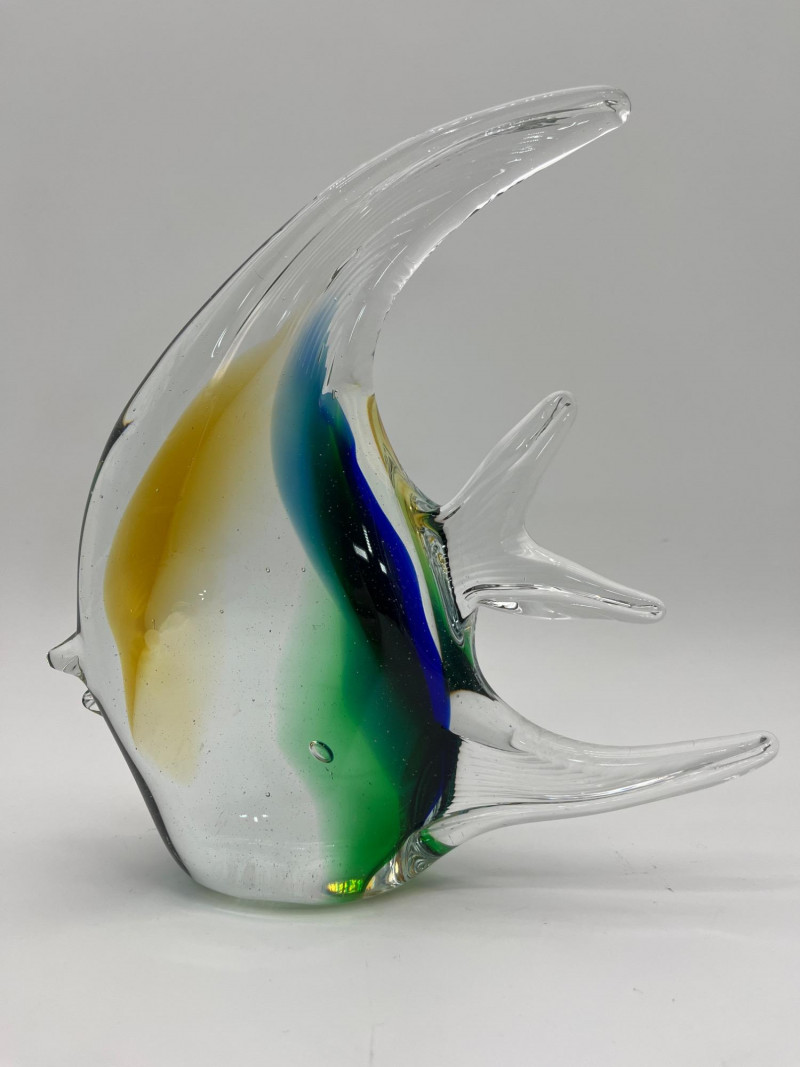 Large Art Glass Fish Pair The taller (Angel) fish has no markings but is in very nice condition. The shorter yellow and blue fish is an A. Jablonski piece from Poland and is also in very good vintage condition. Angel fish is 9" tall, the yellow and blue speckled fist is 4" tall.