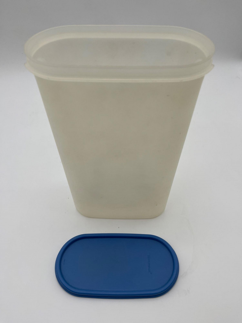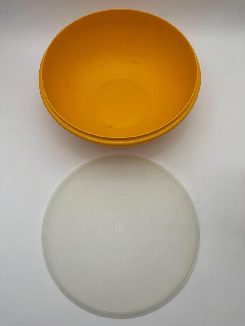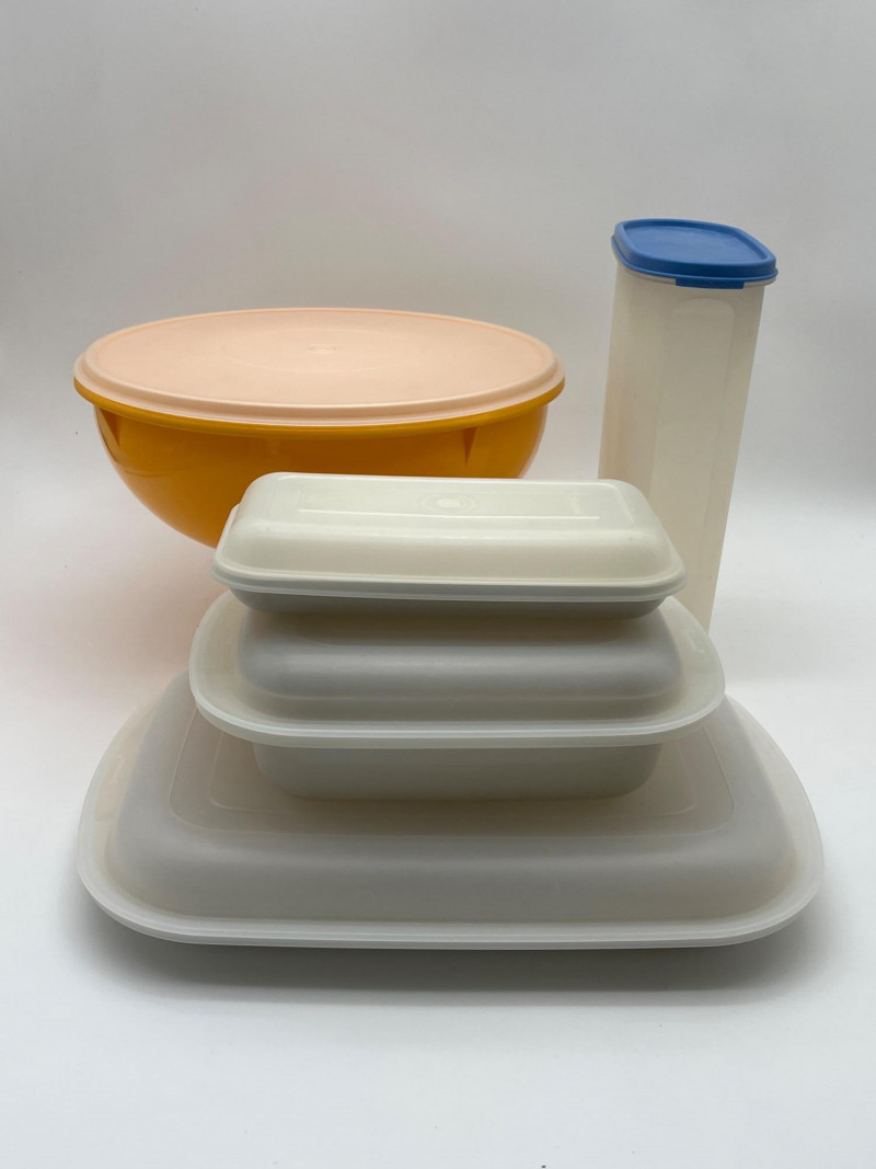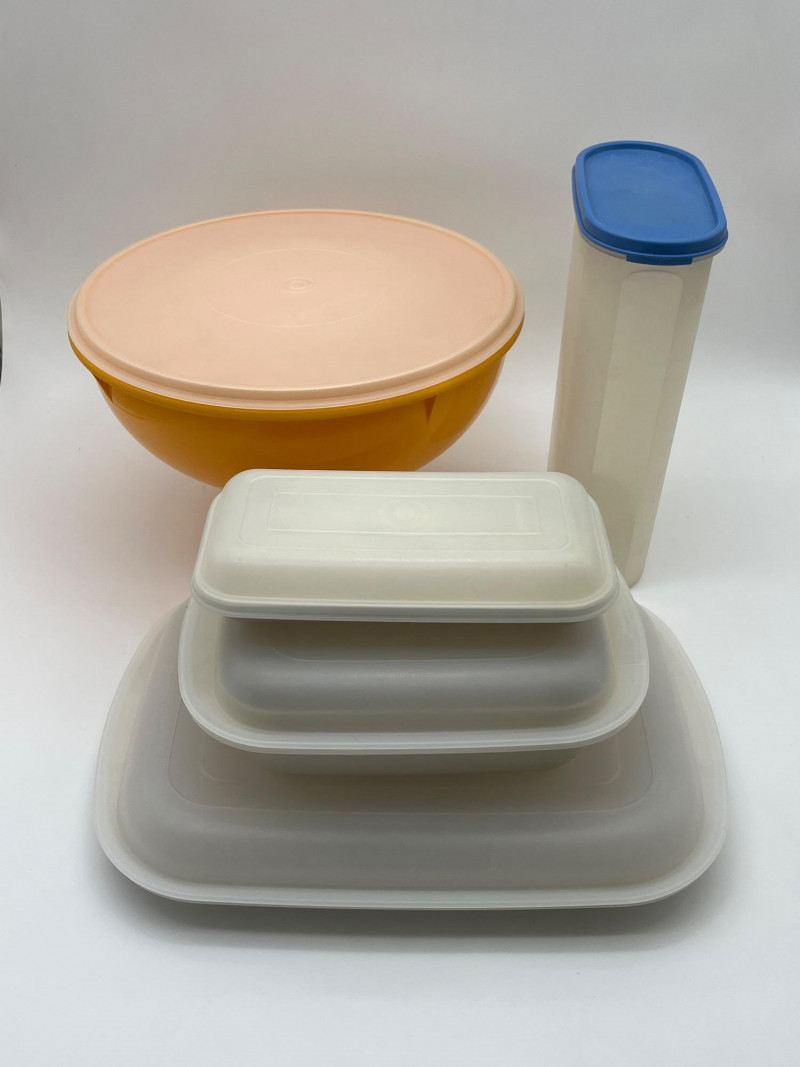 Vintage Tupperware Collection Tall container with blue lid is 11" tall, yellow bowl is 11" wide. The tan rectangle containers bases are microwave and oven safe.