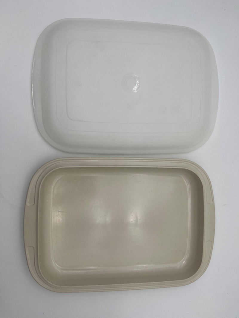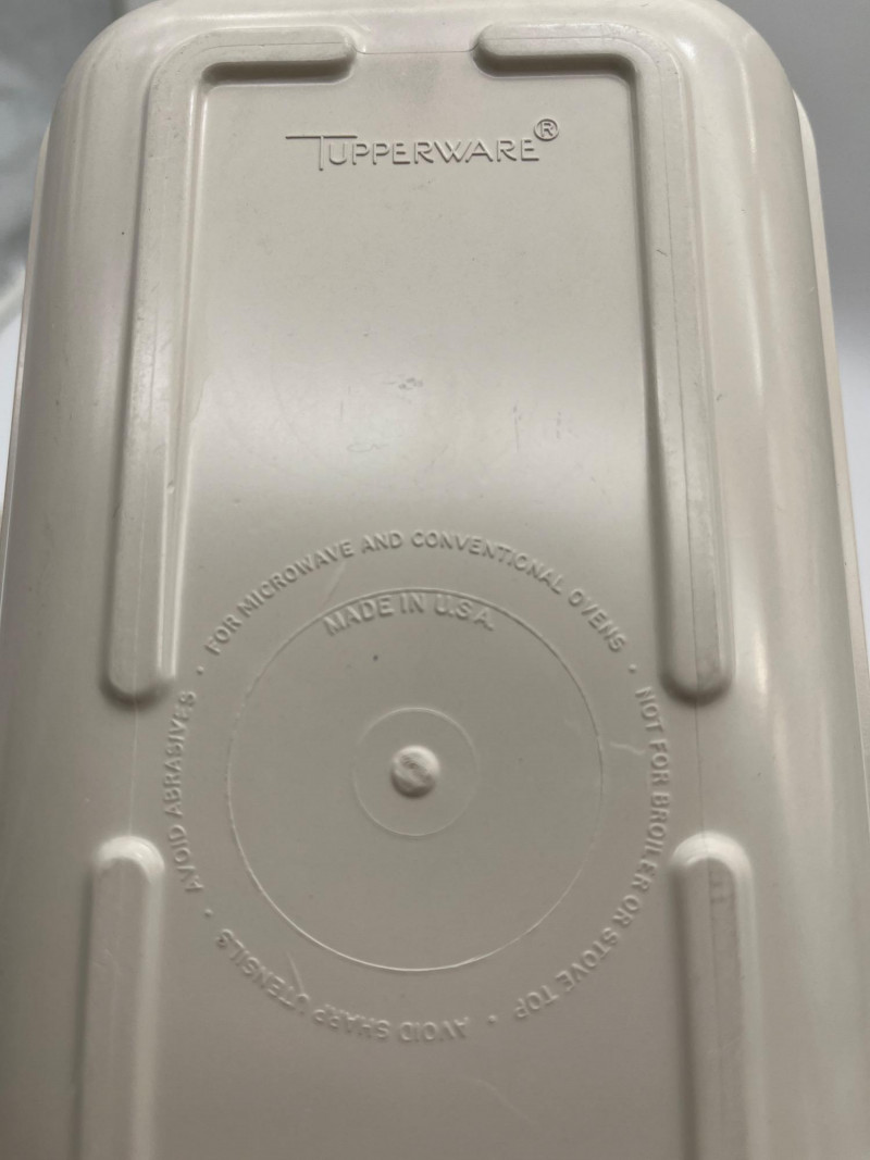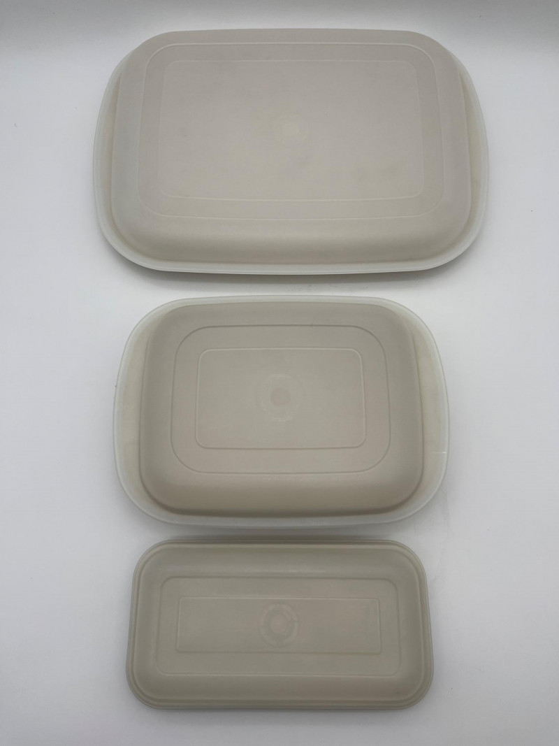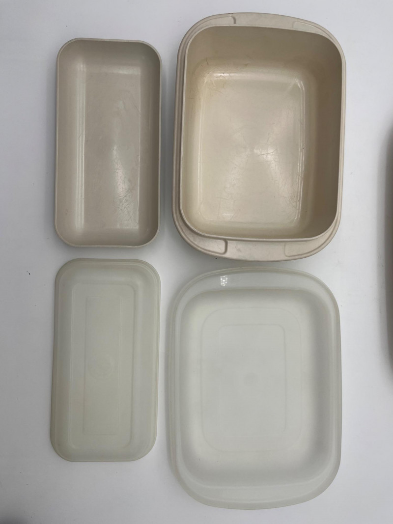 Vintage Tupperware Collection Tall container with blue lid is 11" tall, yellow bowl is 11" wide. The tan rectangle containers bases are microwave and oven safe.