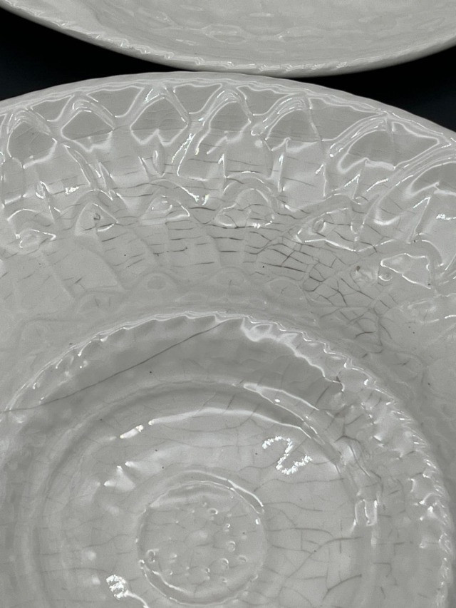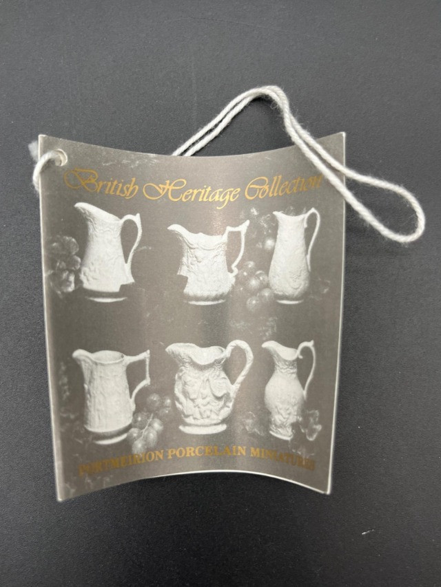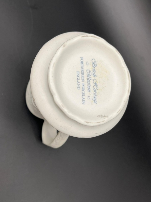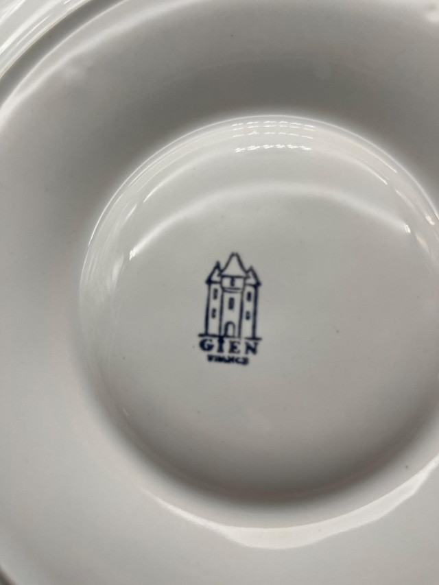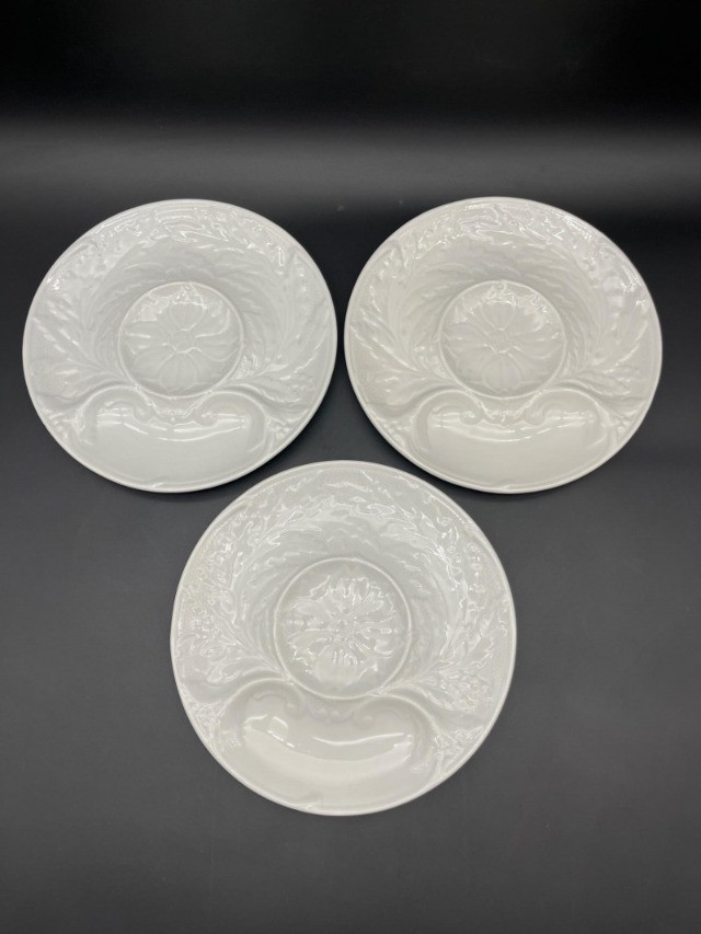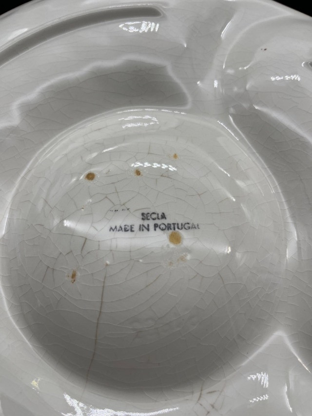 5 White Artichoke Plates by Gien & Secla and Small Portmerion Pitcher The plates are approximately 9" and one of the Secla Portugal plates has heavy crazing on the back. The pitcher is 4" tall and has scuffs that I try to show in photos.