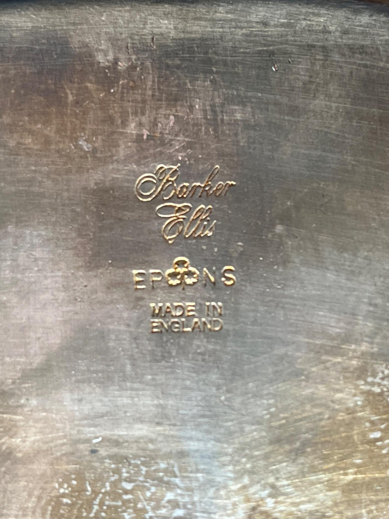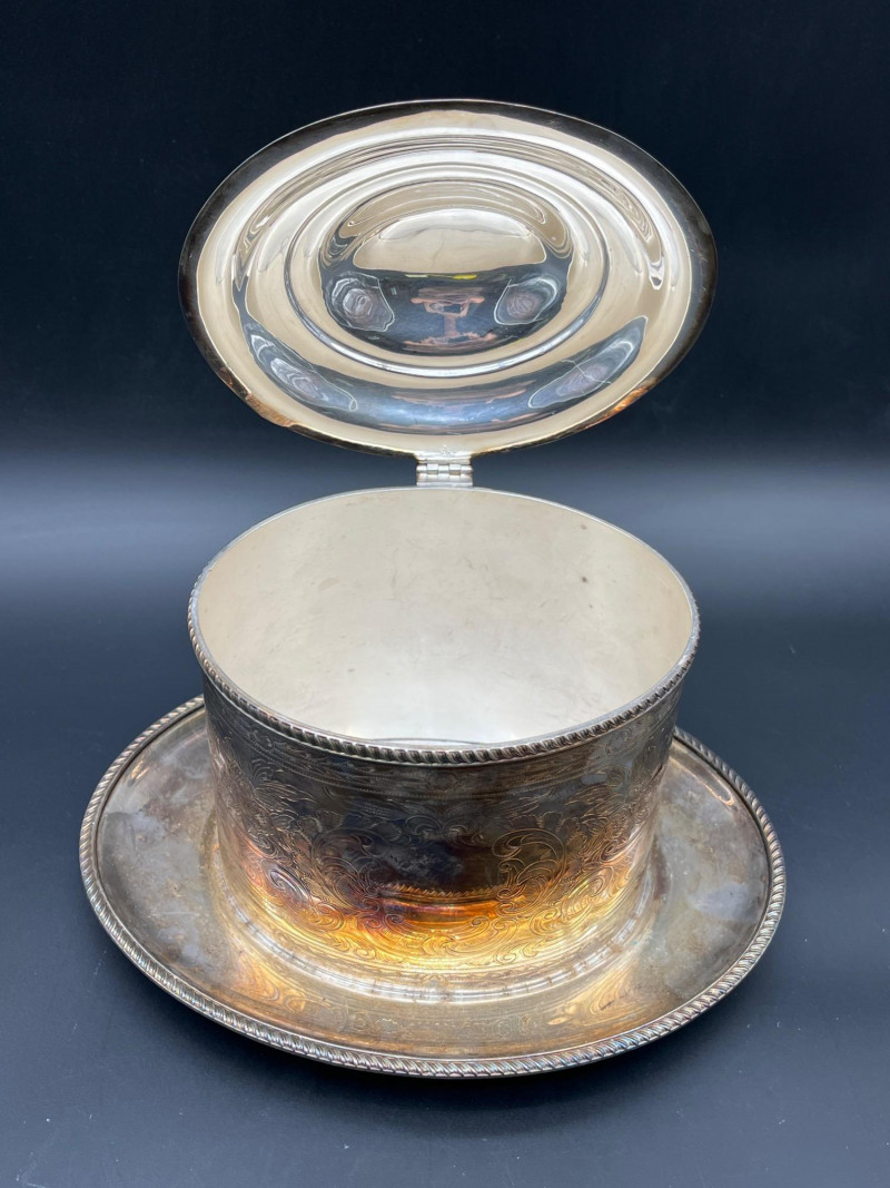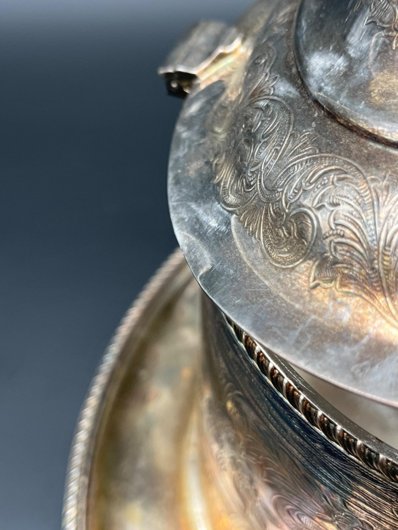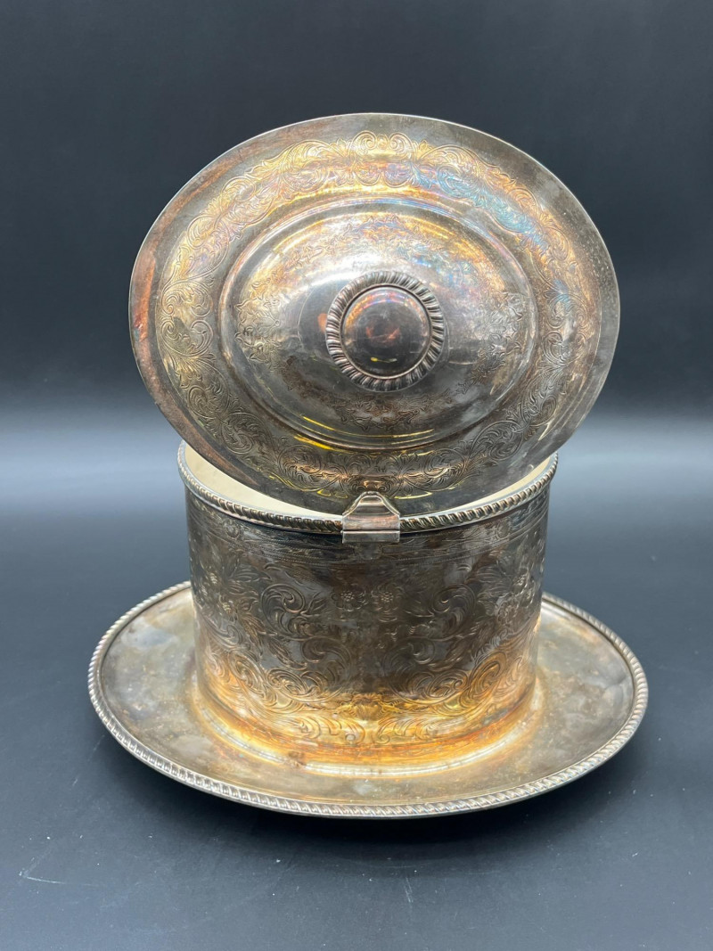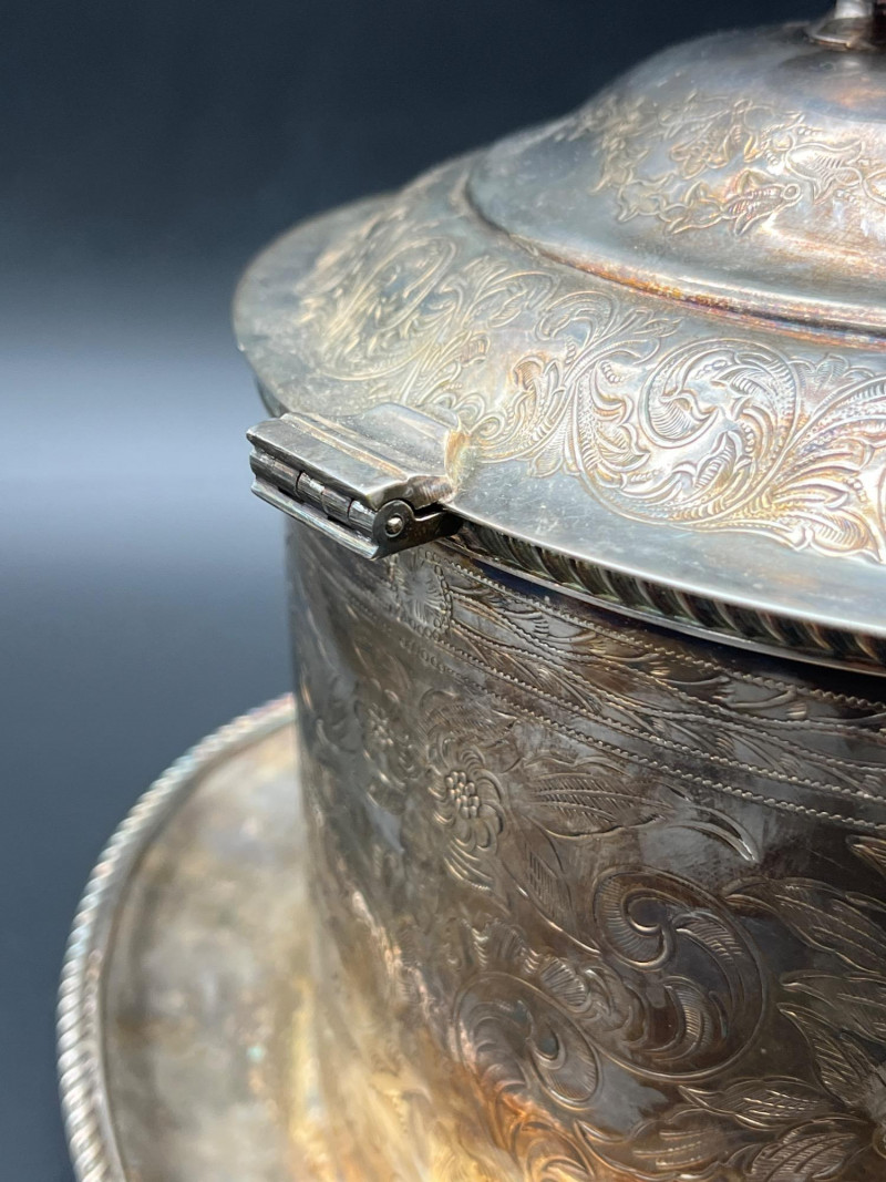Barker Ellis Victorian Styled Silver Plate Biscuit Box This hard to find piece is in good antique condition with a minor dent on the rim of the lid. It stands about 7" tall and the underplate is attached.