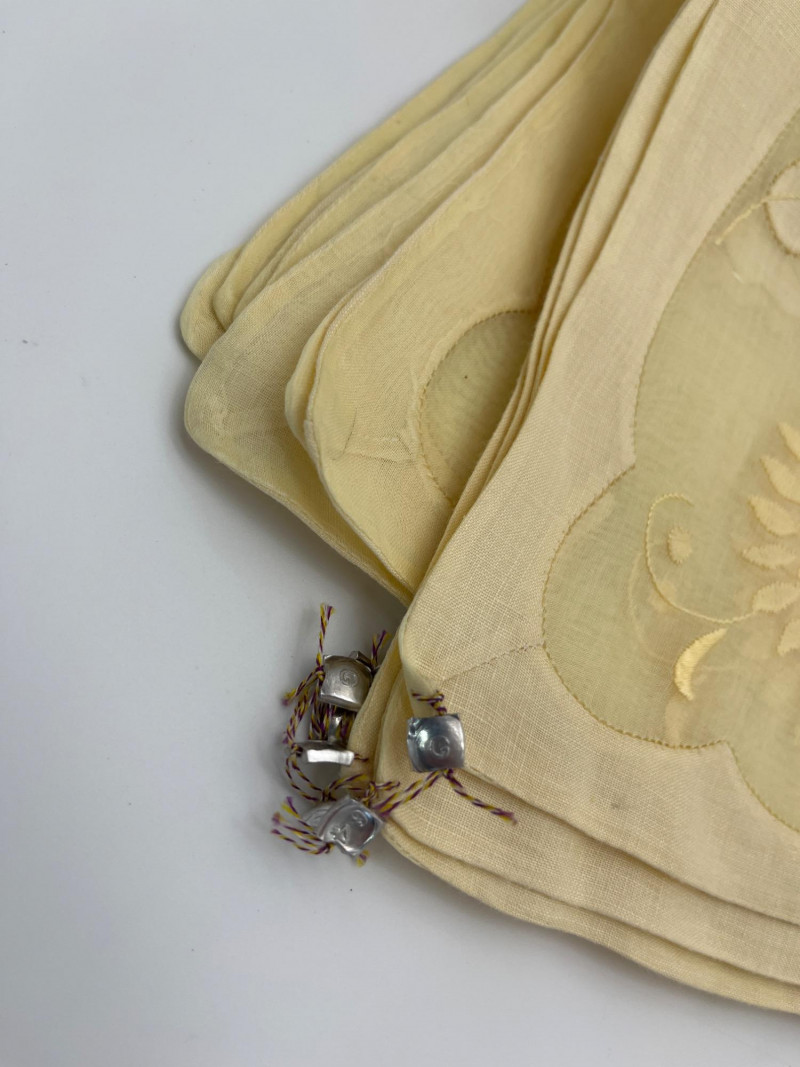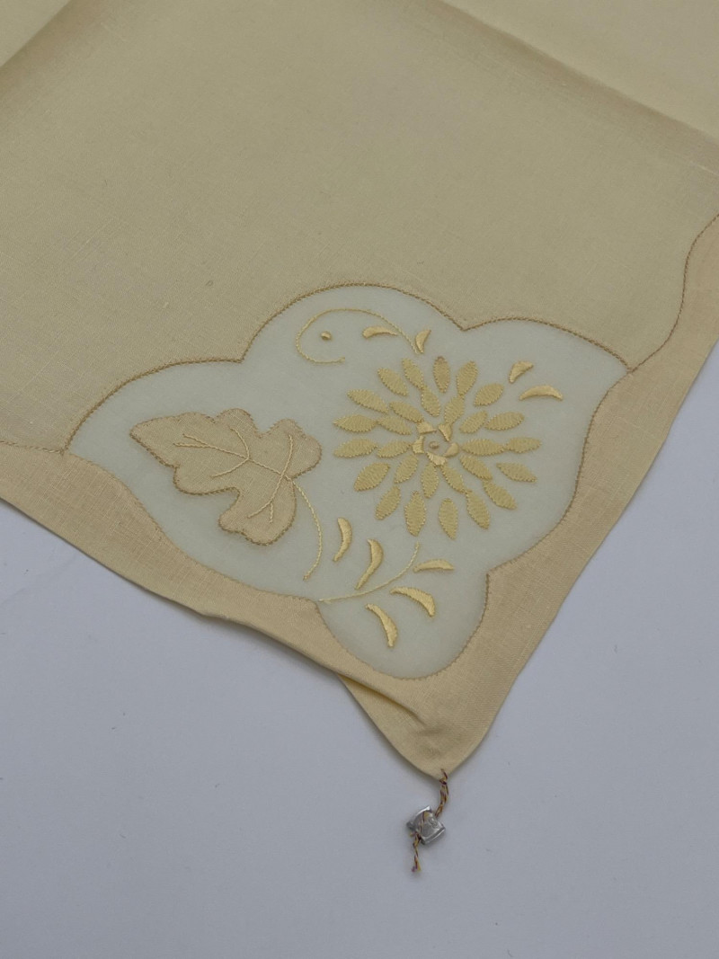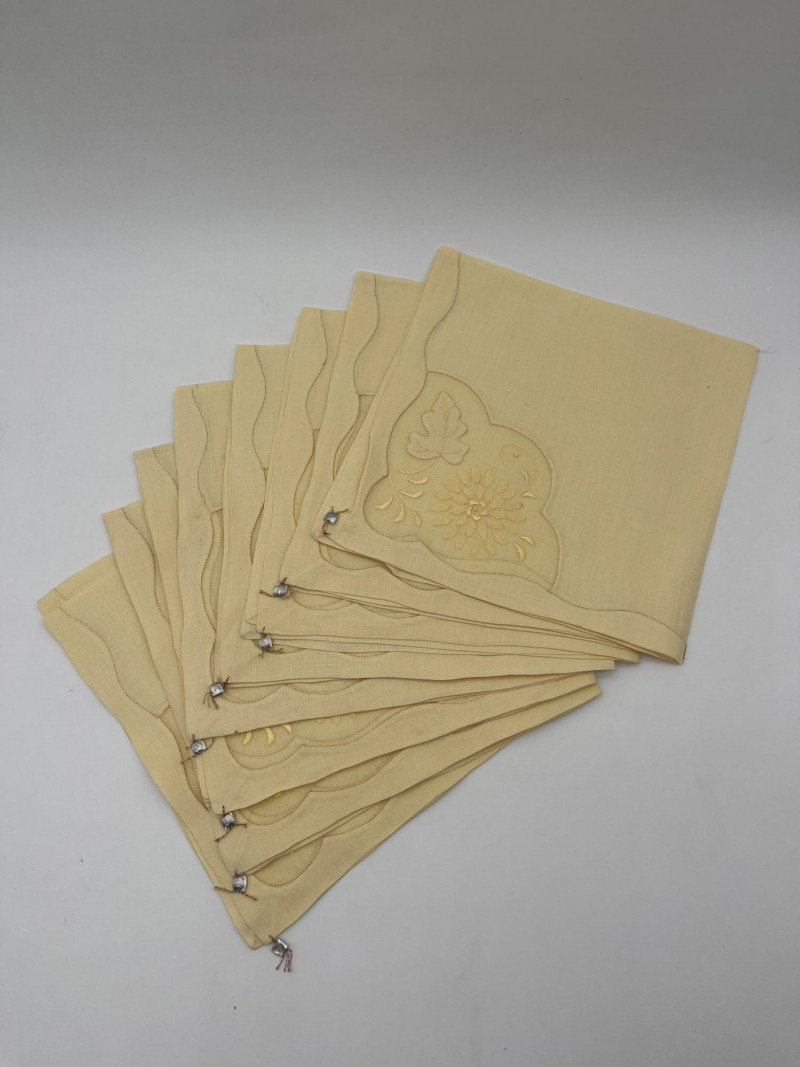 Vintage Hand Embroidered Yellow Table Linens This beautifully refined lot includes: These are said to have never been used and they still have their original metal brand tags.