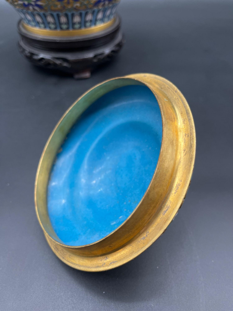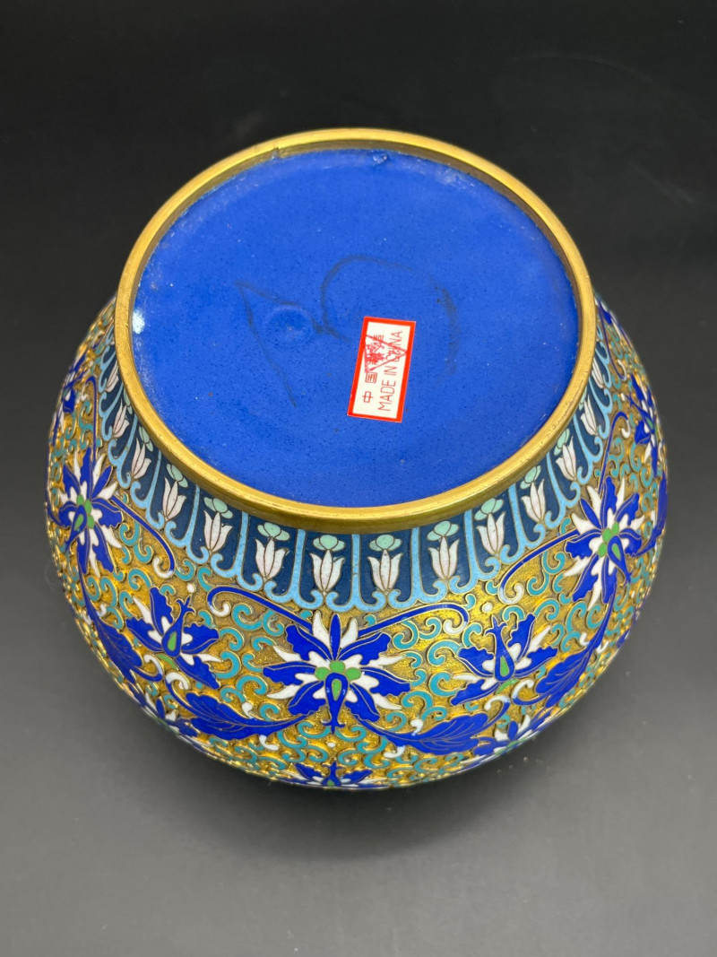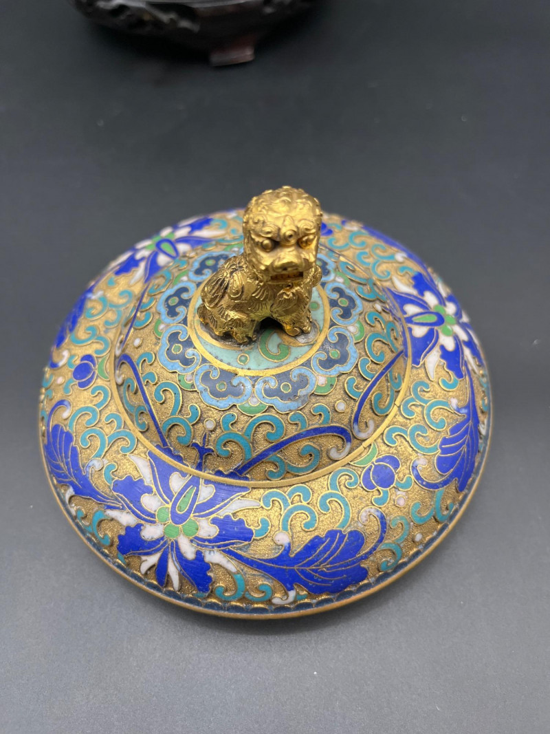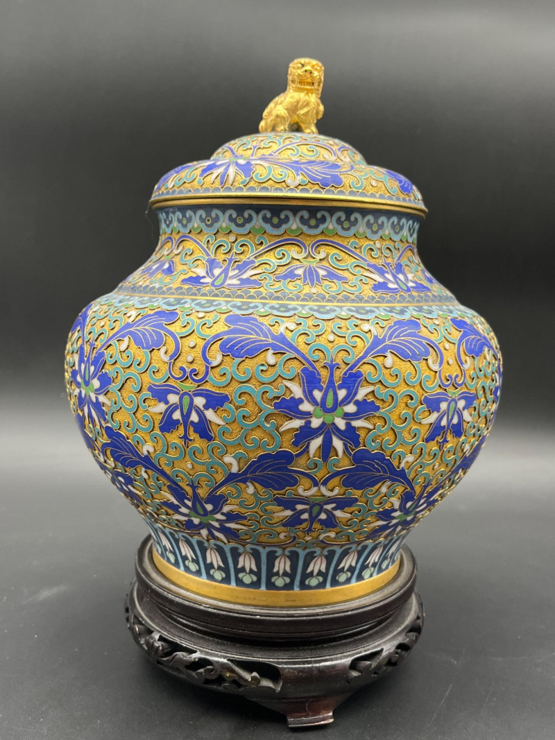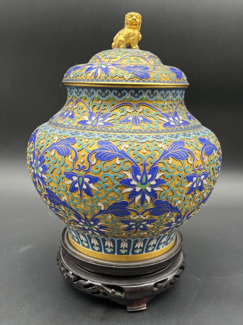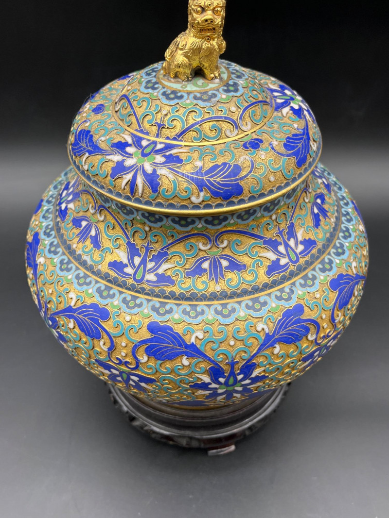Chinese Cloisonné Jar with Lid and Foo Dog Finial This incredible cloisonné jar is 9.5" tall including its lid. The foo dog handle adds a unique and decorative touch. The carved wood stand is included.