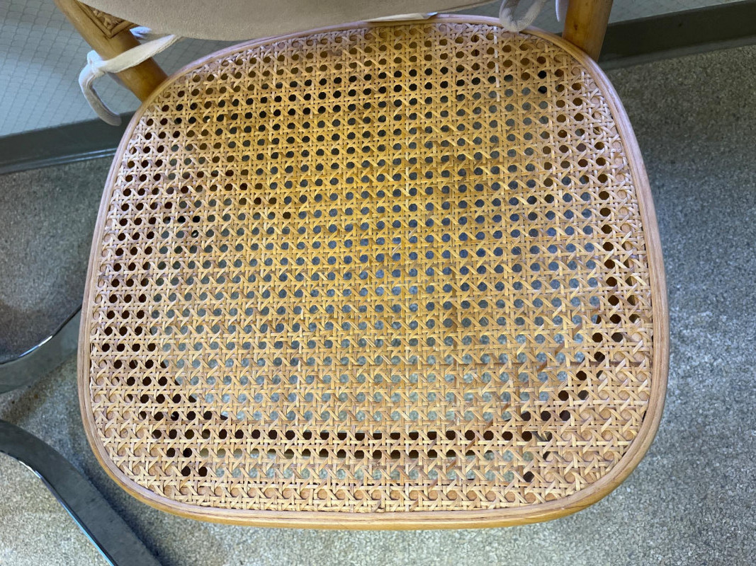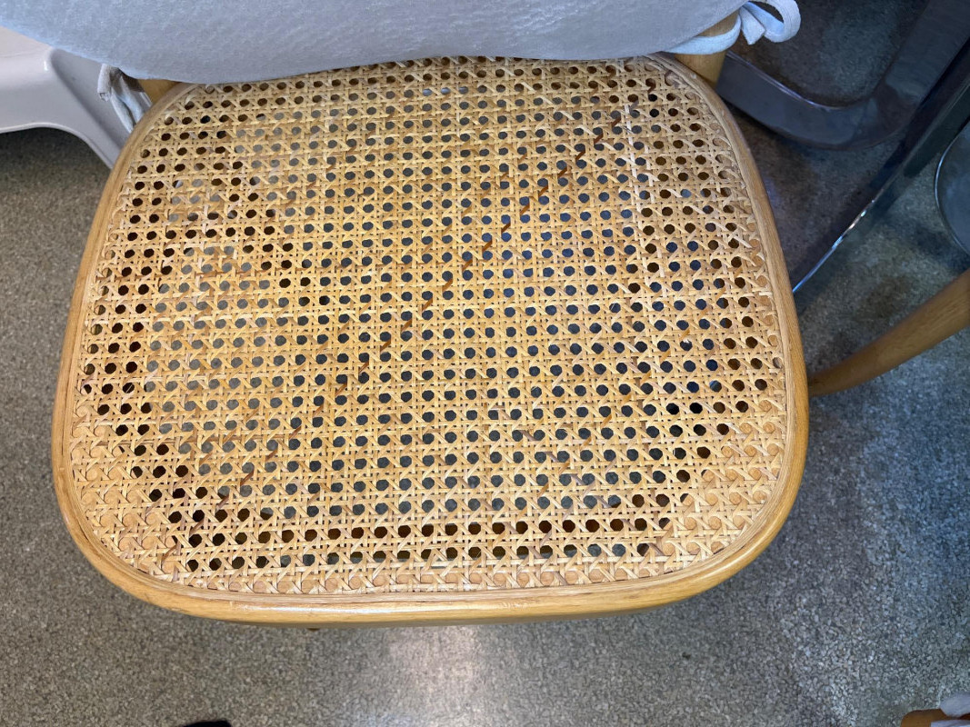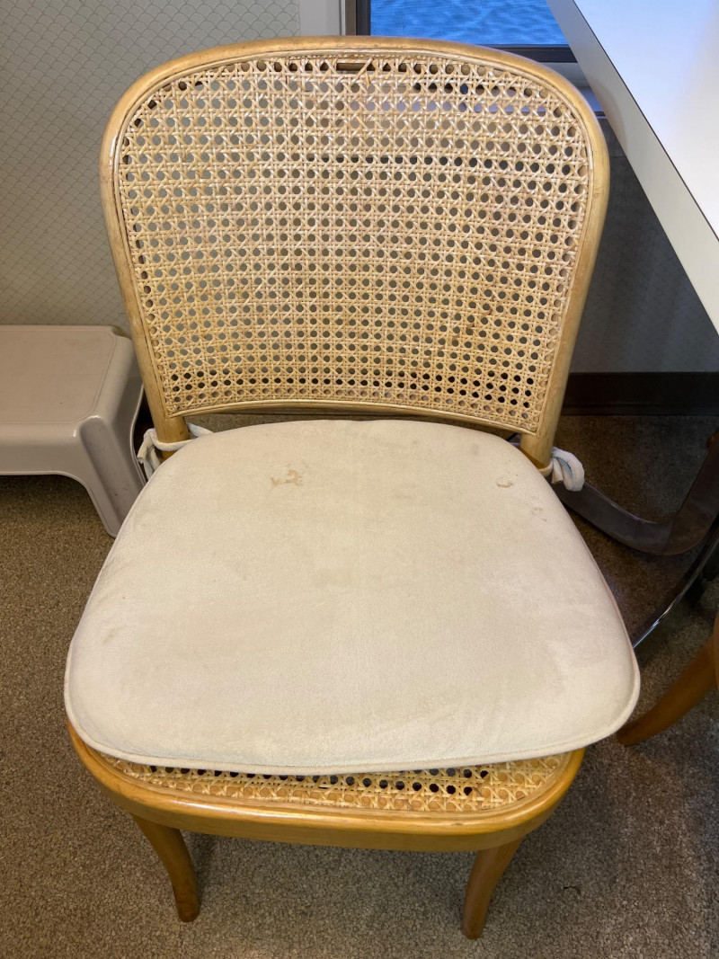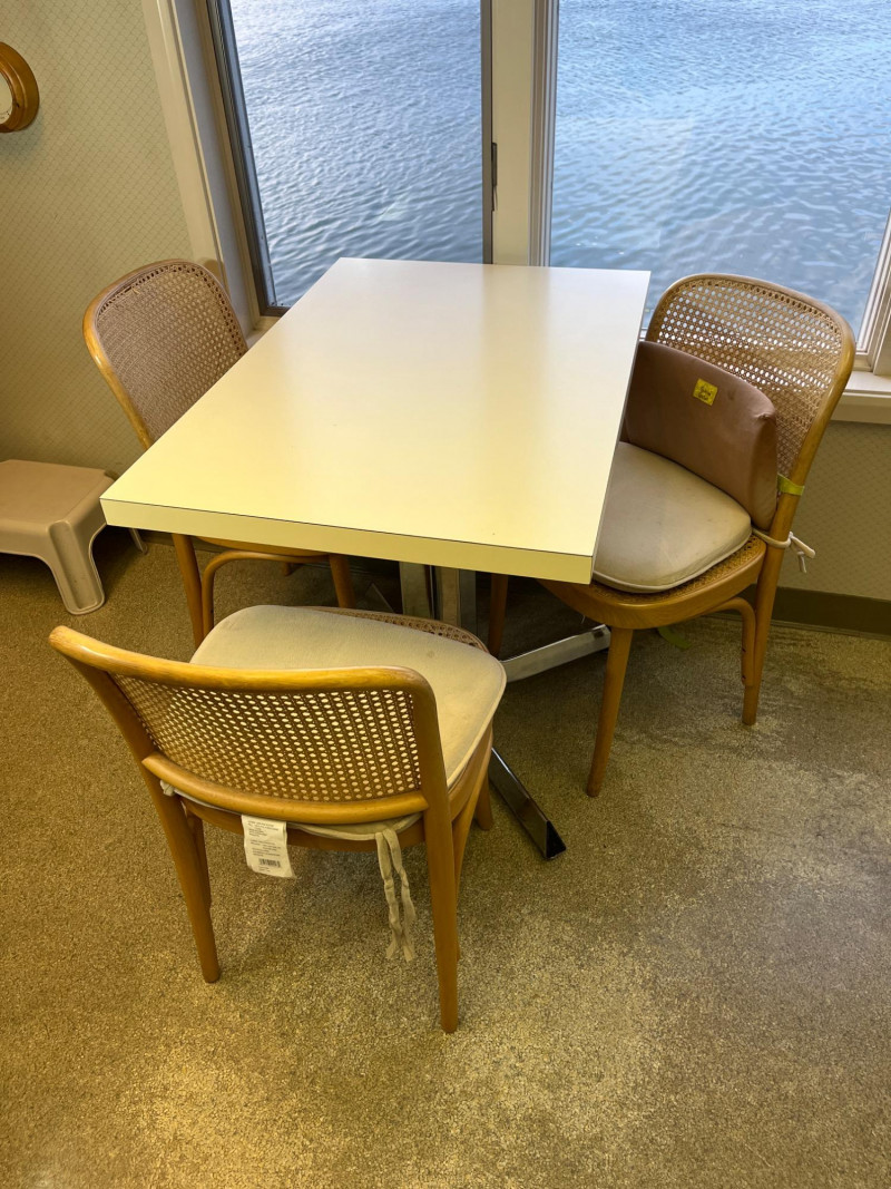 Kitchen Table and 3 Wood Chairs with Cane Seats and Backs Table is 2' x 3' and in very nice condition. The chairs are in good condition but one has minor damage to the caning on the top edge. Chair pads are included but do need a good wash.