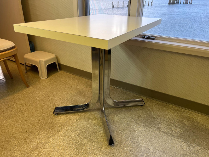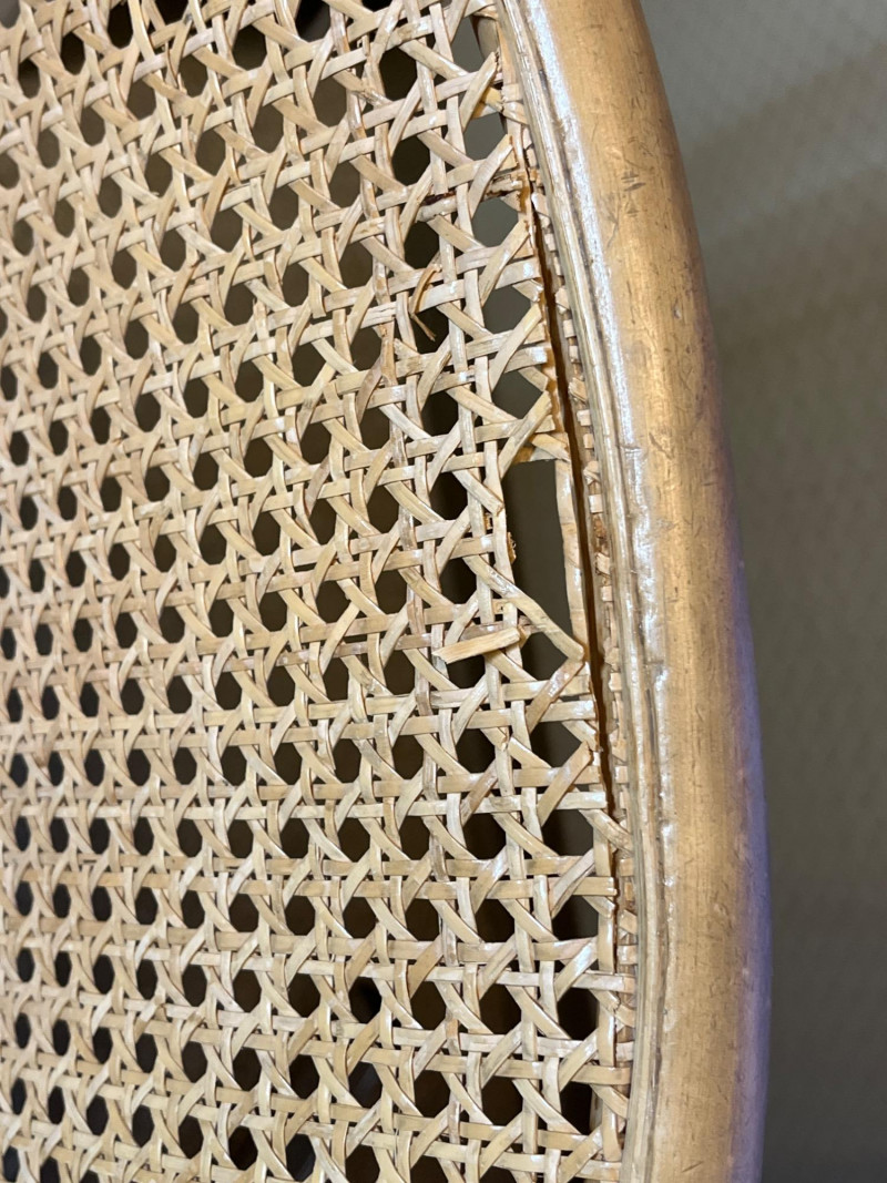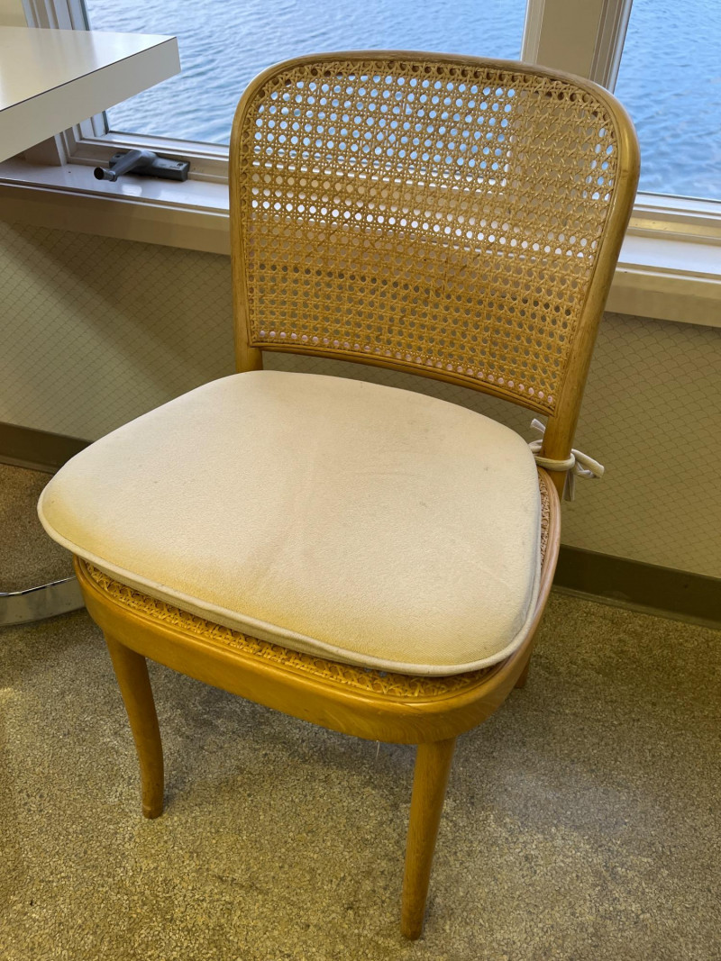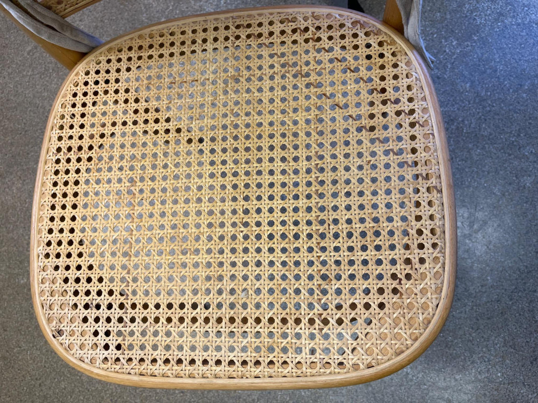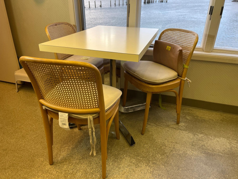 Kitchen Table and 3 Wood Chairs with Cane Seats and Backs Table is 2' x 3' and in very nice condition. The chairs are in good condition but one has minor damage to the caning on the top edge. Chair pads are included but do need a good wash.