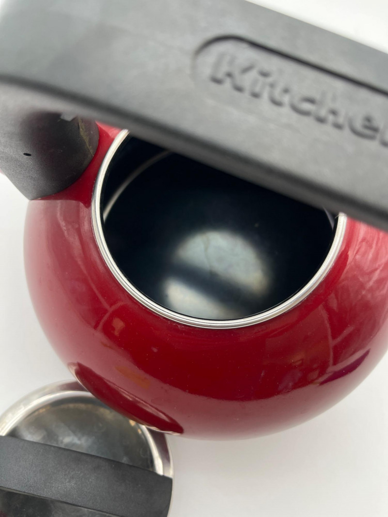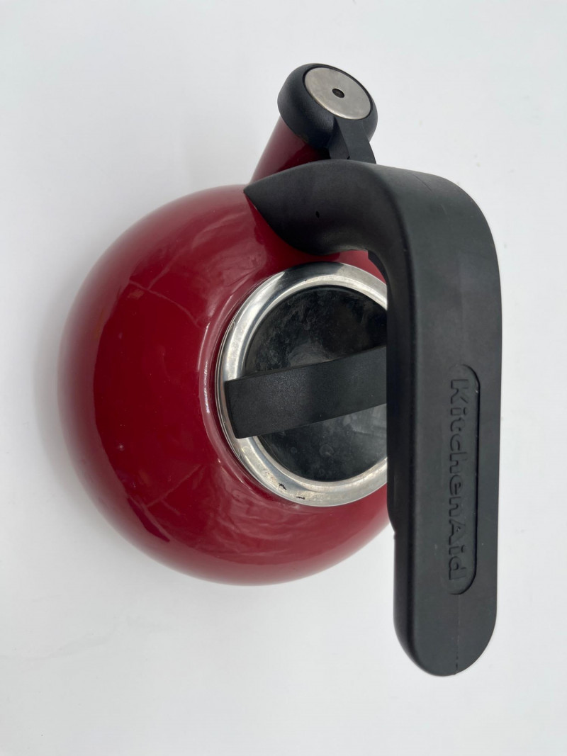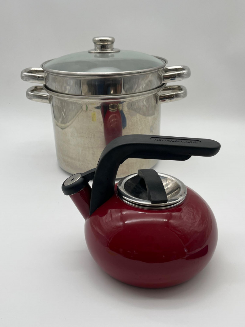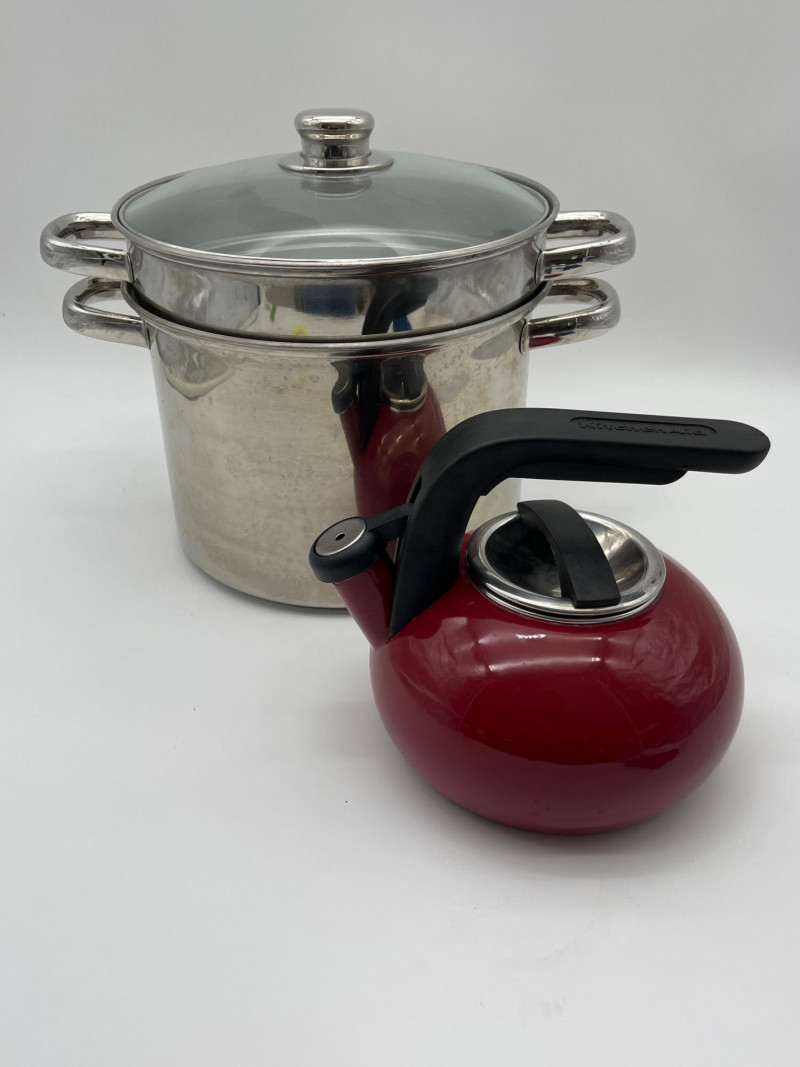 Large Stainless Steel Steamer Pot and Red Kitchenaid Tea Kettle Pot is 10" wide and 7" deep and includes a glass lid. Tea Kettle looks virtually unused.