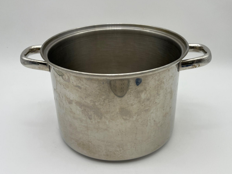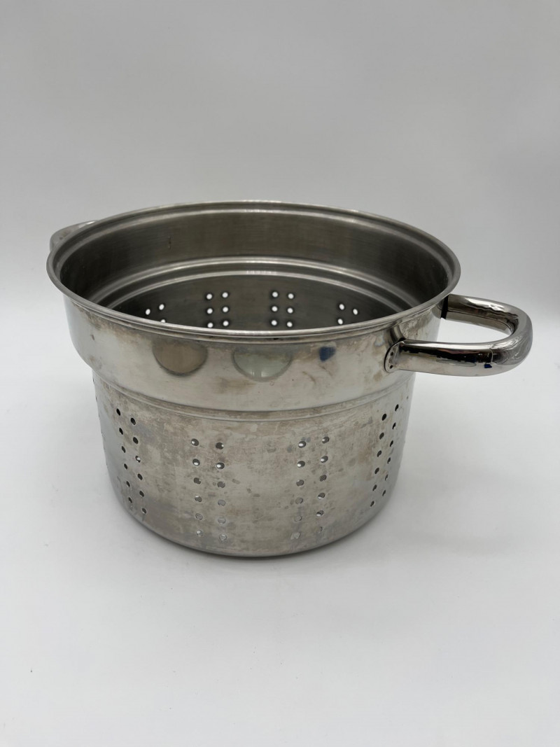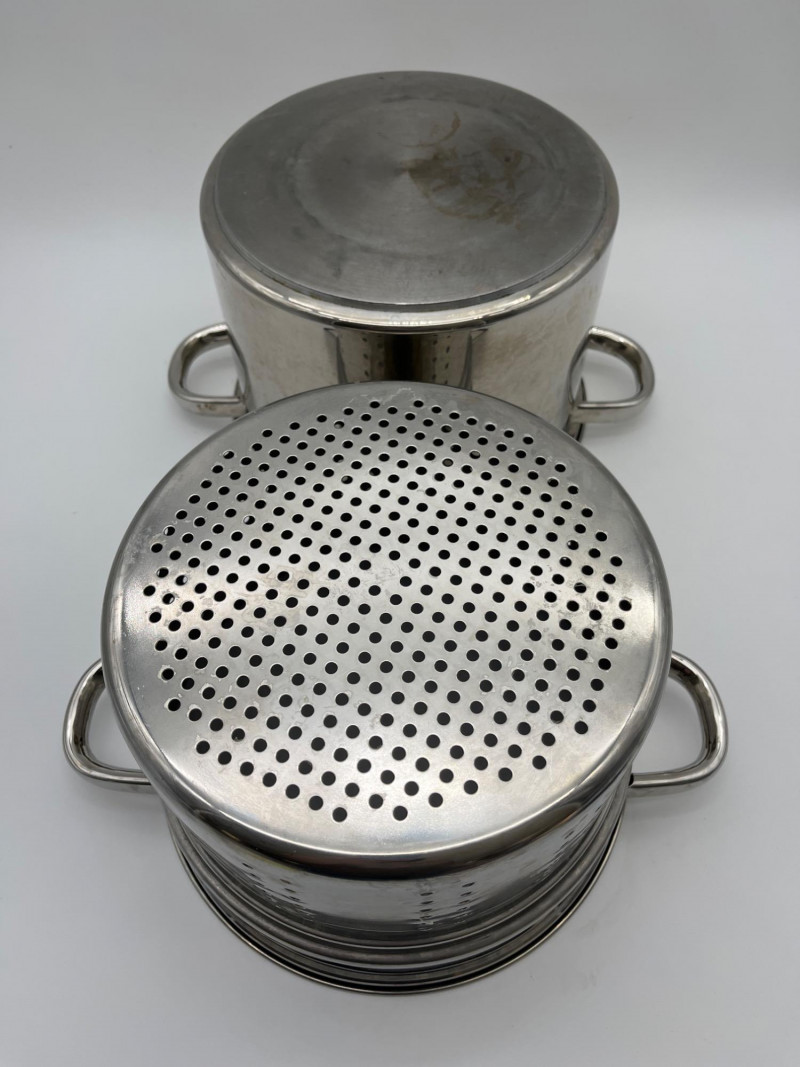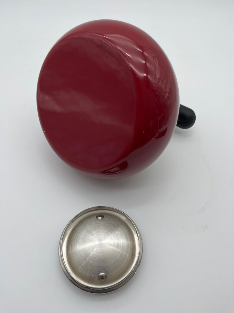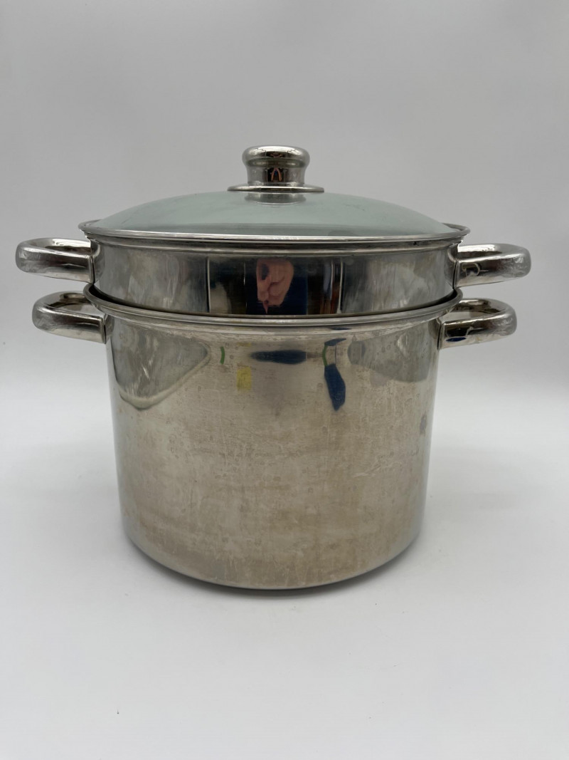 Large Stainless Steel Steamer Pot and Red Kitchenaid Tea Kettle Pot is 10" wide and 7" deep and includes a glass lid. Tea Kettle looks virtually unused.