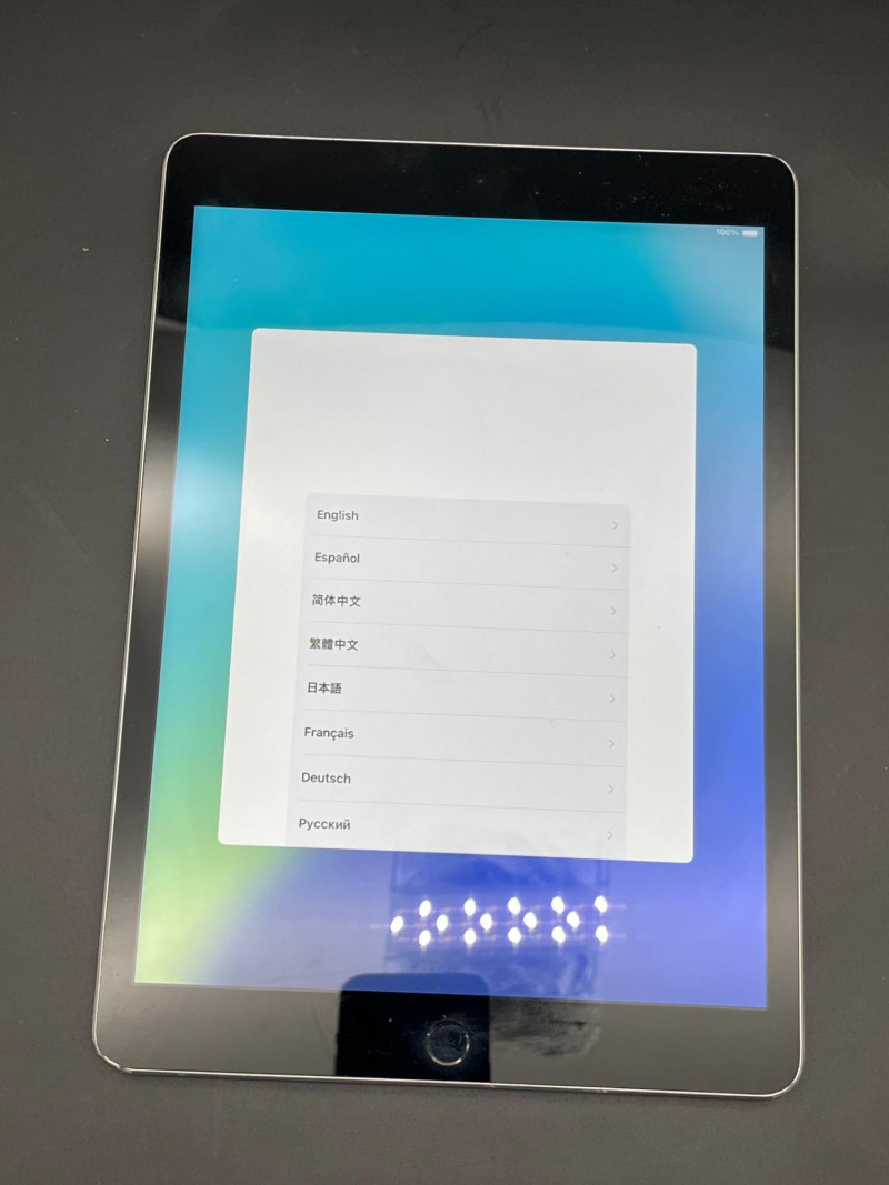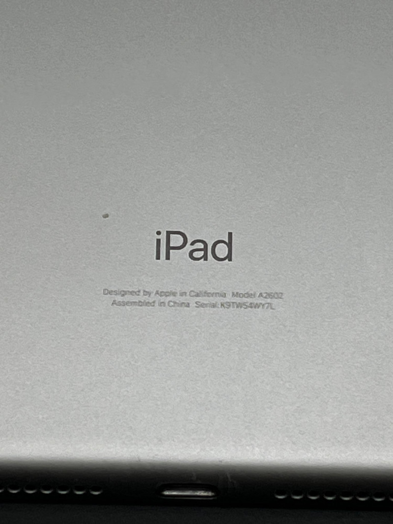 9th Generation iPad Model A2602 Memory has been wiped and owner assures me that battery holds a sufficient charge. Powers on and prompts for setup come up. Charging cord not included.