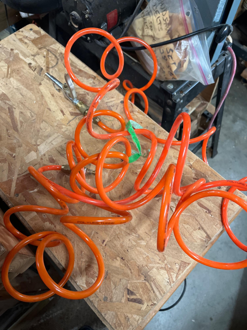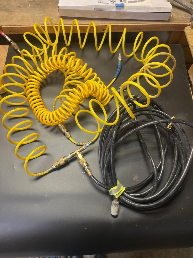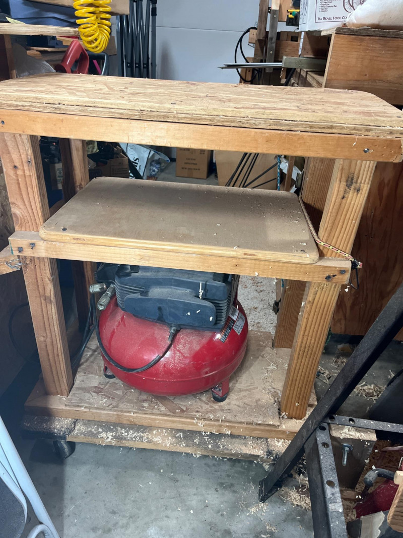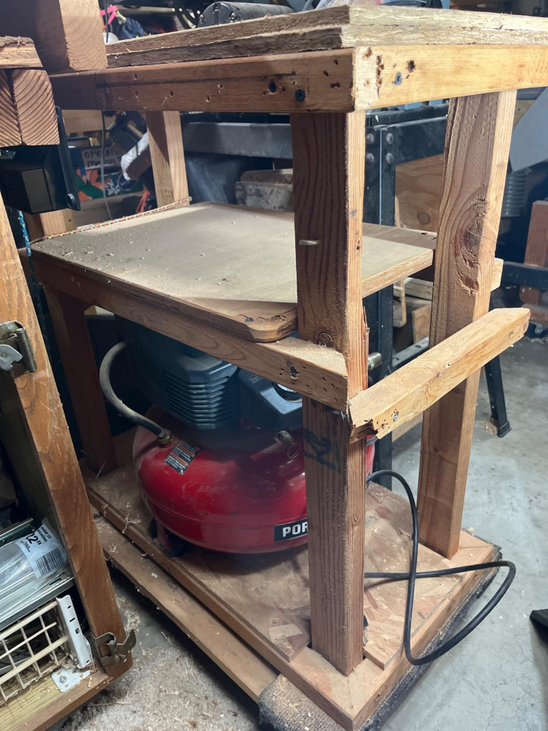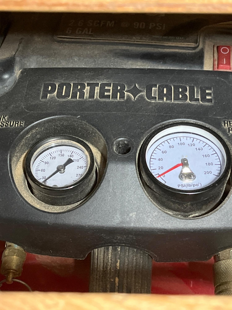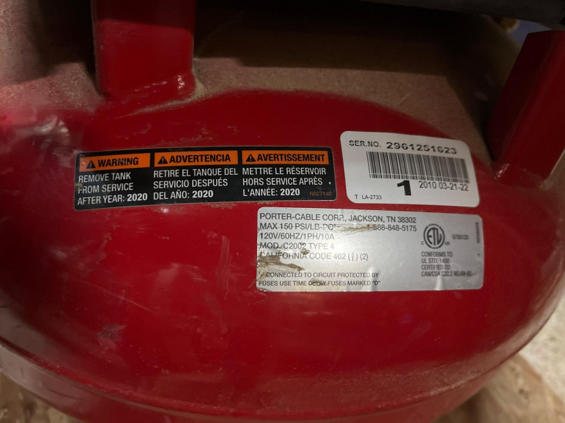 Porter Cable 6 Gallon Air Compressor Mounted in Wheeled Cart w/ Multiple Hoses Model number C2002 6 Gallon Oil Free Pancake Air Compressor, 150 PSI The compressor is mounted onto a home shop made wheeled cart for easy movement around your shop. The cart's top surface measures 29" by 14" and stands 3' tall. The wheels are rotating casters that are in good condition and move freely. Included are all of the hoses in the photos. I am unsure of their lengths and capacities. The air compressor is untested as I do not have experience with them but to my knowledge, the compressor is only about 5 years old and was used regularly.