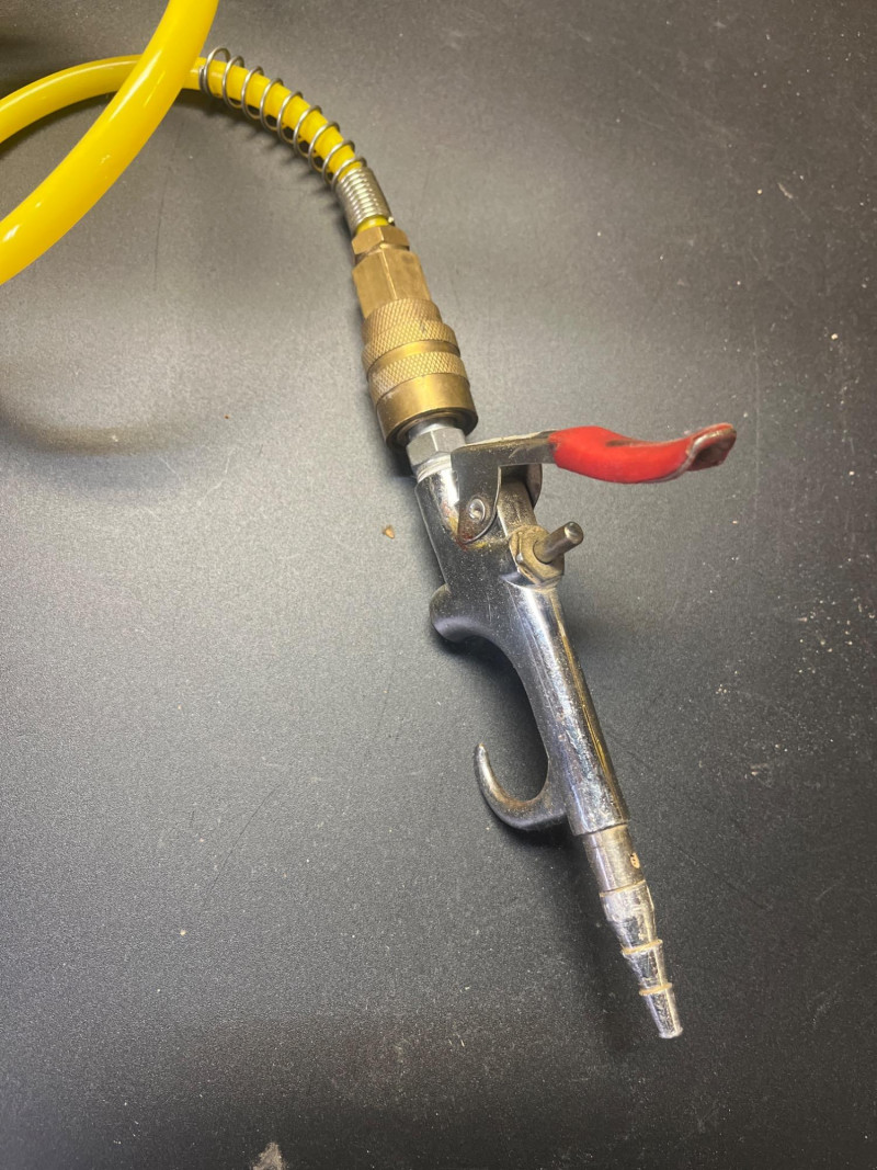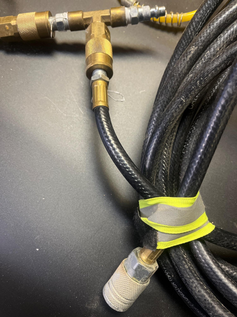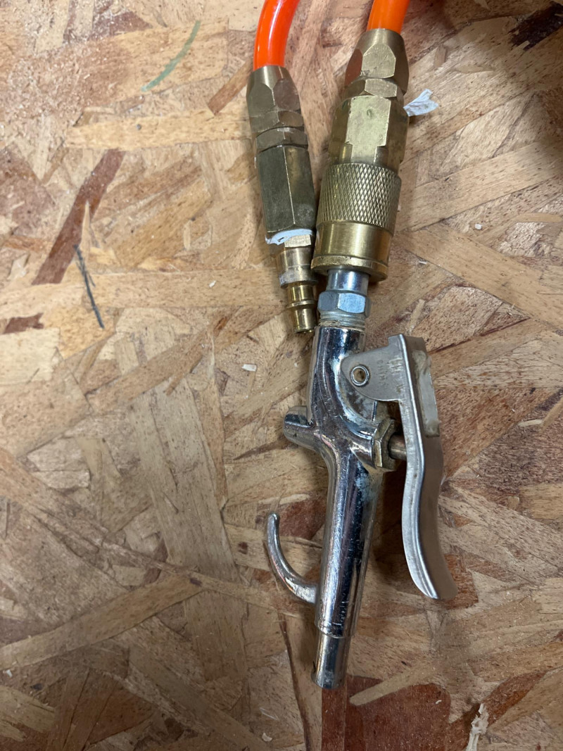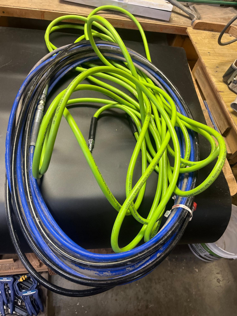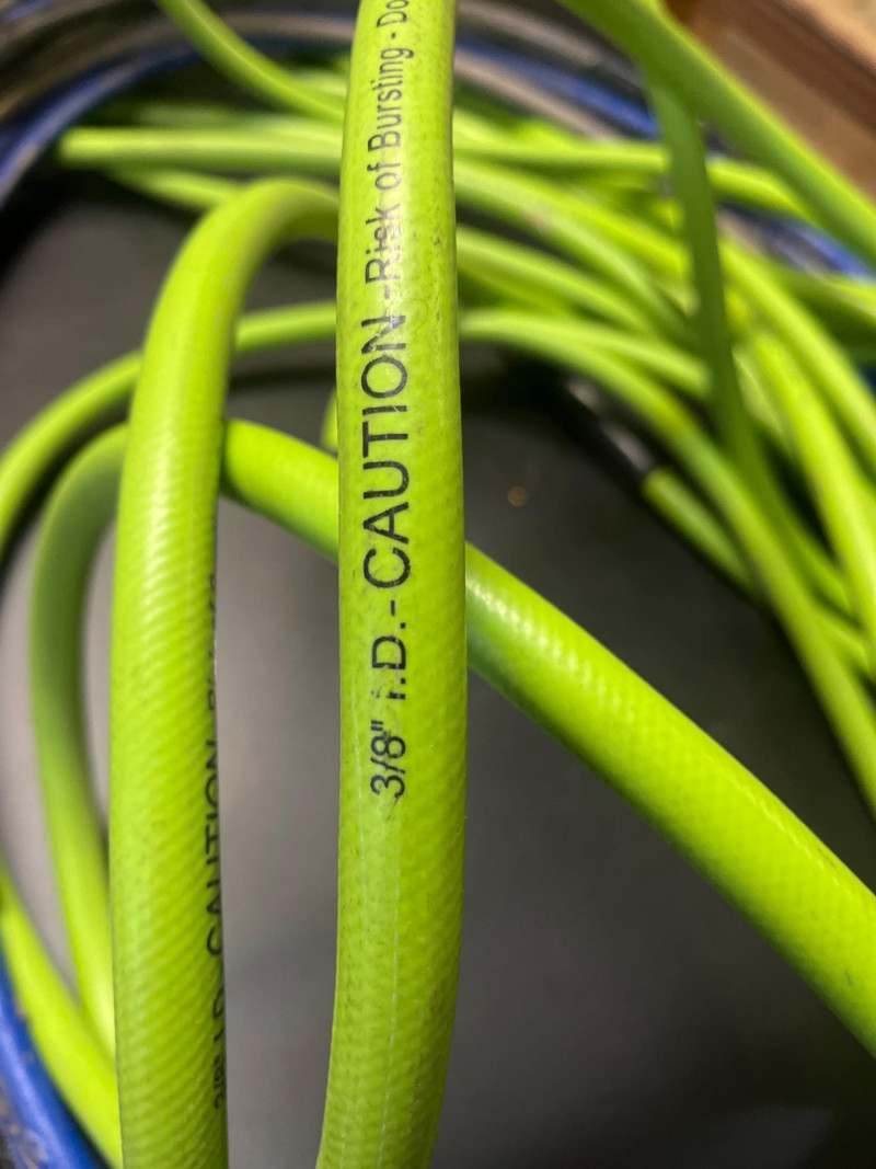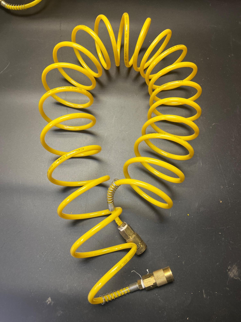 Porter Cable 6 Gallon Air Compressor Mounted in Wheeled Cart w/ Multiple Hoses Model number C2002 6 Gallon Oil Free Pancake Air Compressor, 150 PSI The compressor is mounted onto a home shop made wheeled cart for easy movement around your shop. The cart's top surface measures 29" by 14" and stands 3' tall. The wheels are rotating casters that are in good condition and move freely. Included are all of the hoses in the photos. I am unsure of their lengths and capacities. The air compressor is untested as I do not have experience with them but to my knowledge, the compressor is only about 5 years old and was used regularly.