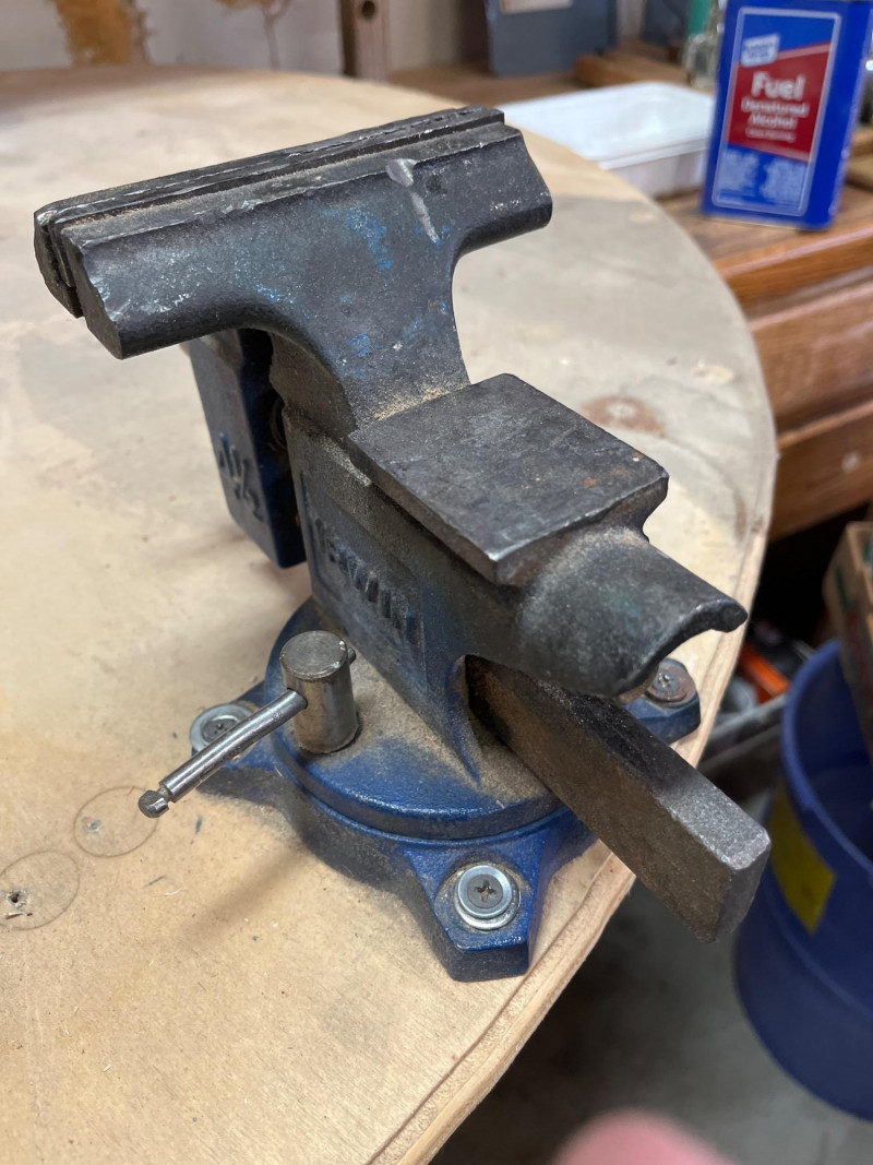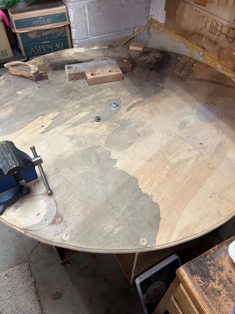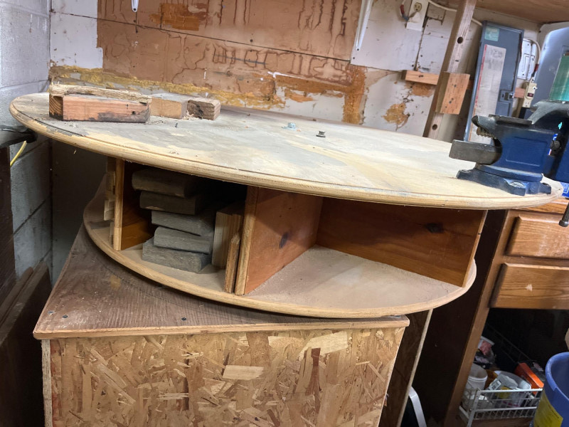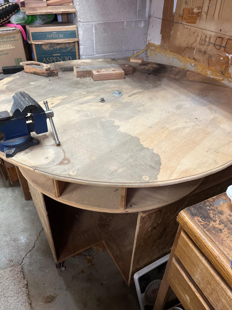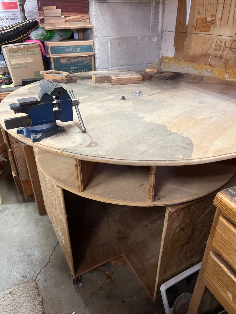 Lazy Susan Work Station with Attached Vise This work station is ideal for workshops with limited space because multiple tools can be attached and there is quite a bit of storage both directly under the top platform and in the base. When I first started the process of sorting items for this sale, this bench had the belt sander, the belt/disc sander, scroll saw, and bench grinder mounted to it, all with plenty of space in between each machine. Note: There are a few pieces of wood on top are attached but you could remove them with a claw hammer. The bearings in the center do need to be oiled/greased as it is a slight challenge to turn. Measures: 48" wide, 40" tall