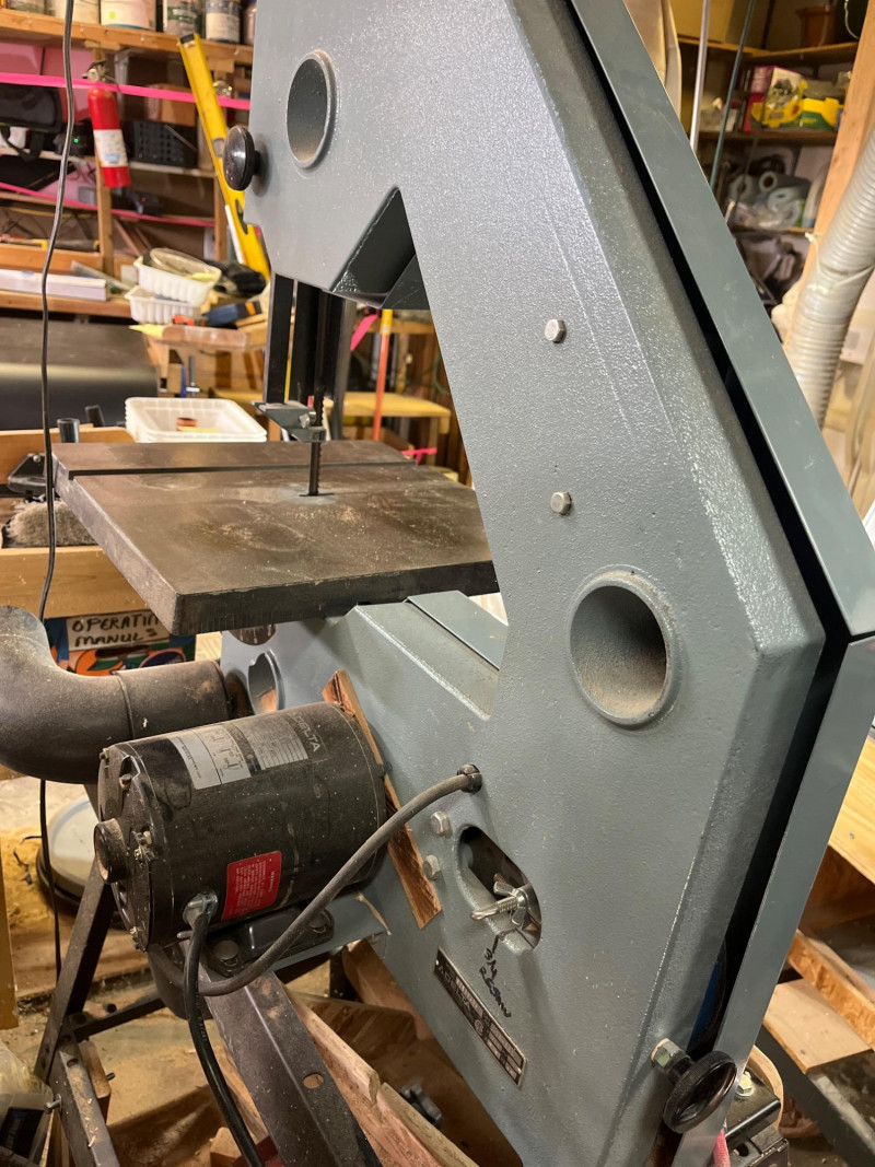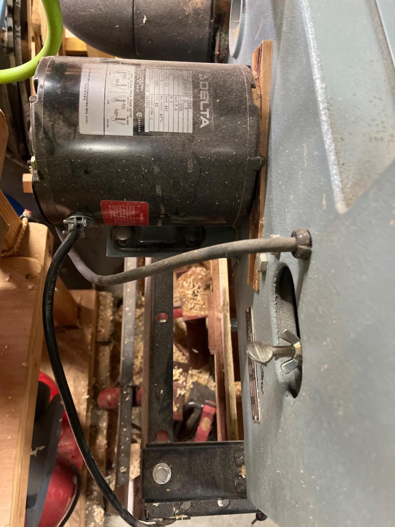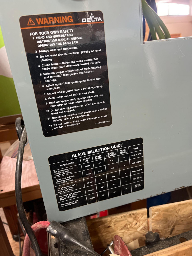 Delta 16" Motorized Band Saw Tested and in working order. Pusher with added wood guard included. Wood panels on the bottom are entirely removeable. This was the woodshop of a person who was limited on space and so those wood pieces may just be jigs from a previous project.