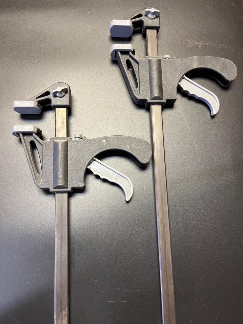 8 Bar Clamps Varying Sizes from 28" to 43" The two ratcheting clamps are 43" long. Two of the quick release clamps are 34" long, four are 28" long.