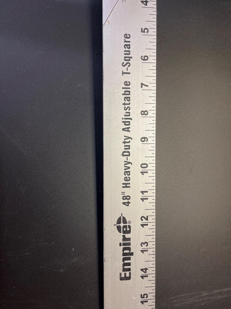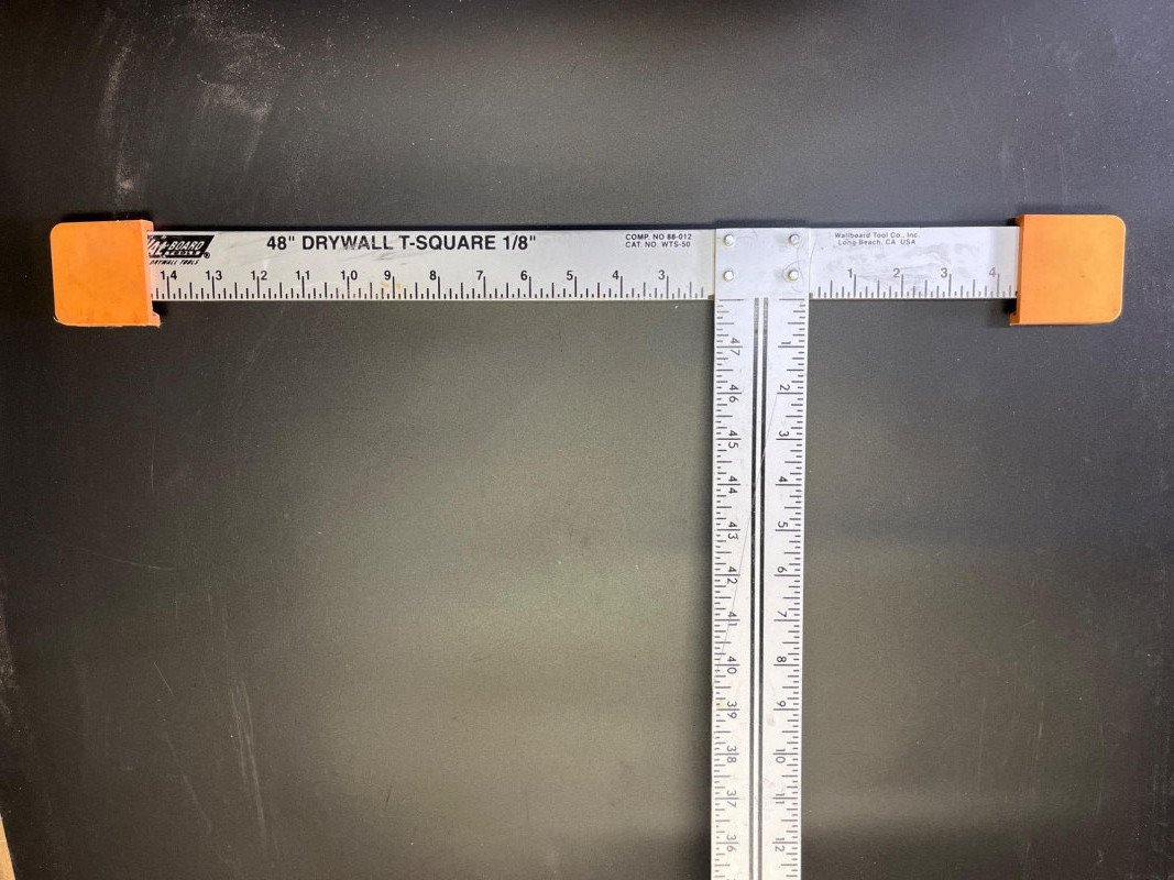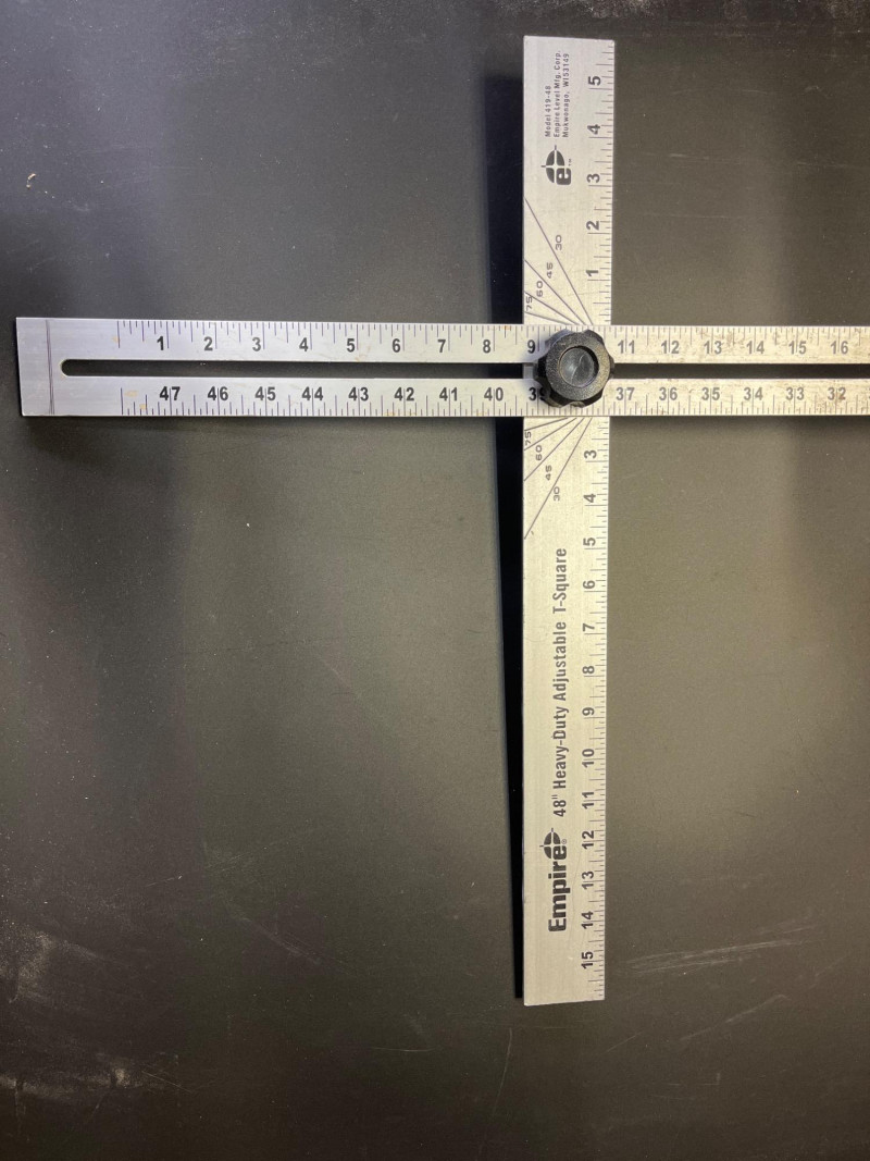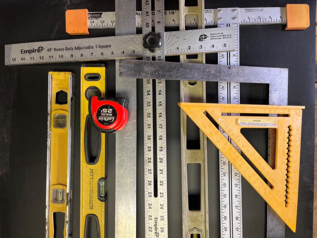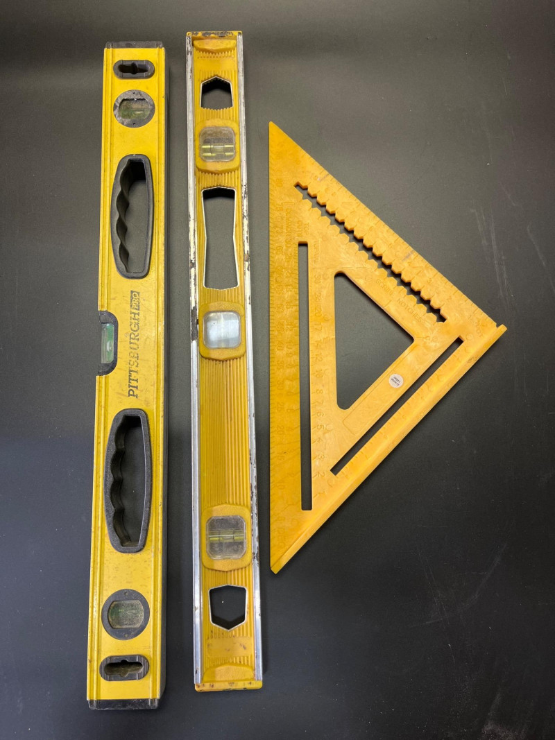 Big Lot of Measuring and Accuracy Tools This lot includes a framing square, speed square, 25" measuring tape, three levels of various lengths (longest is 48")48", adjustable t-square, 48" drywall t-square, and a metal yard stick.