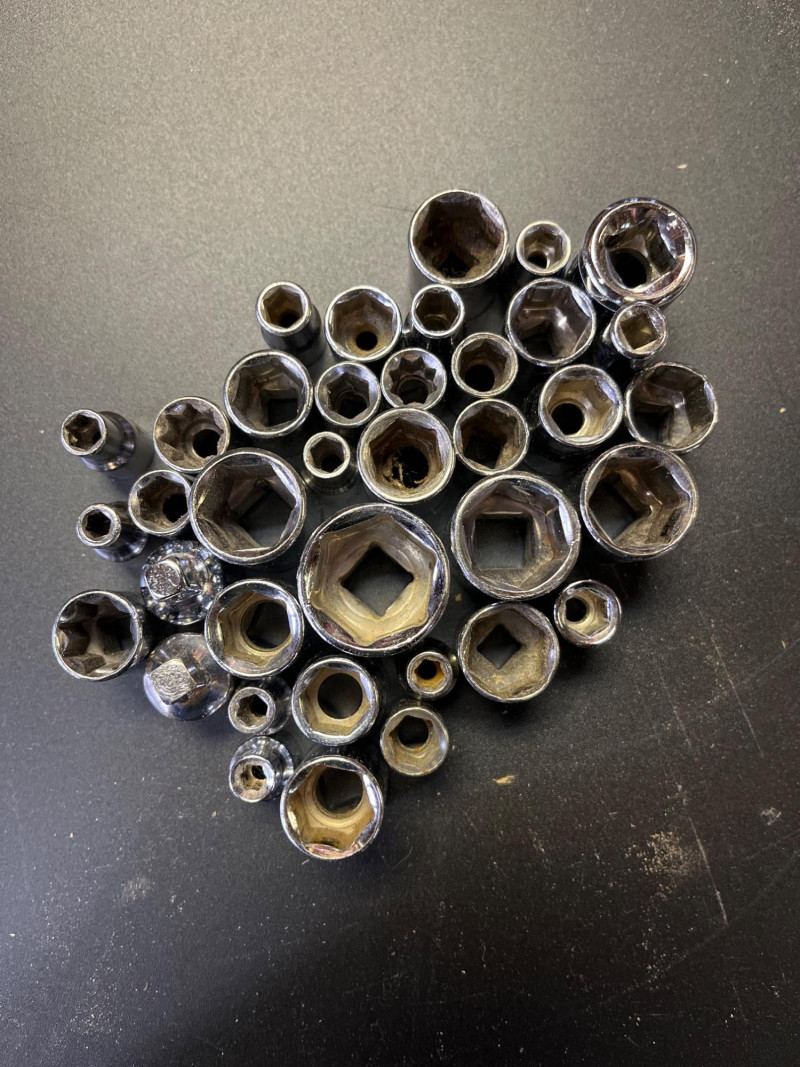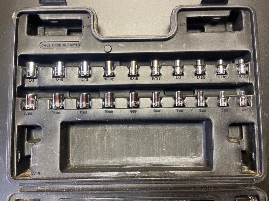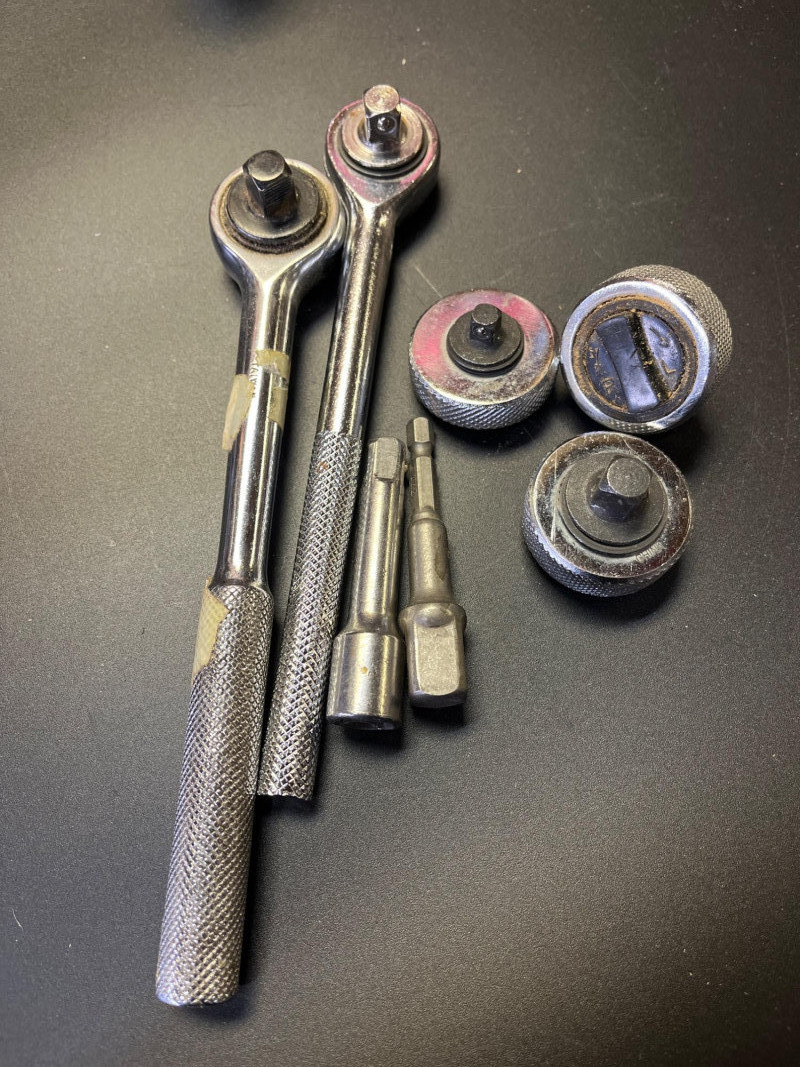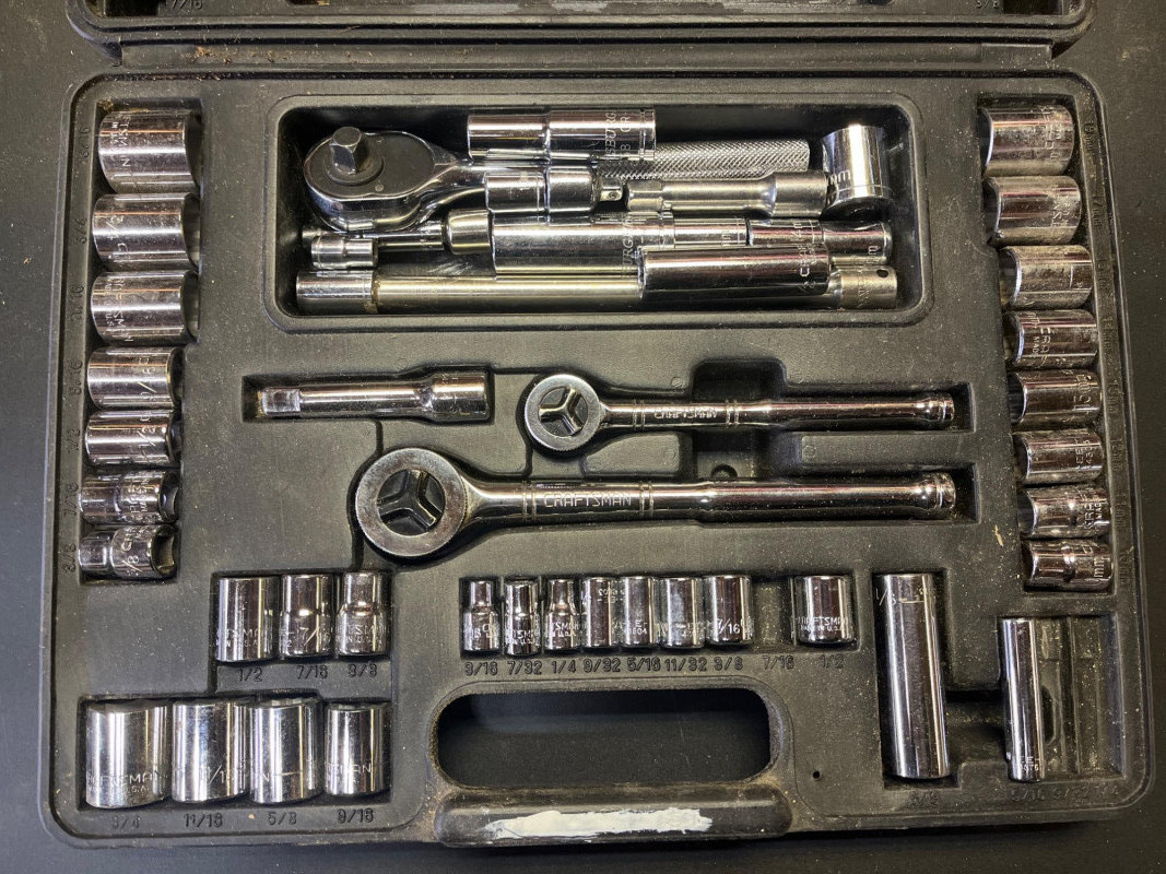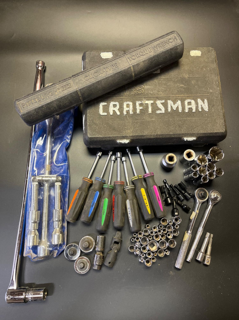 Ratchet, Socket, Lug, and Torque Wrenches Lot This is a lot with a wide variety of brands, from Pittsburgh to Craftsman, tools and sizes. The Craftsman set in the case is near but not fully complete, missing a few of the extender pieces. The lug wrench and the torque wrench look unused.