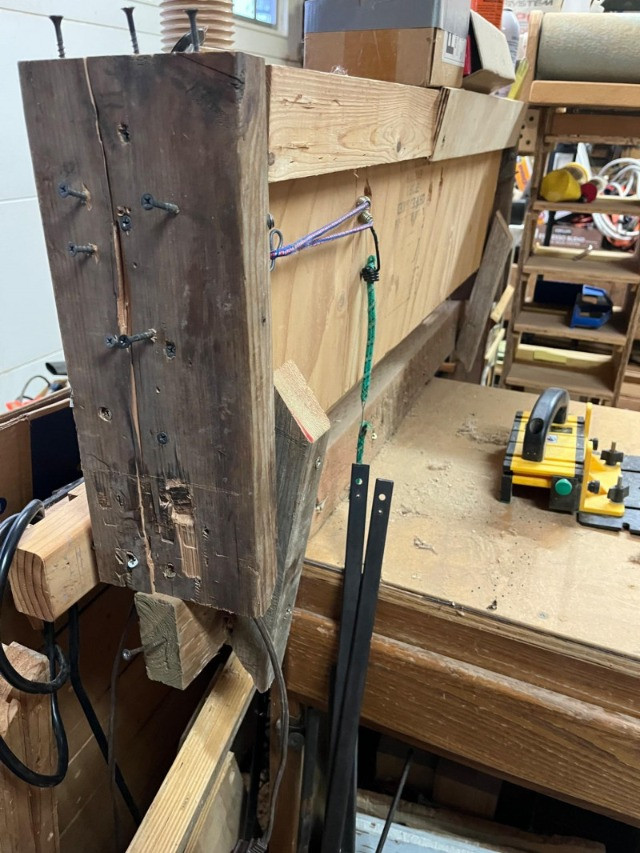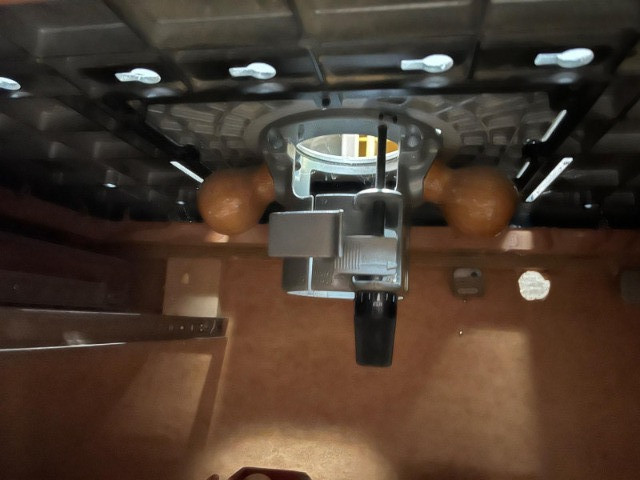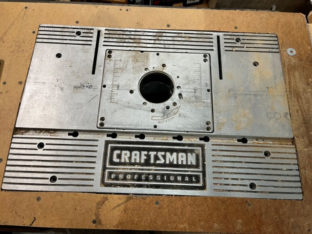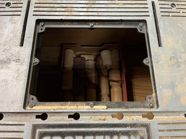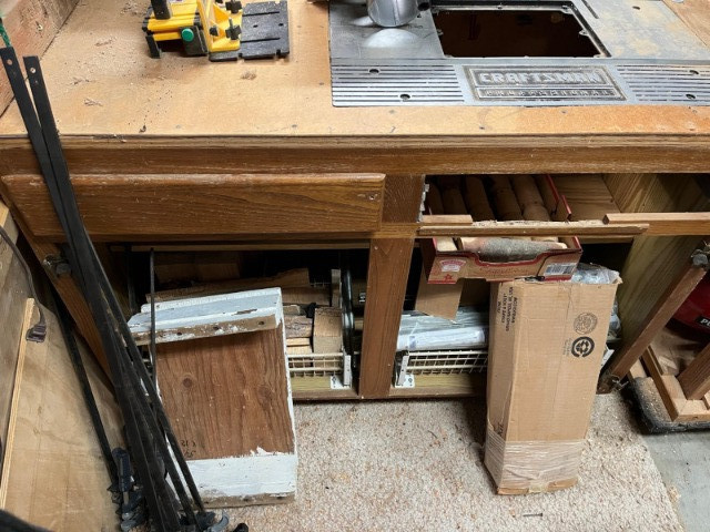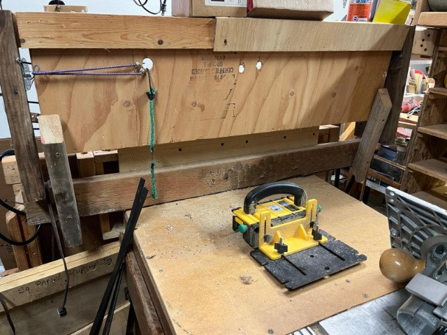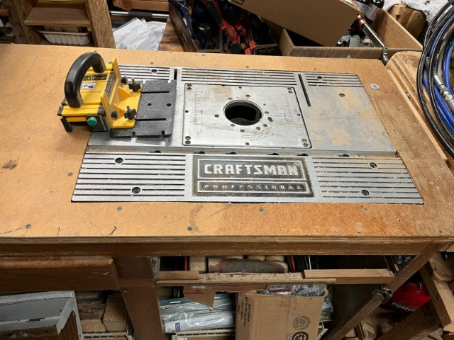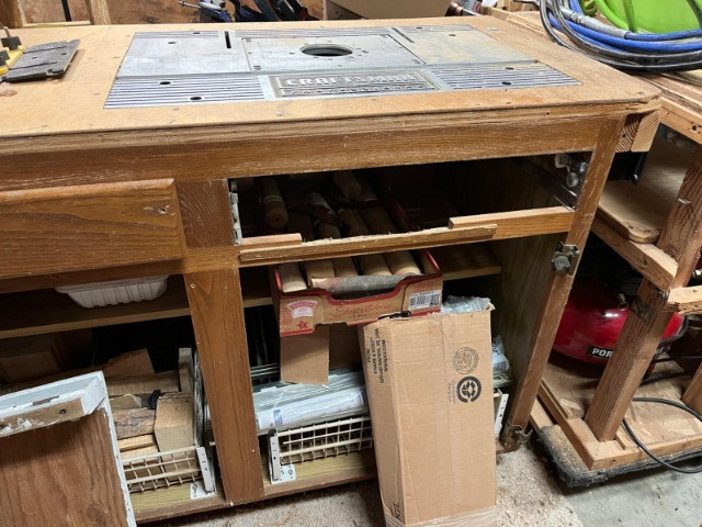 Workbench with Built in Router Table This is a homemade work bench built from a kitchen cabinet and has a router table built into the top. On the end is a work station, originally designed as a lathe station with slots for various woodturning tools. This station could easily be used for a variety of tools or completely transformed to your liking.