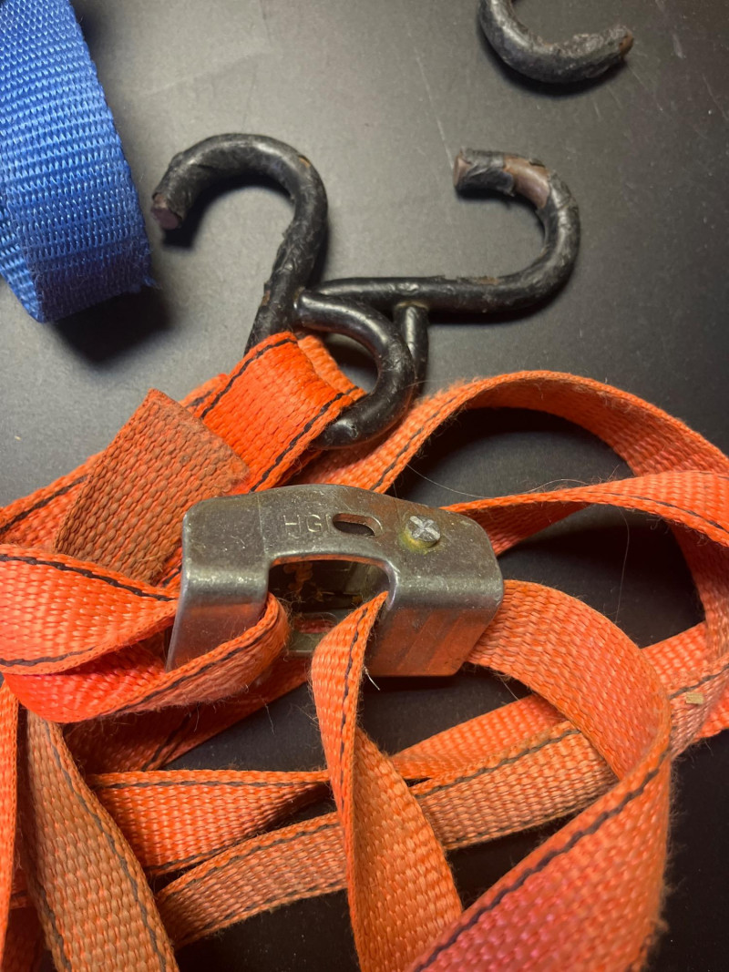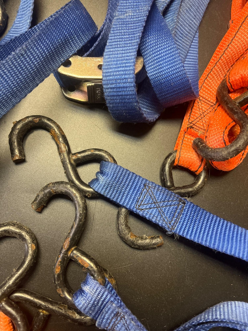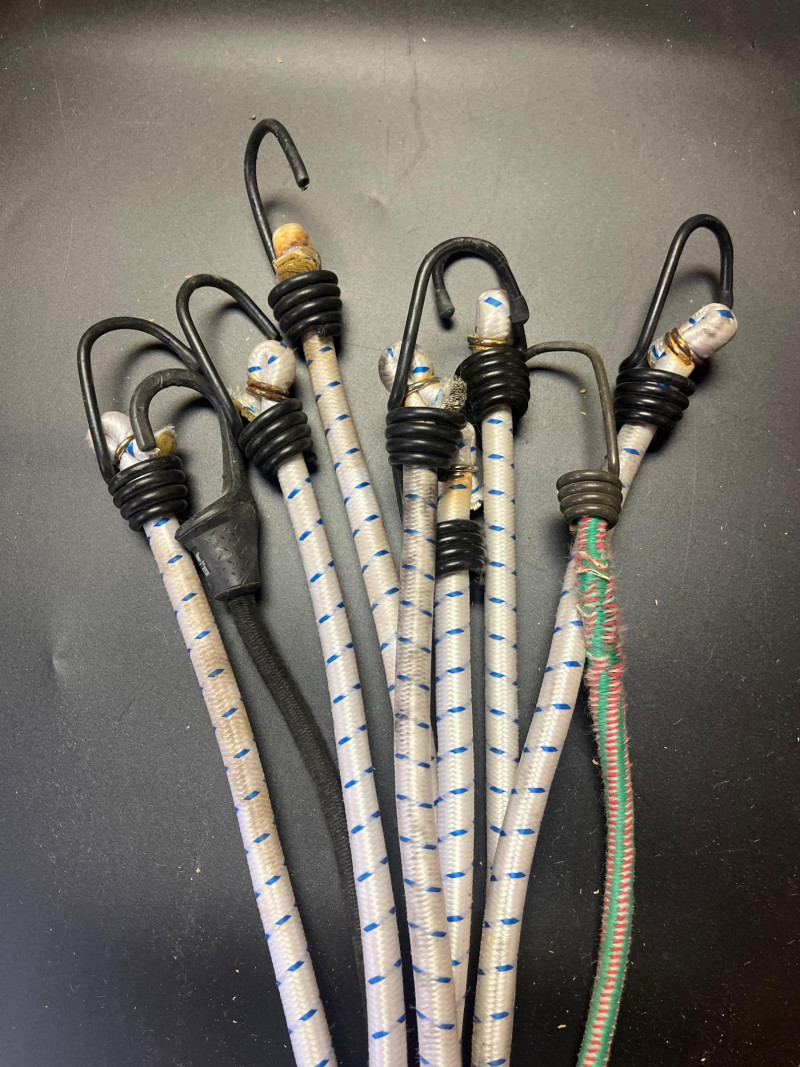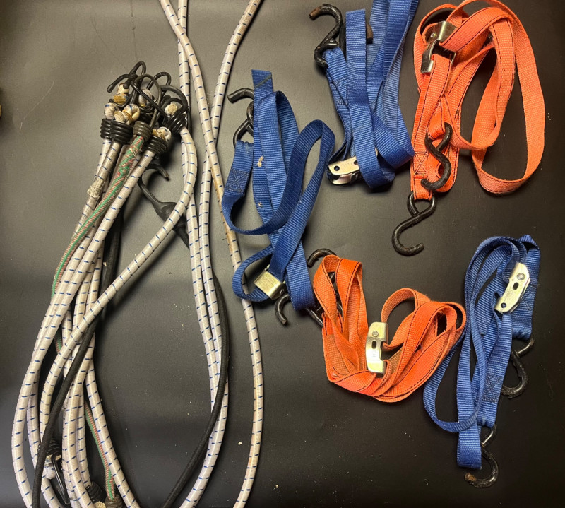 Five Cam Buckle Tie Downs and Seven Bungee Cords Lot includes 5 cam buckle tie downs and 7 bungee cords of various sizes.