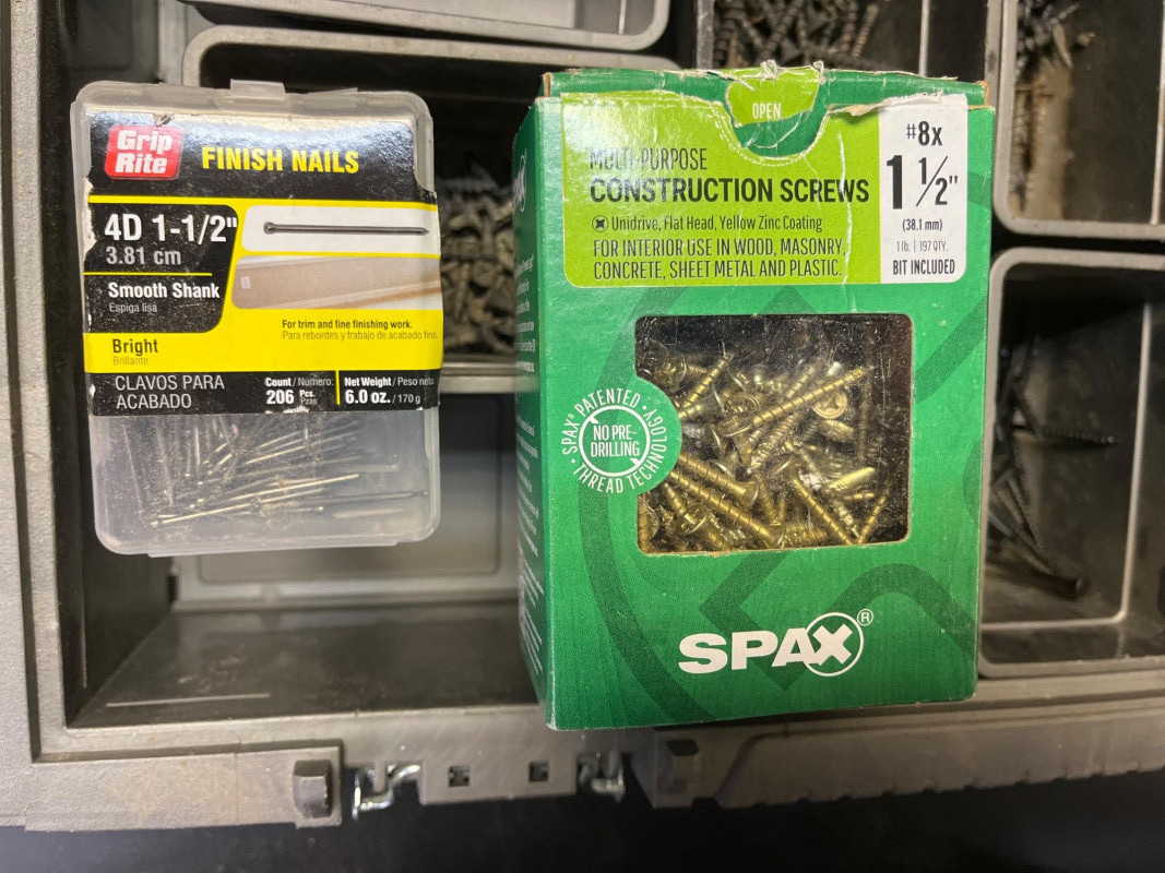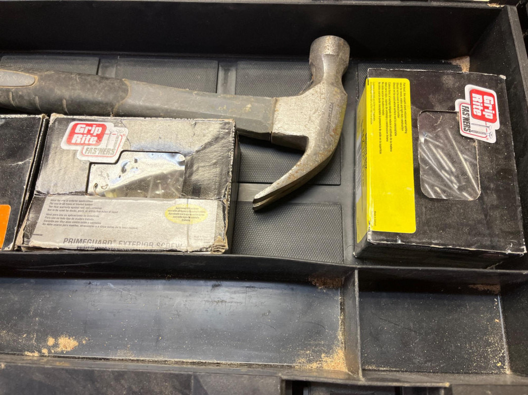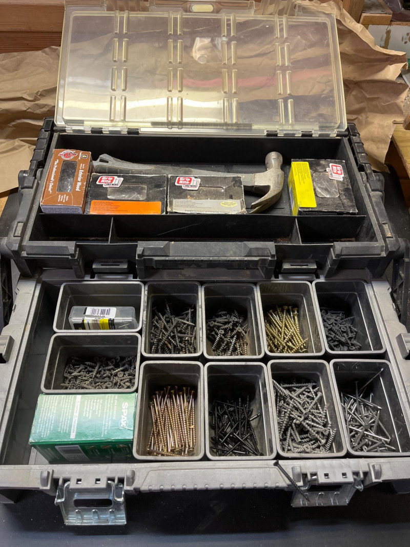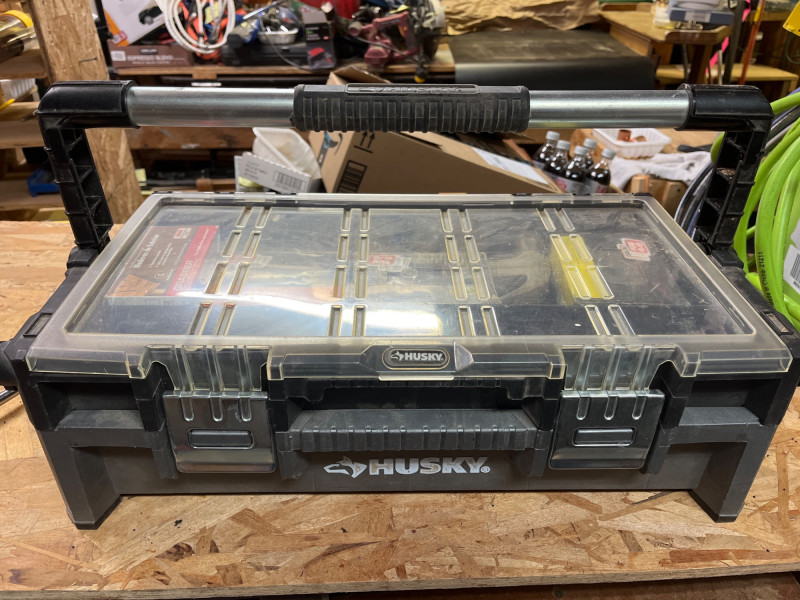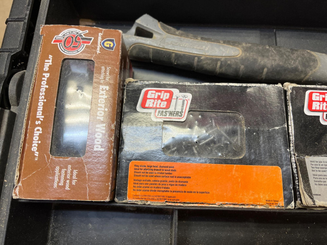 Husky Tool Box Full of New Nails and Screws of Various Sizes Lot includes all that is shown. Tool box in in good condition, all nails and screws are unused. Great to have around even if you don't do any regular building!