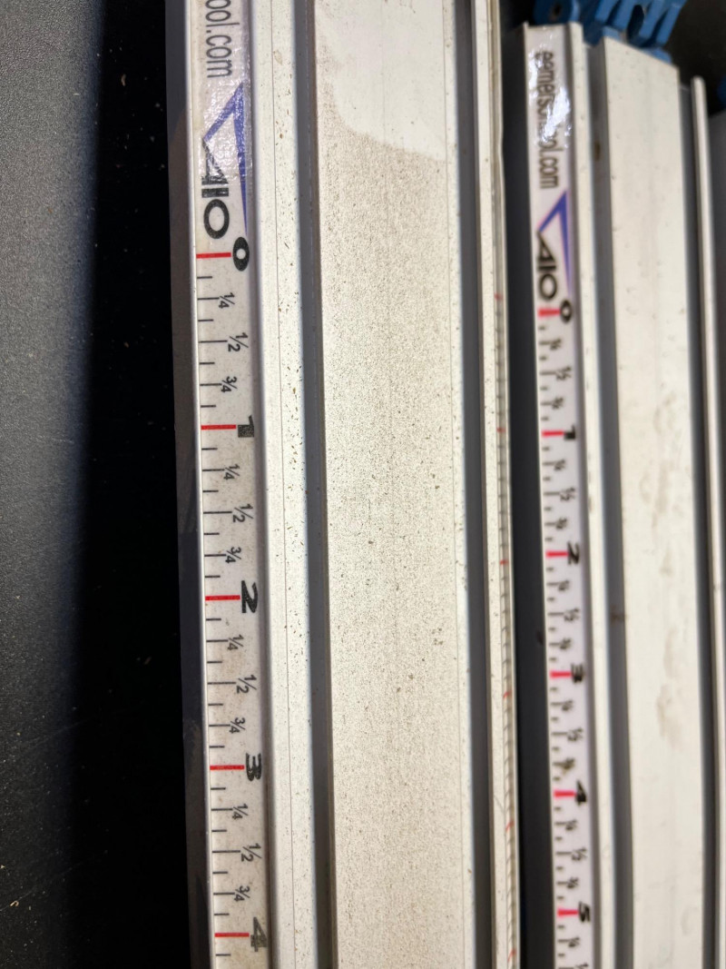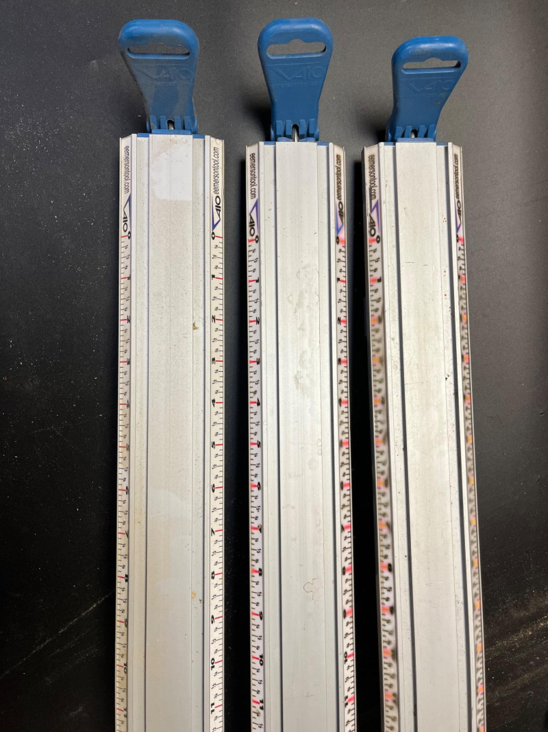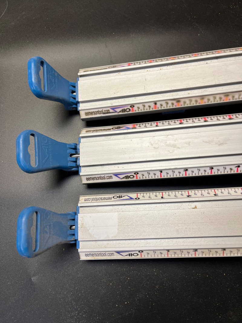 E. Emerson Clamp Tools Three Sizes, 27", 39", and 53" These are versatile, heavy-duty straight edge clamping guides used by woodworkers for making accurate cuts with saws and routers, functioning as a fence, guide, and clamp all in one, available in various sizes for DIY and professional tasks. They feature a fixed jaw, a sliding jaw, and a lever system to create strong clamping force (up to 825 lbs or more) for straight cuts, glue-ups, and as drill press fences. Note that on the 27" clamp that the measurement reading ticks on the sides looks to have water damage and is a little harder to read.