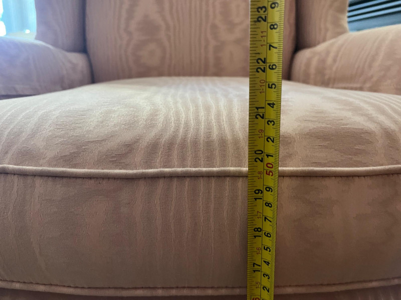 Pair of Matching Pink Wingback Chairs These are in very good condition with no rips, tears, or stains that I could find. They're comfy too! Backs measure 46" high, width is 32".