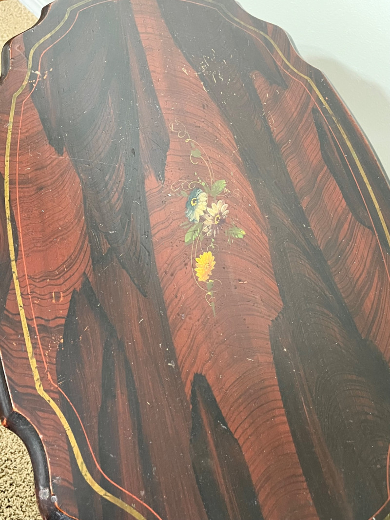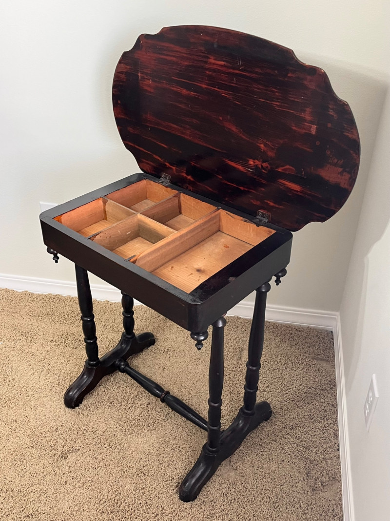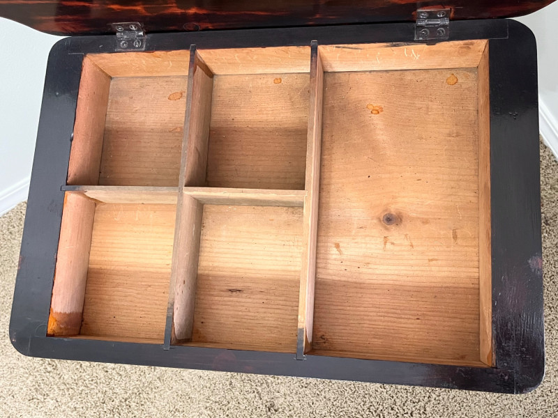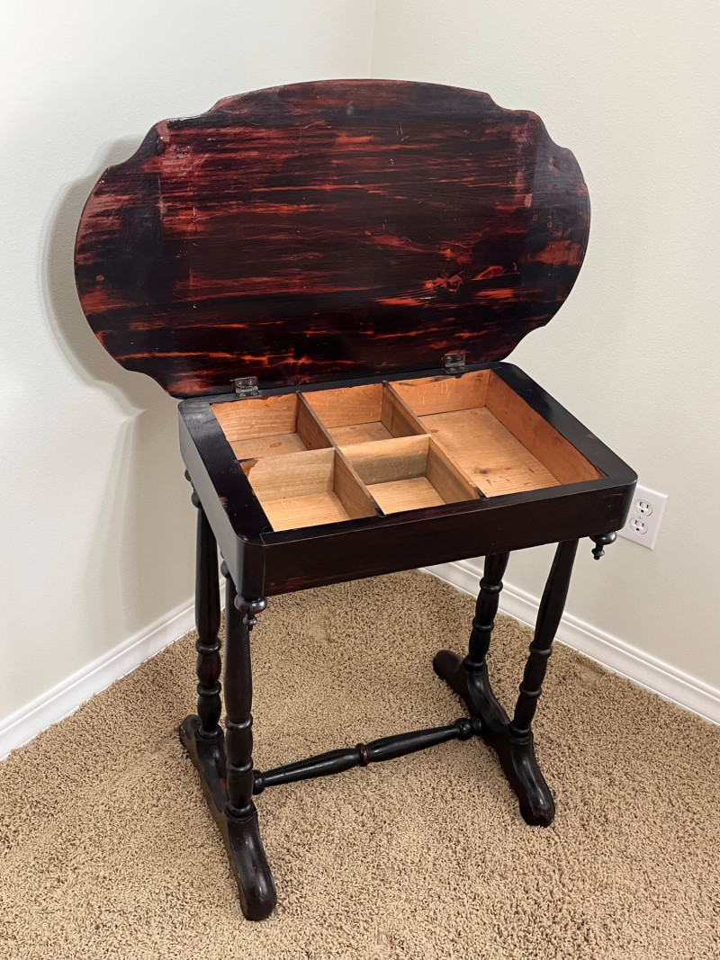 Vintage Spinet Legged Lamp Table with Internal Compartment This table has a lovely dark finish and an elegant painted flower on the top. What makes this a unique piece is the "secret compartment" that could come in handy to keep valuables out of sight. The top does have some scratches which I try to show closeup in photos. Measurements: 26 1/2" tall, 28 3/4" long, and 17" deep.