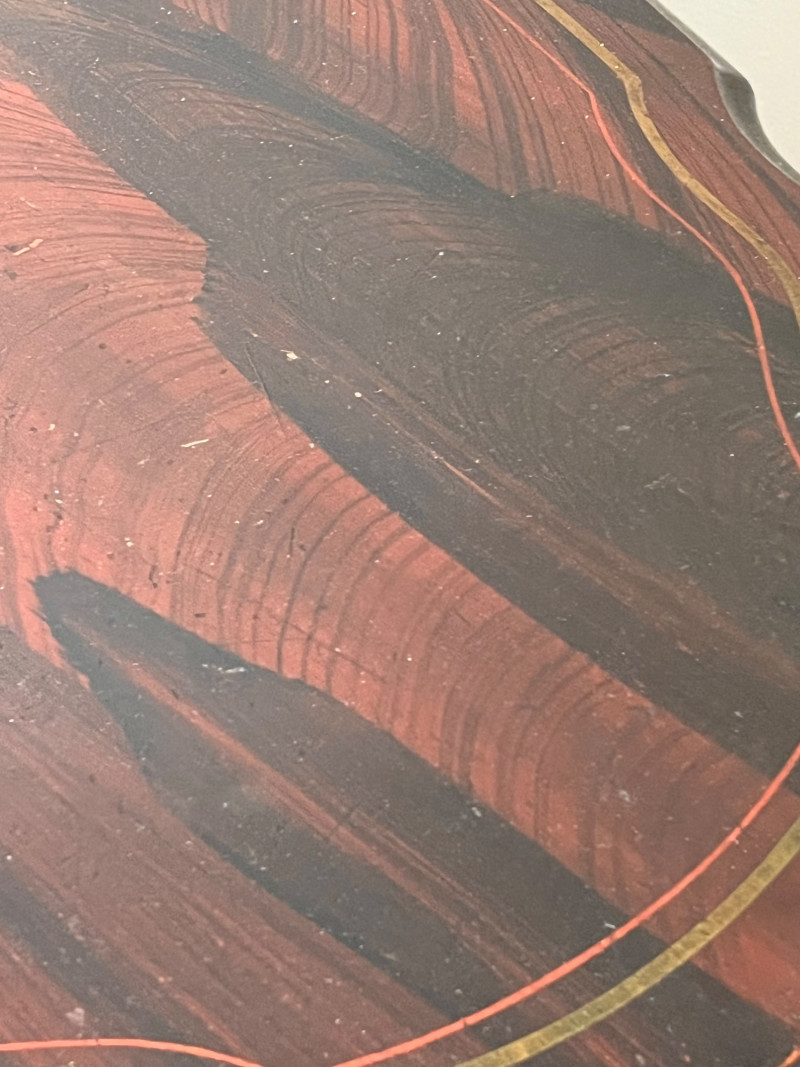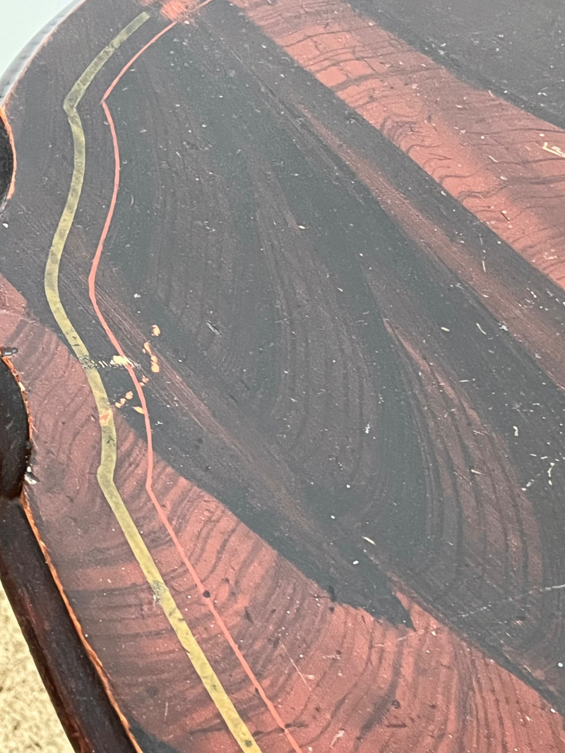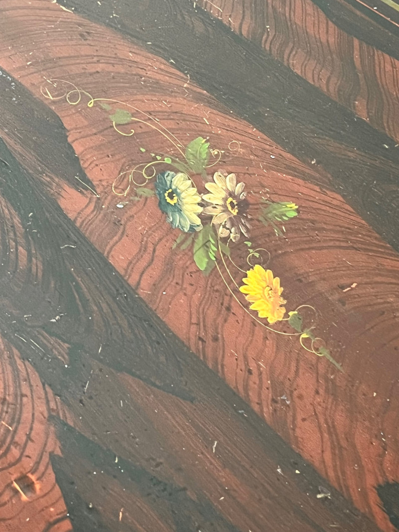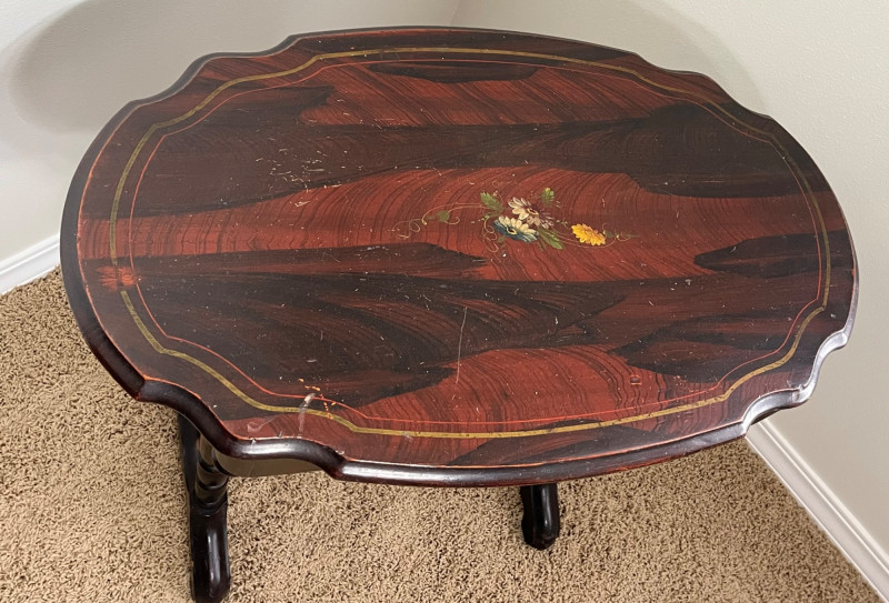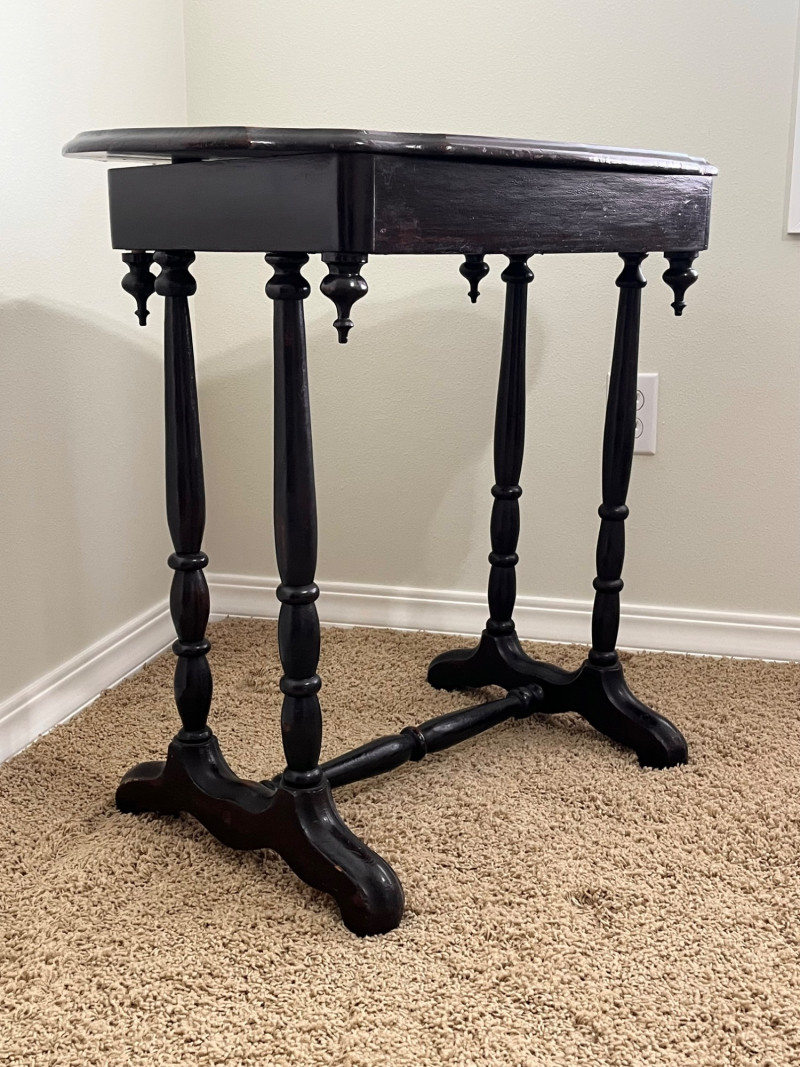 Vintage Spinet Legged Lamp Table with Internal Compartment This table has a lovely dark finish and an elegant painted flower on the top. What makes this a unique piece is the "secret compartment" that could come in handy to keep valuables out of sight. The top does have some scratches which I try to show closeup in photos. Measurements: 26 1/2" tall, 28 3/4" long, and 17" deep.