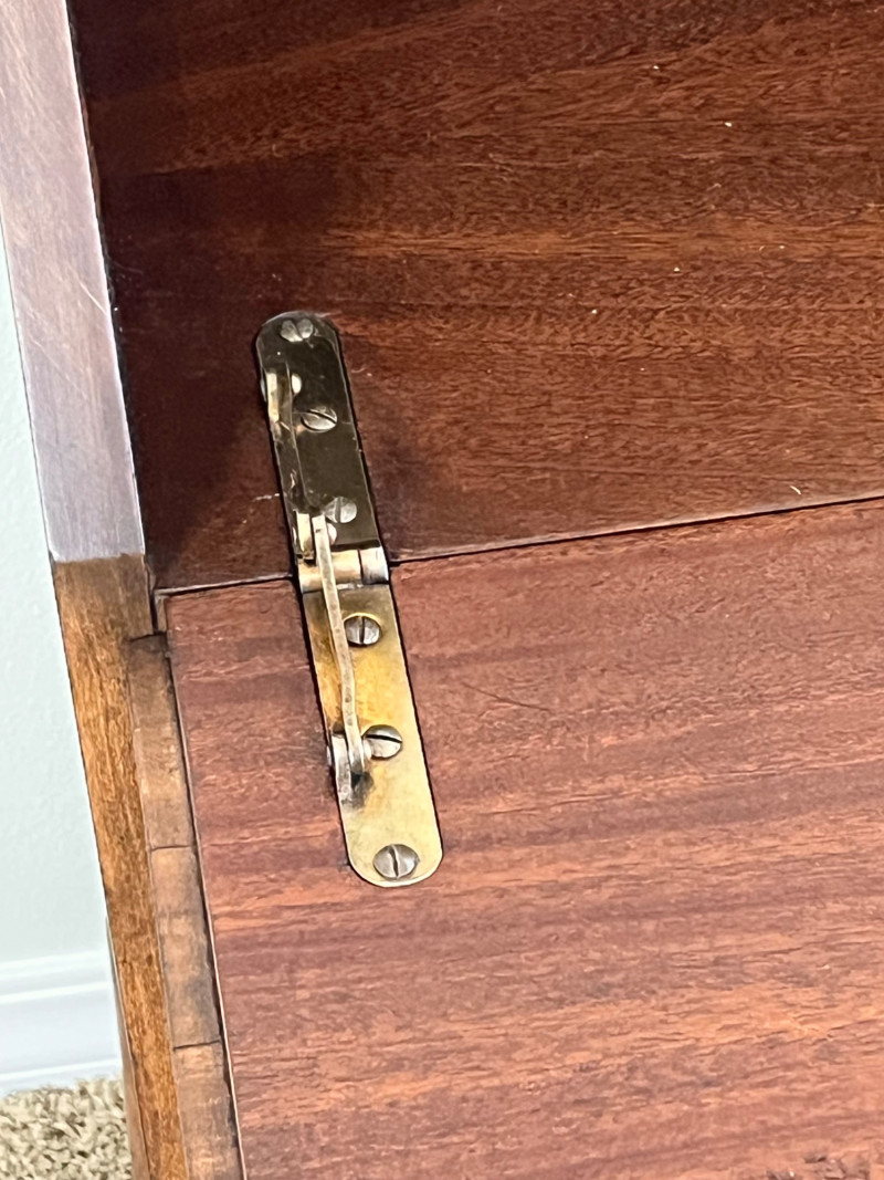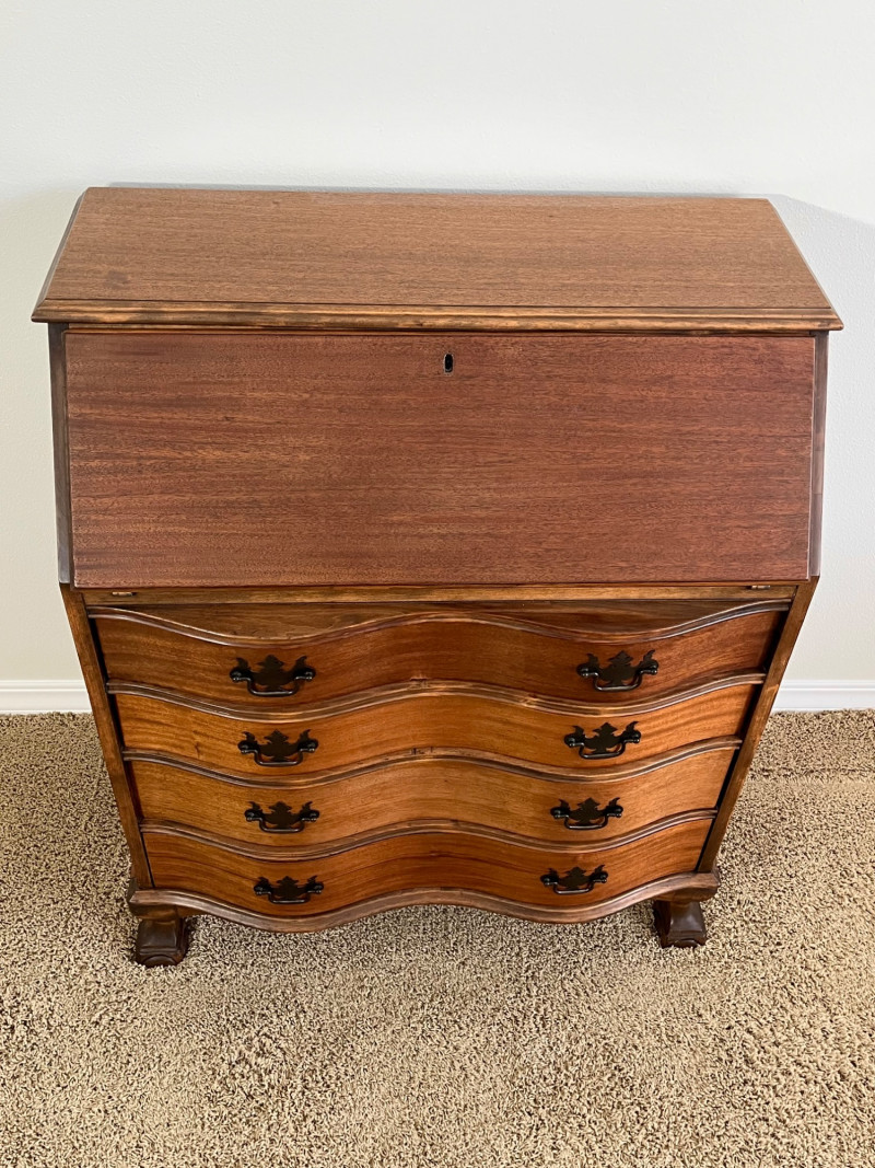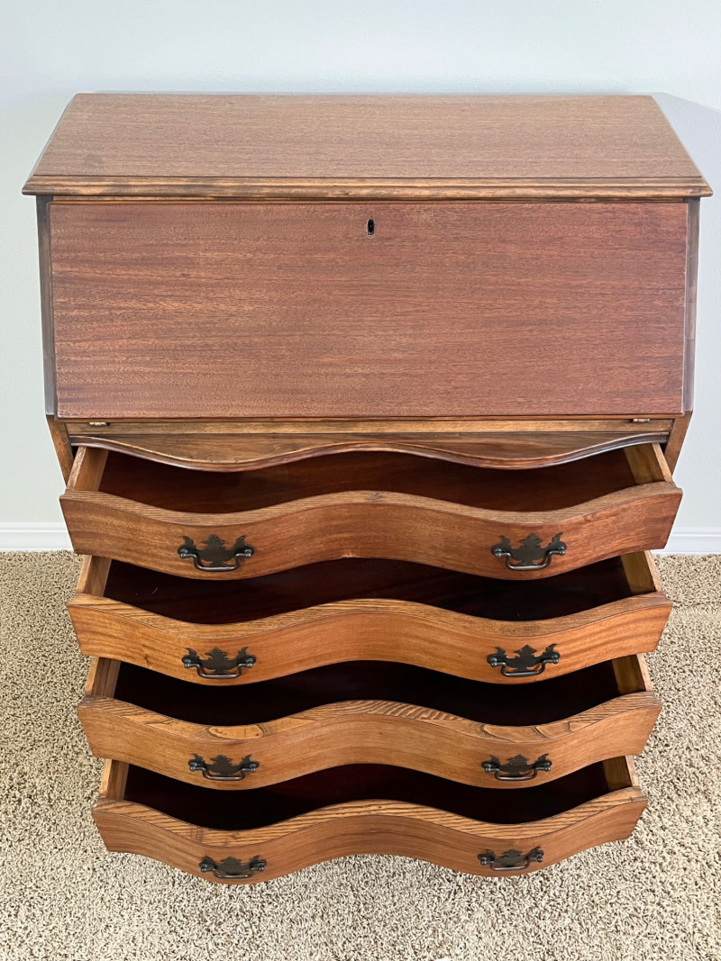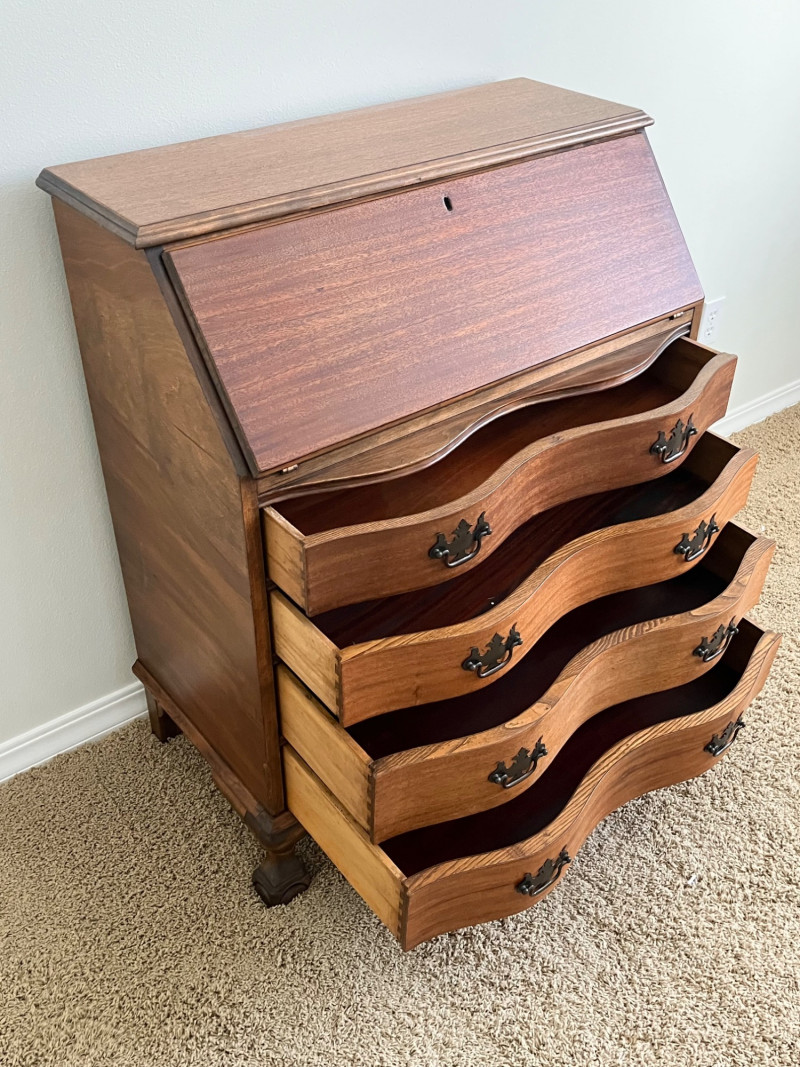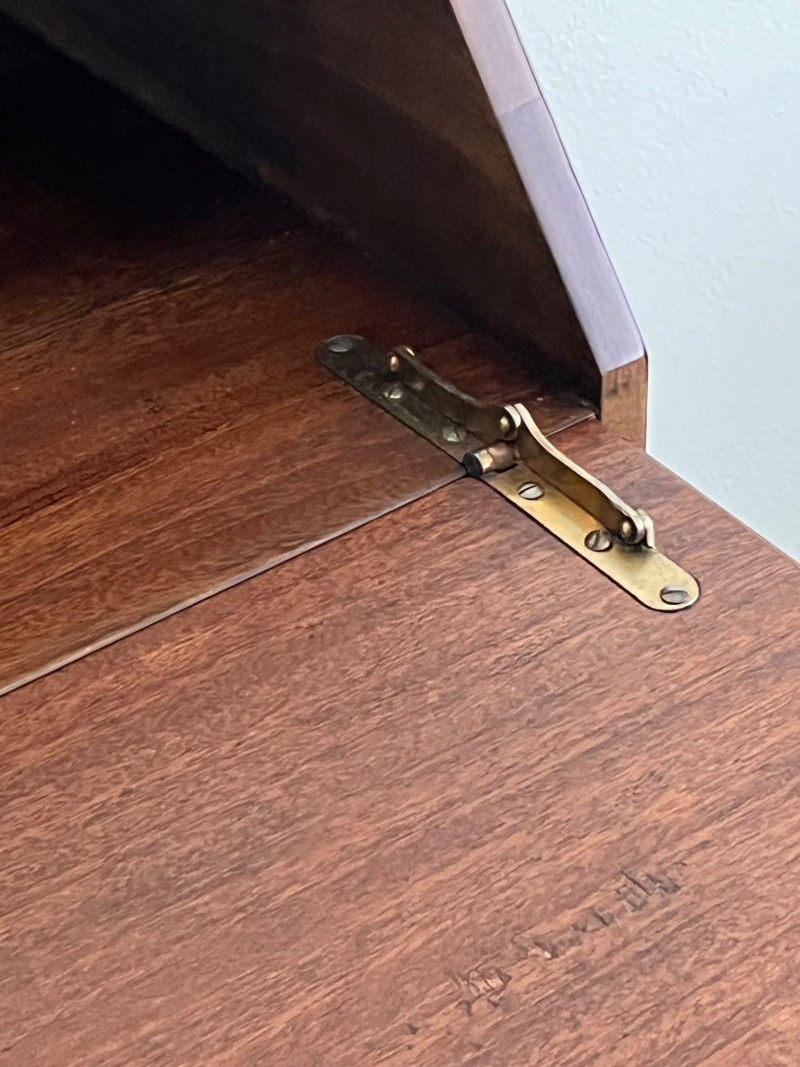 This piece is solid wood and in good antique condition. I am uncertain if the lock works as the key is missing.The finish and hardware all looks to be original. Measurements: The writing surface is 28 1/2", top is 38", and the piece overall is 30" wide.