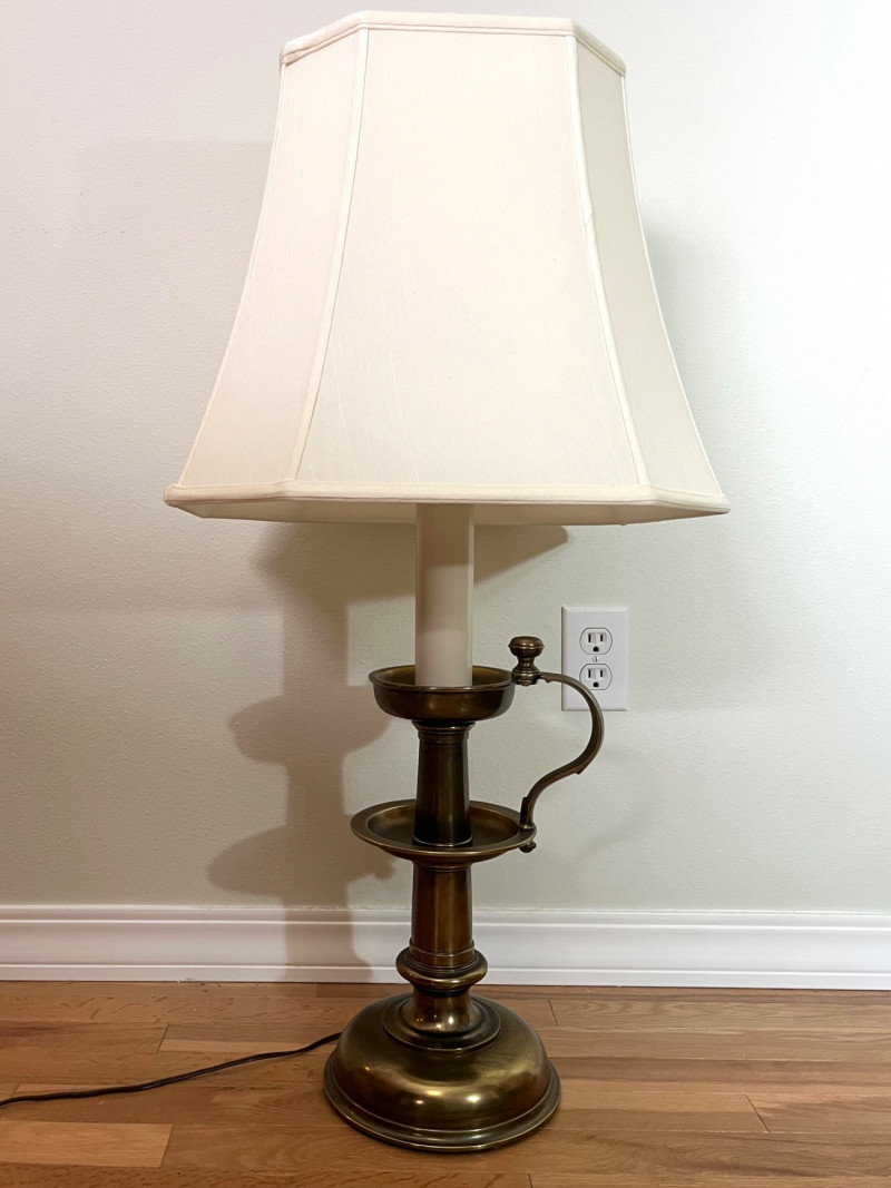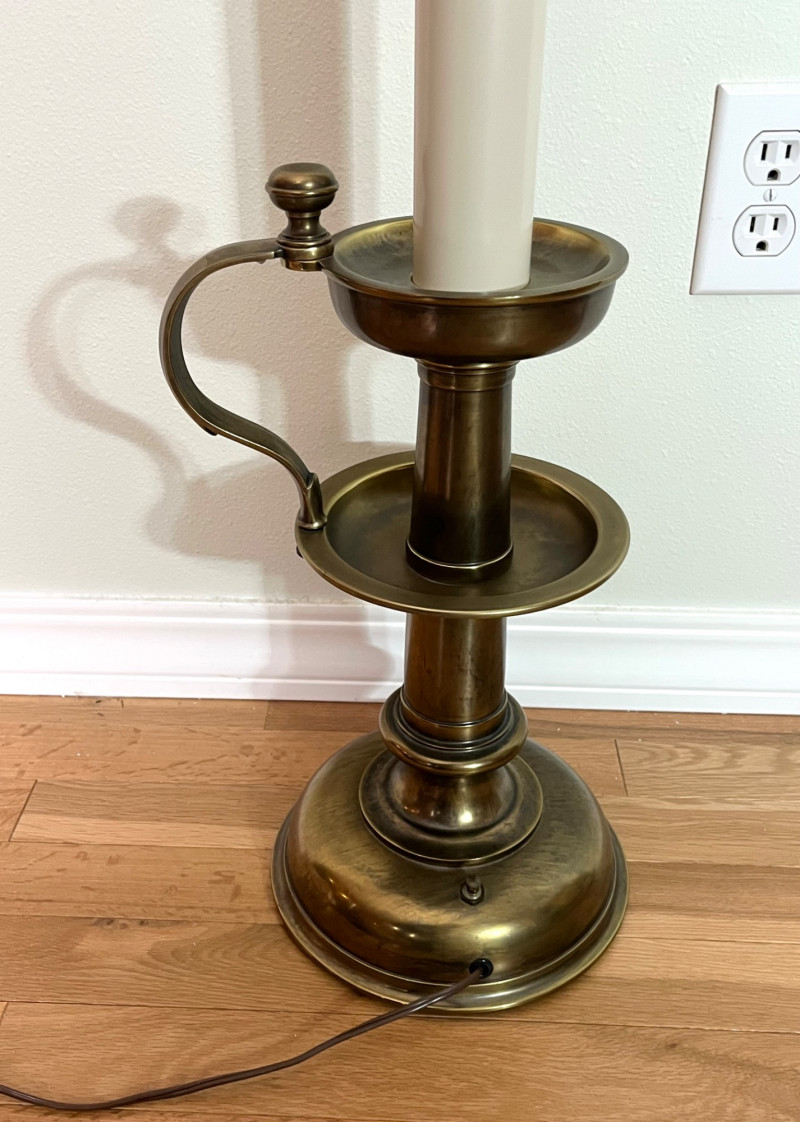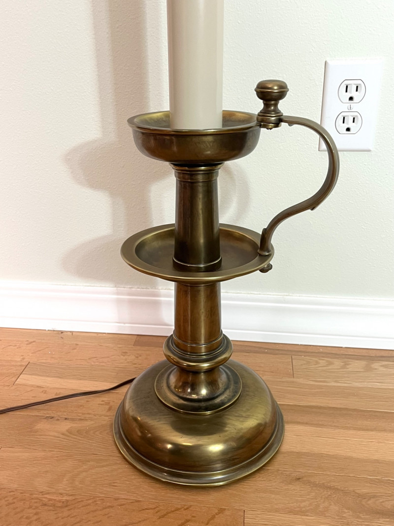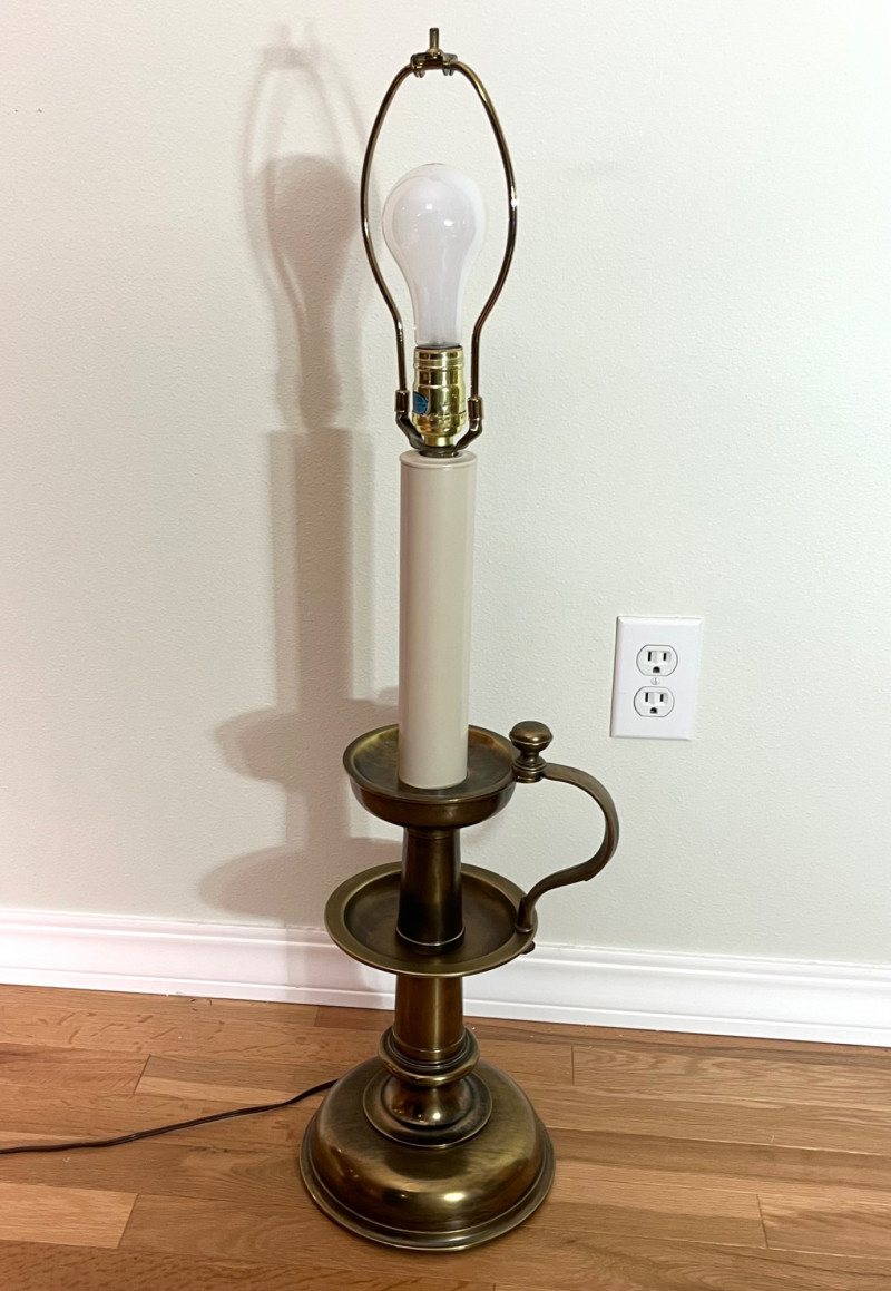 Stiffel Candlestick Style 33" Tall 3 Way Brass Lamp This lamp is in good, working order. Measures 33" tall to top of harp. Shade is 16" wide.