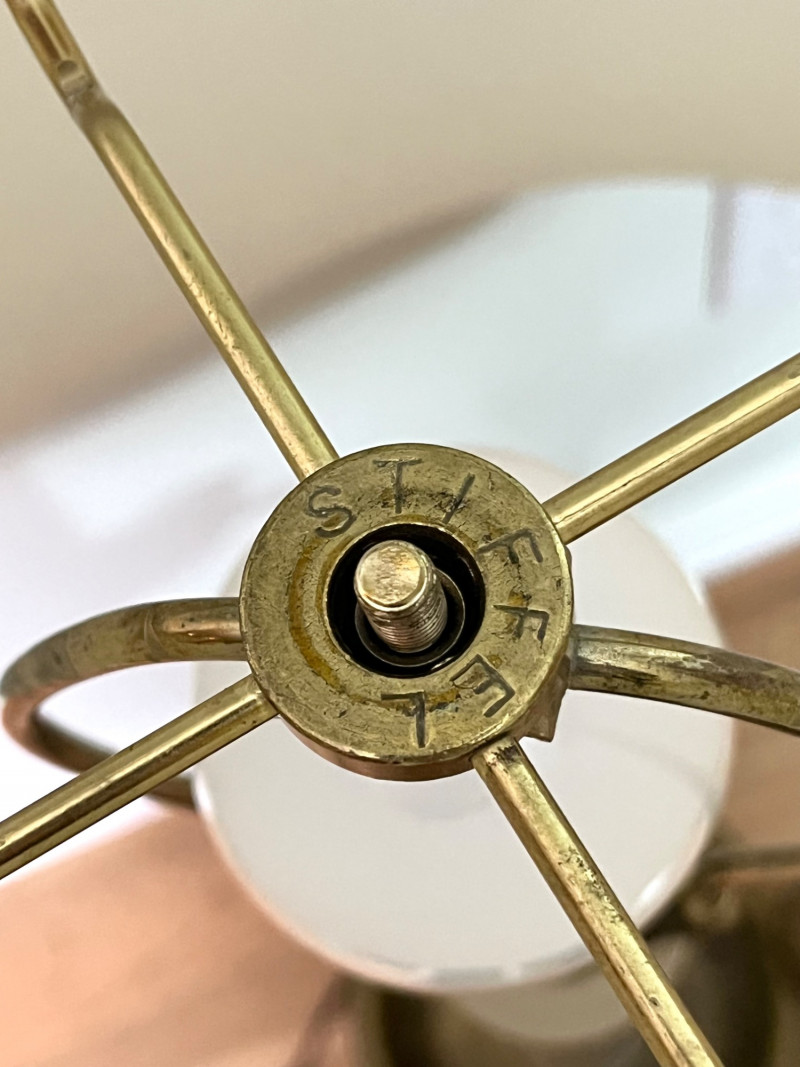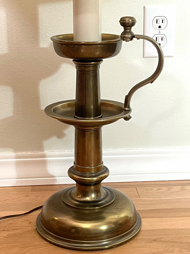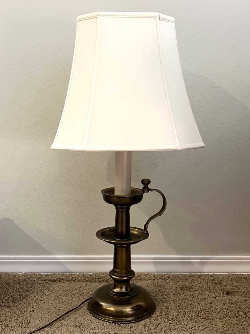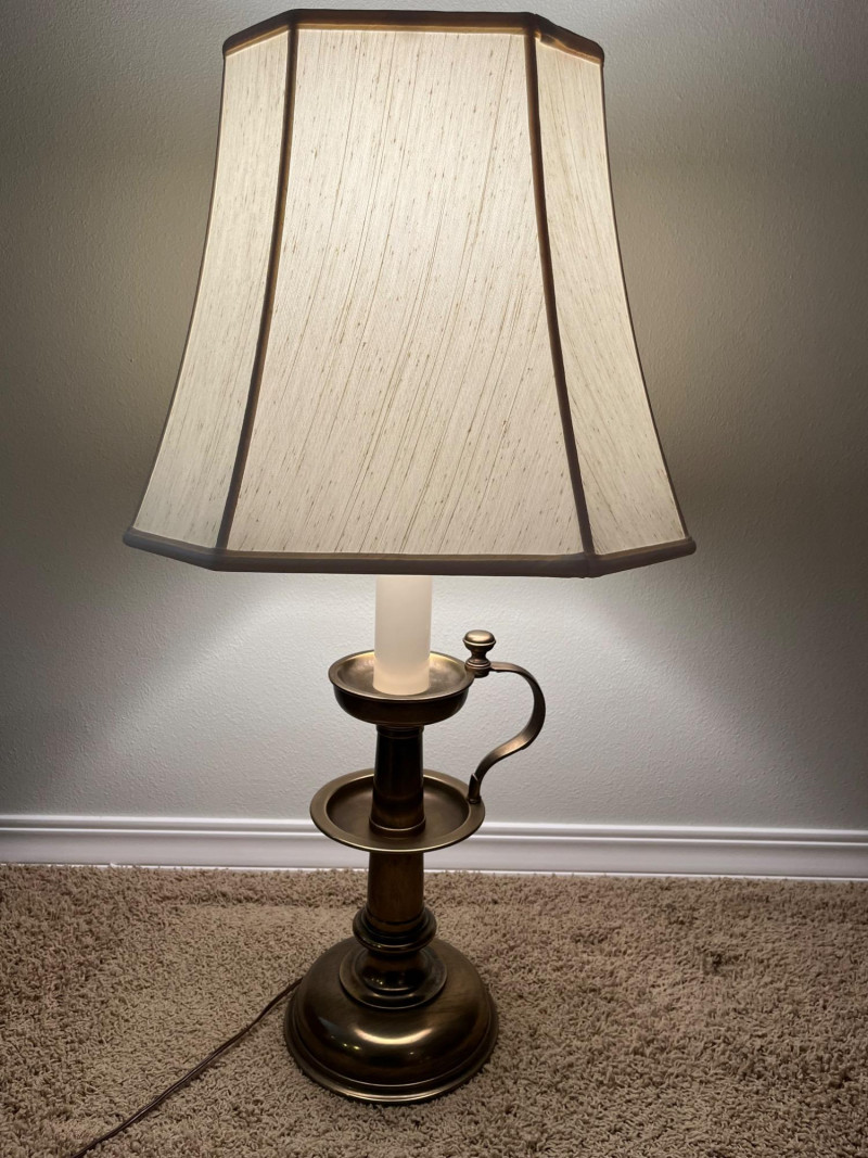 Stiffel Candlestick Style 33" Tall 3 Way Brass Lamp This lamp is in good, working order. Measures 33" tall to top of harp. Shade is 16" wide.