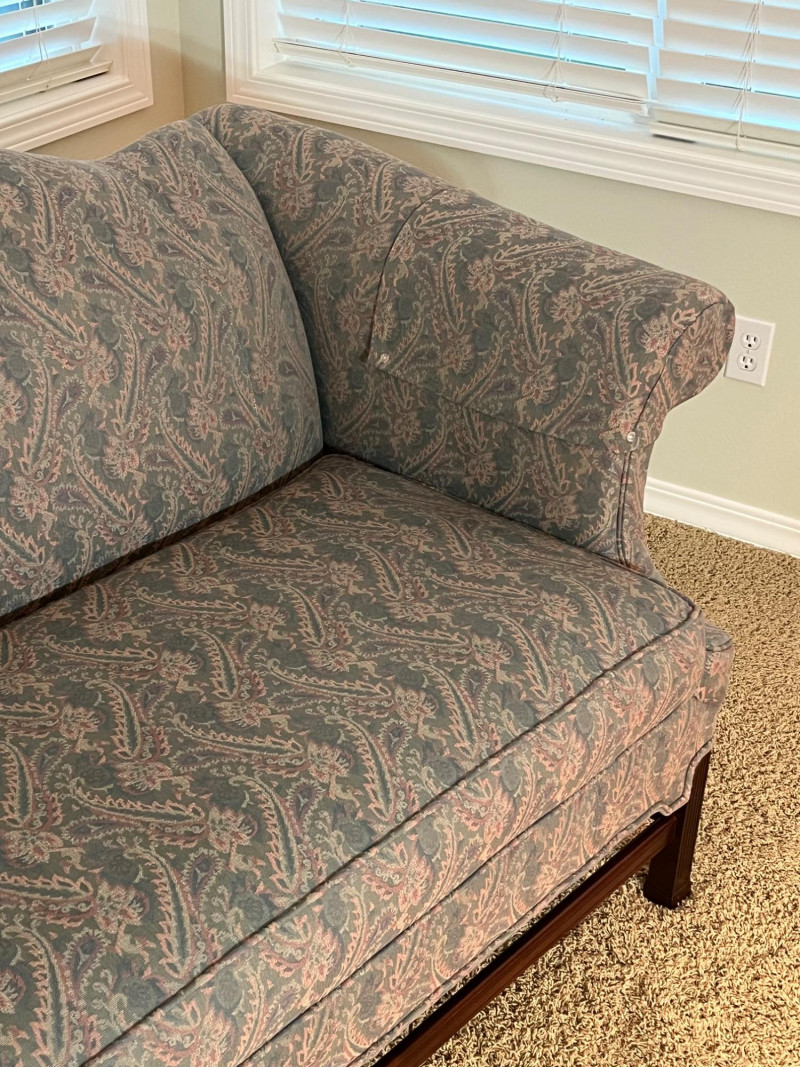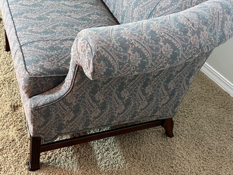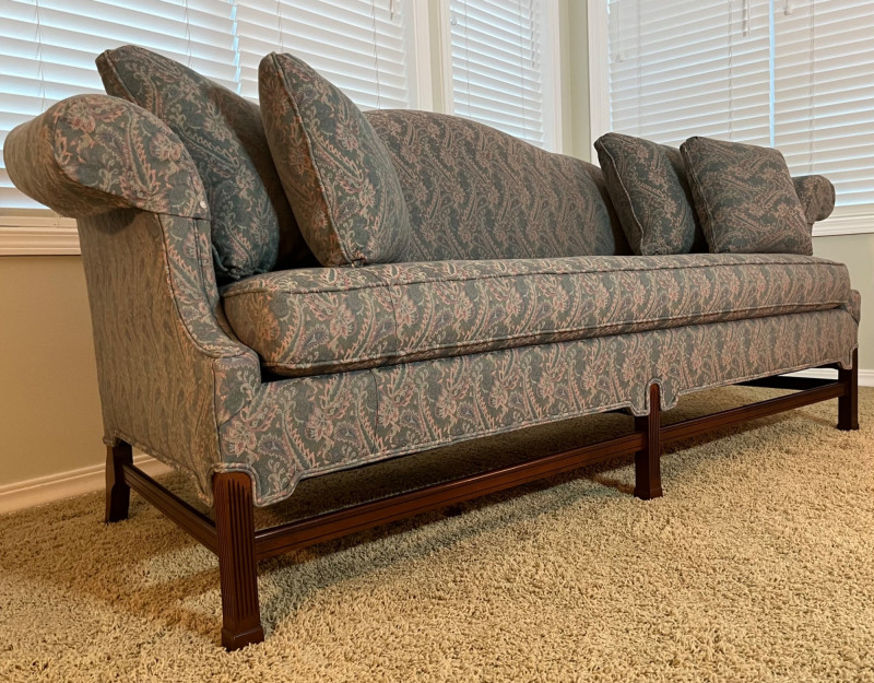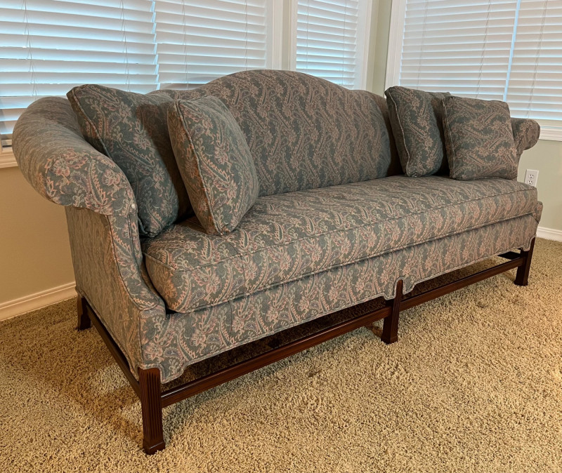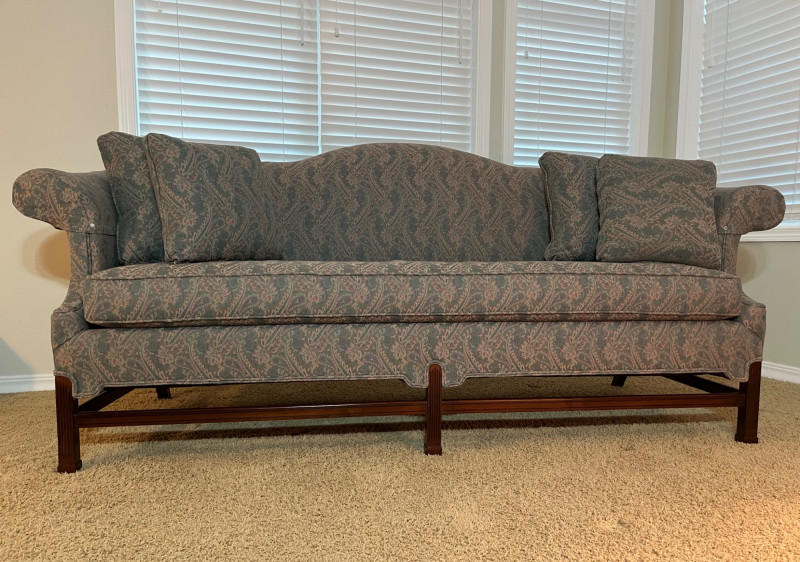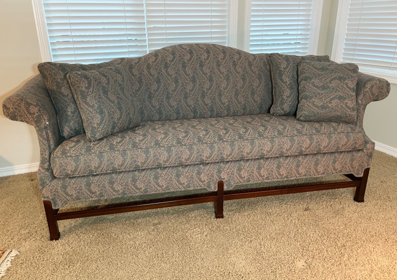 Chippendale Styled Camel-Back Rolled Arm Couch with Matching Pillows This couch looks to be in very good condition with minimal wear and no fading. Measurements: 7' long, 34" deep (front-to-back), 37" tall at back,