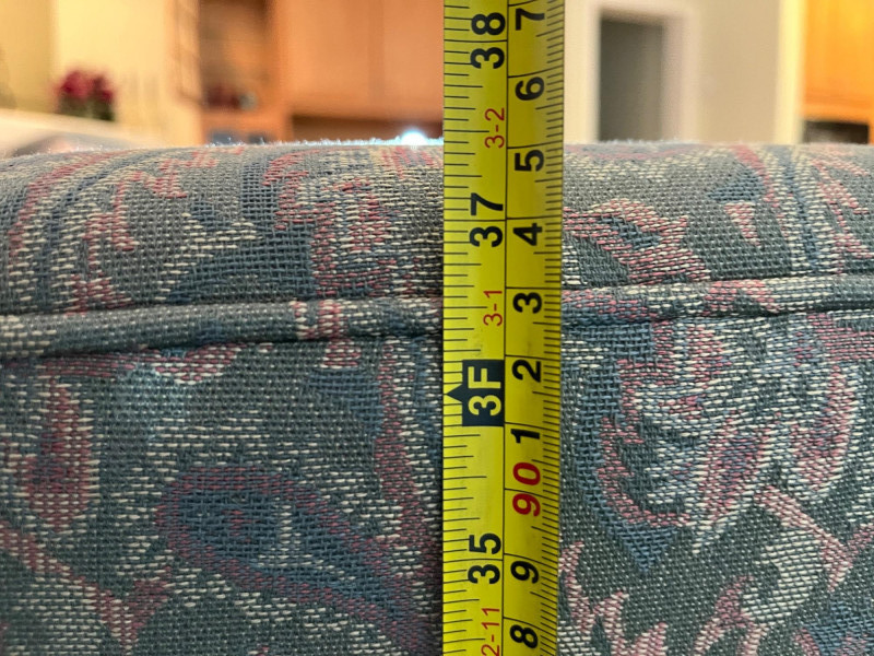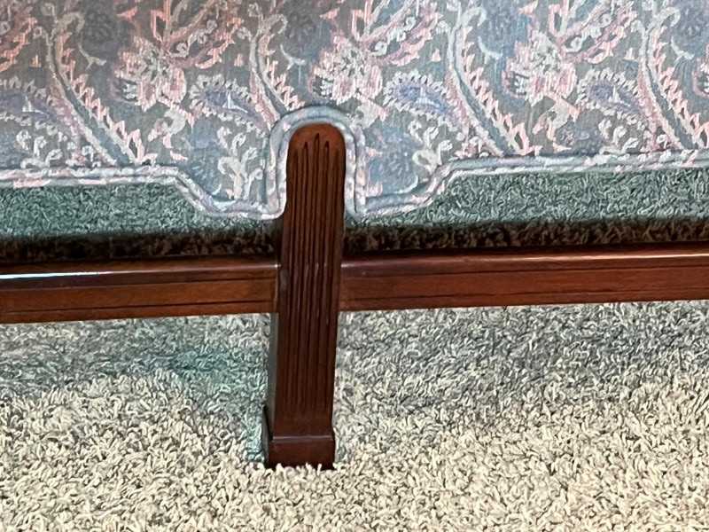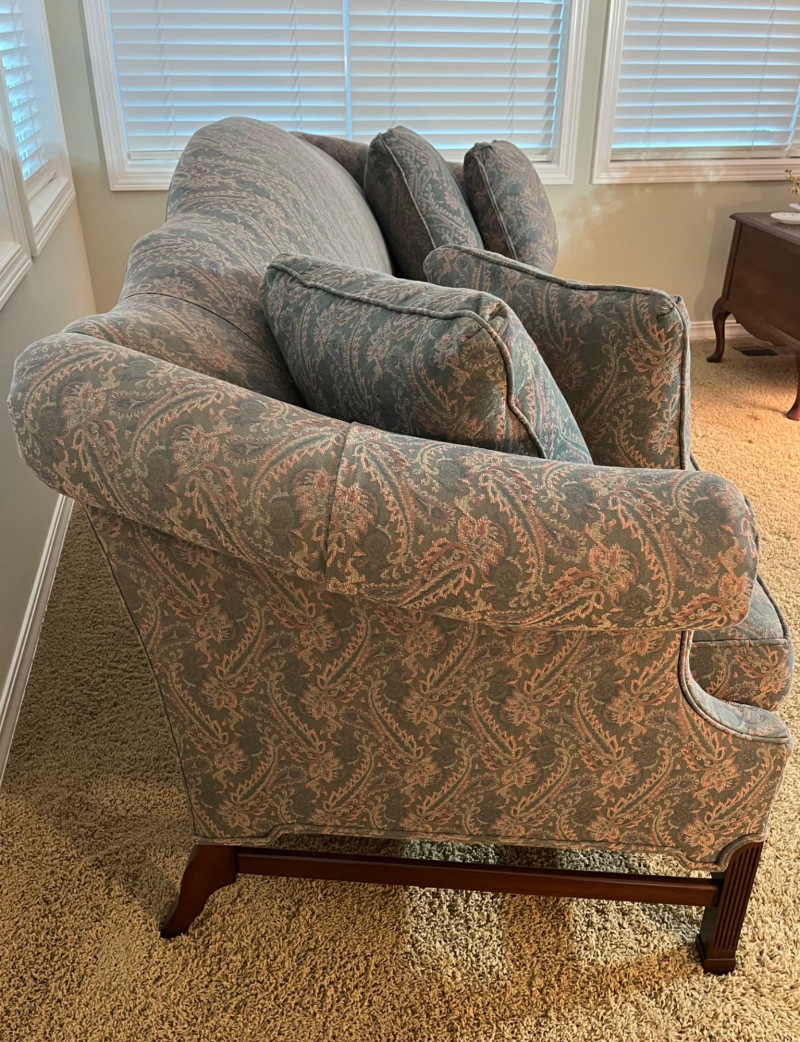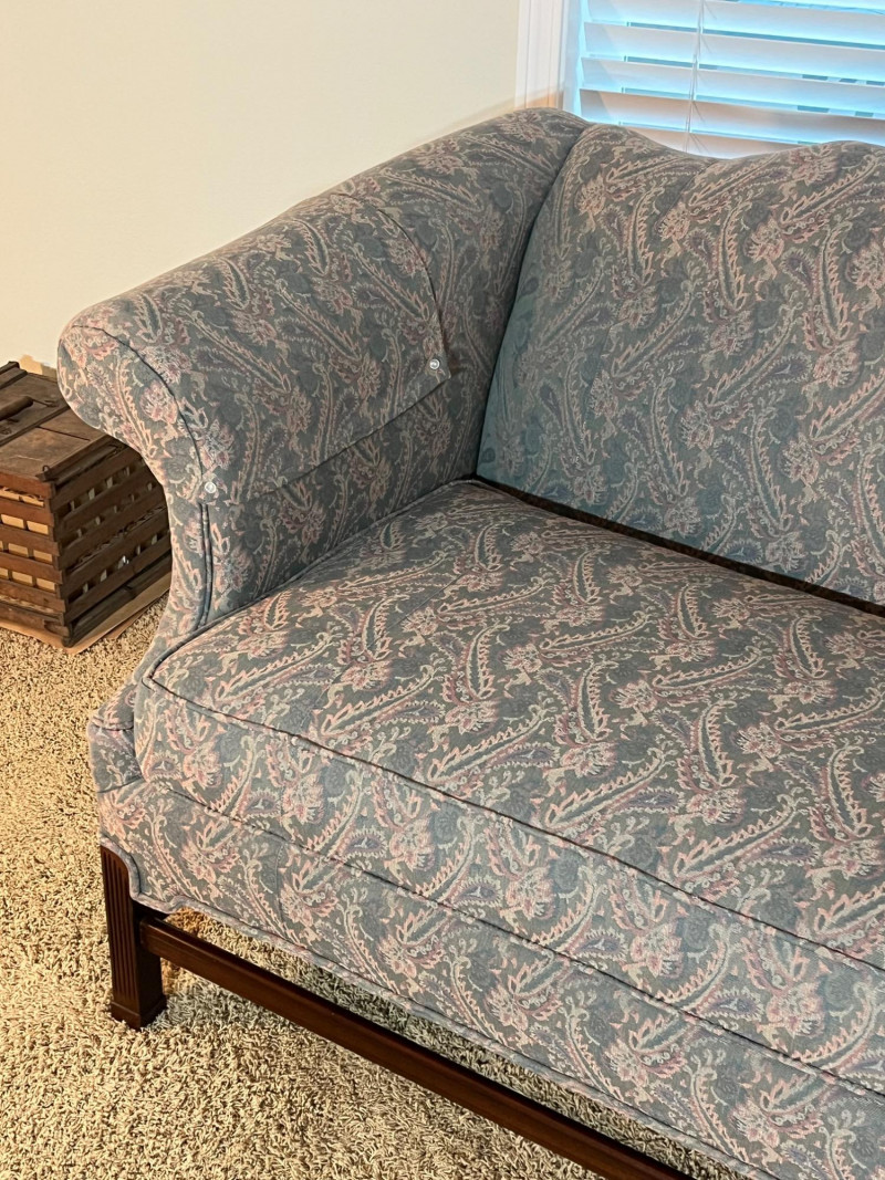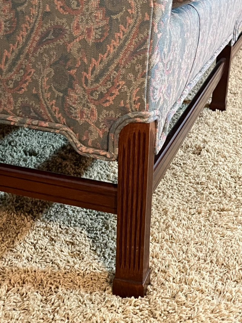 Chippendale Styled Camel-Back Rolled Arm Couch with Matching Pillows This couch looks to be in very good condition with minimal wear and no fading. Measurements: 7' long, 34" deep (front-to-back), 37" tall at back,